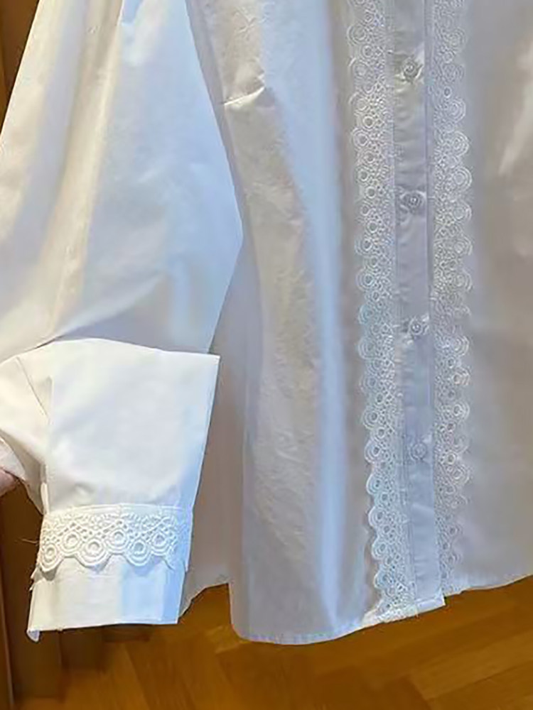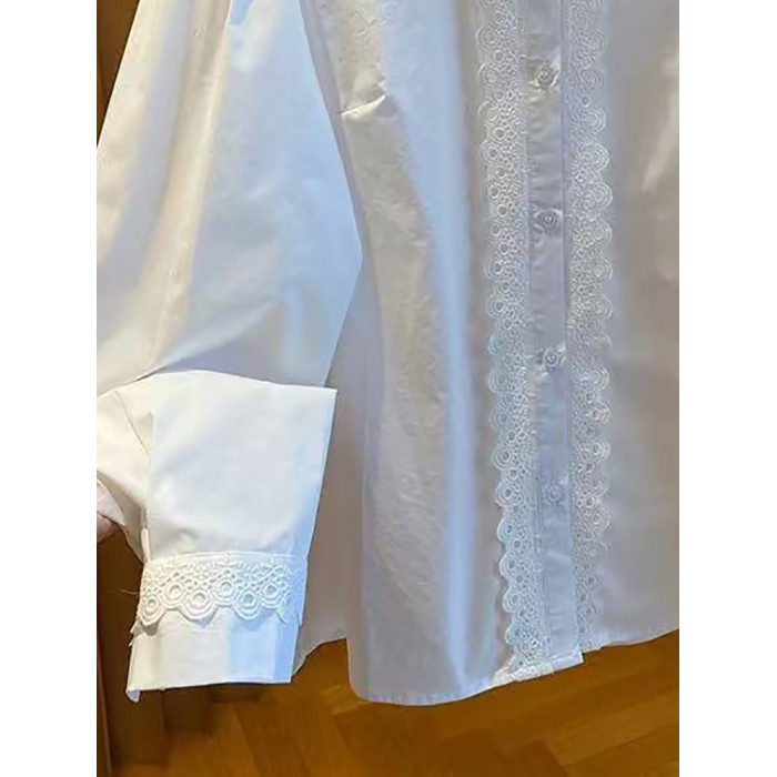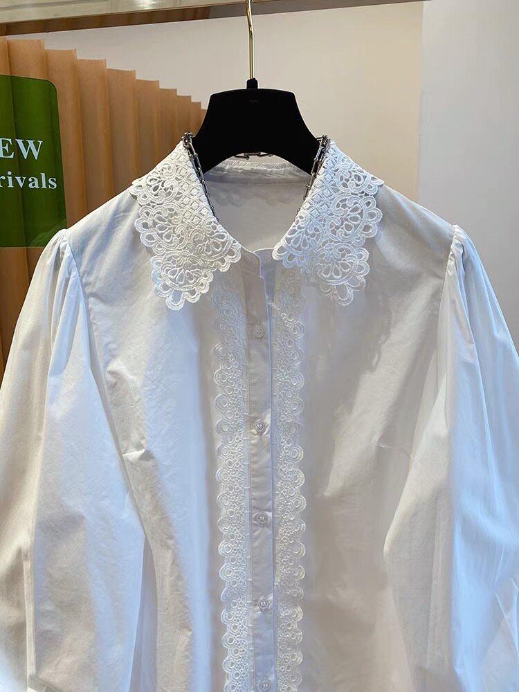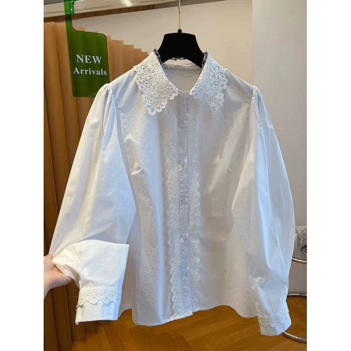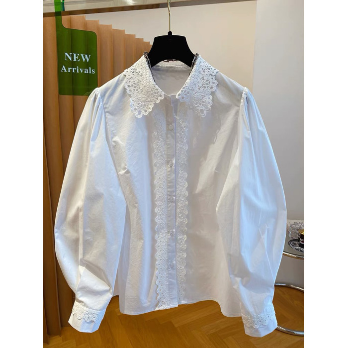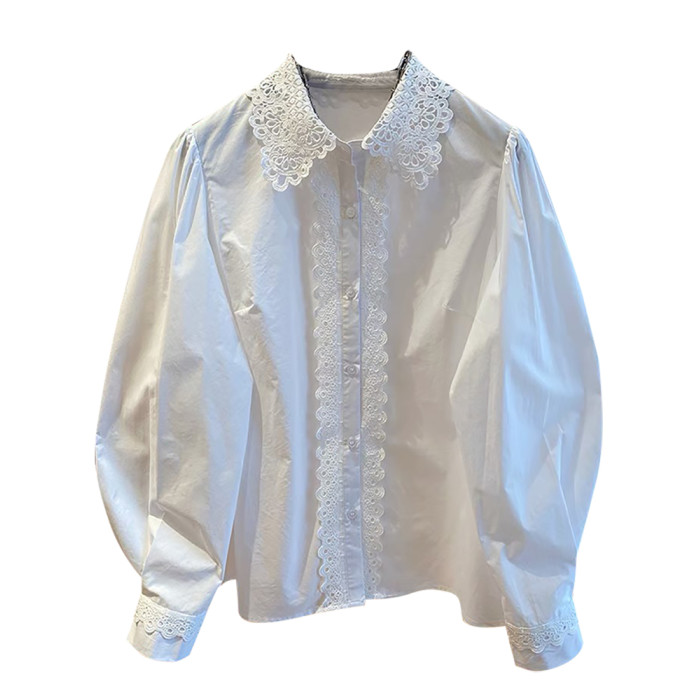 自畱款推薦~法式蕾絲花邊拼接繙領襯衫女2025春新款寬鬆白色上衣