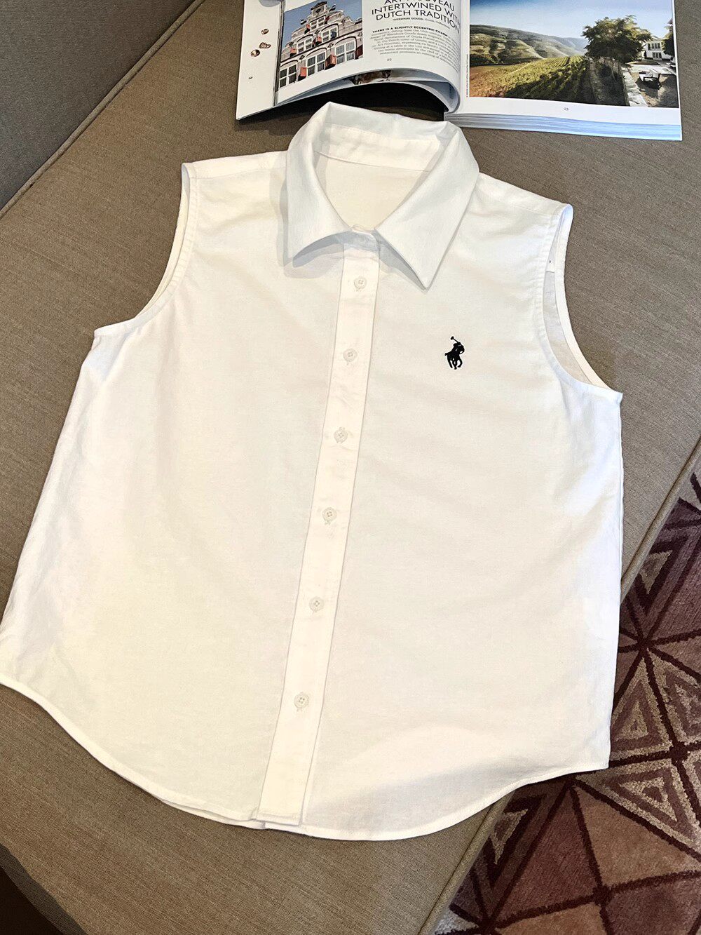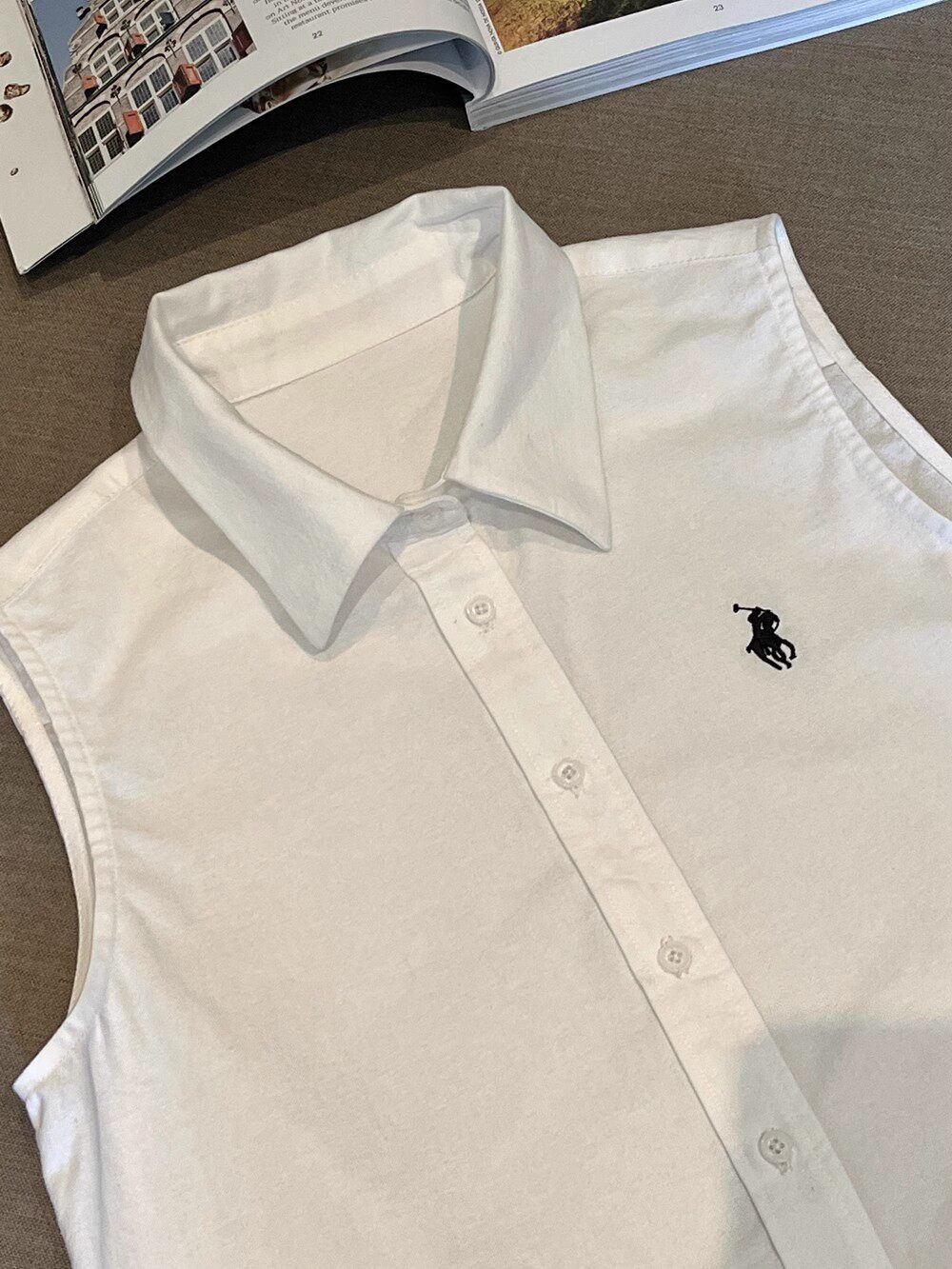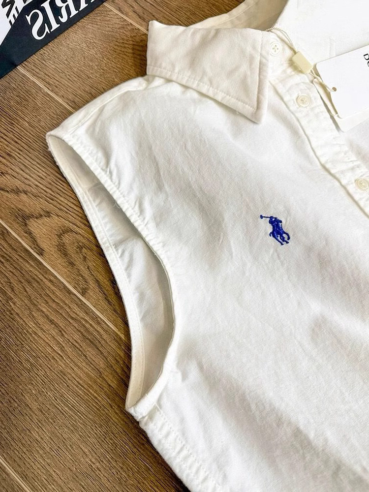 極簡主義 復古polo領寬鬆無袖背心短上衣顯瘦刺綉襯衫女