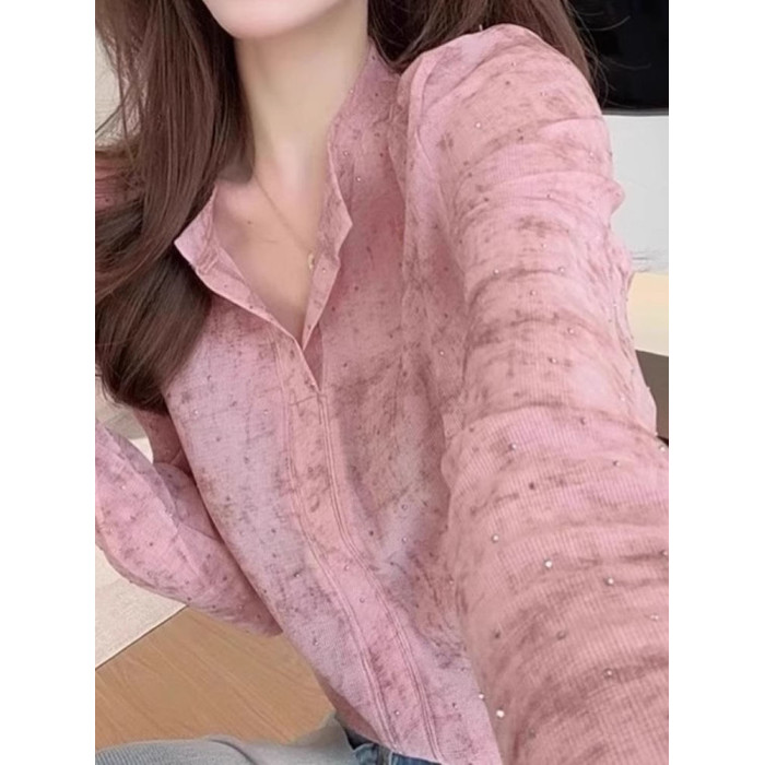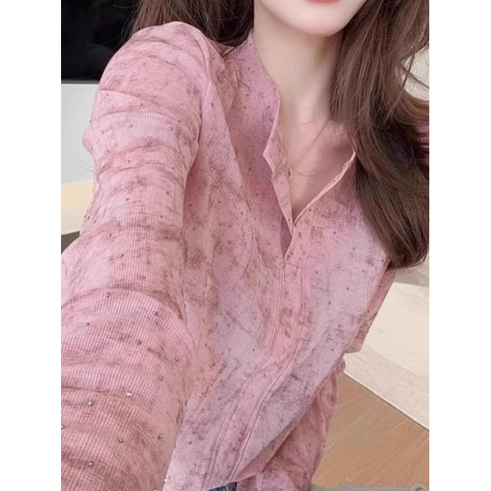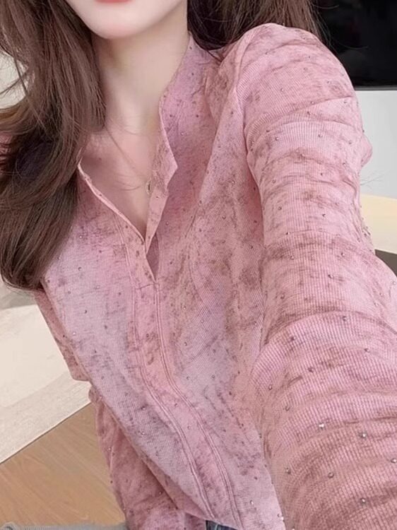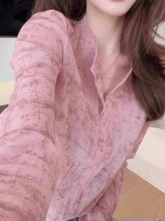 歐貨粉色暈染燙鑽T恤女2026新款爆款洋氣設計感時尚顯瘦長袖上衣