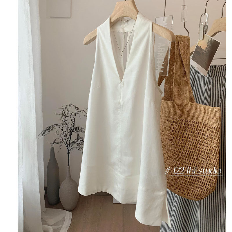 渠道貨!白色無袖上衣女夏季簡潔大方時尚感瞬間拉滿V領亞麻掛脖