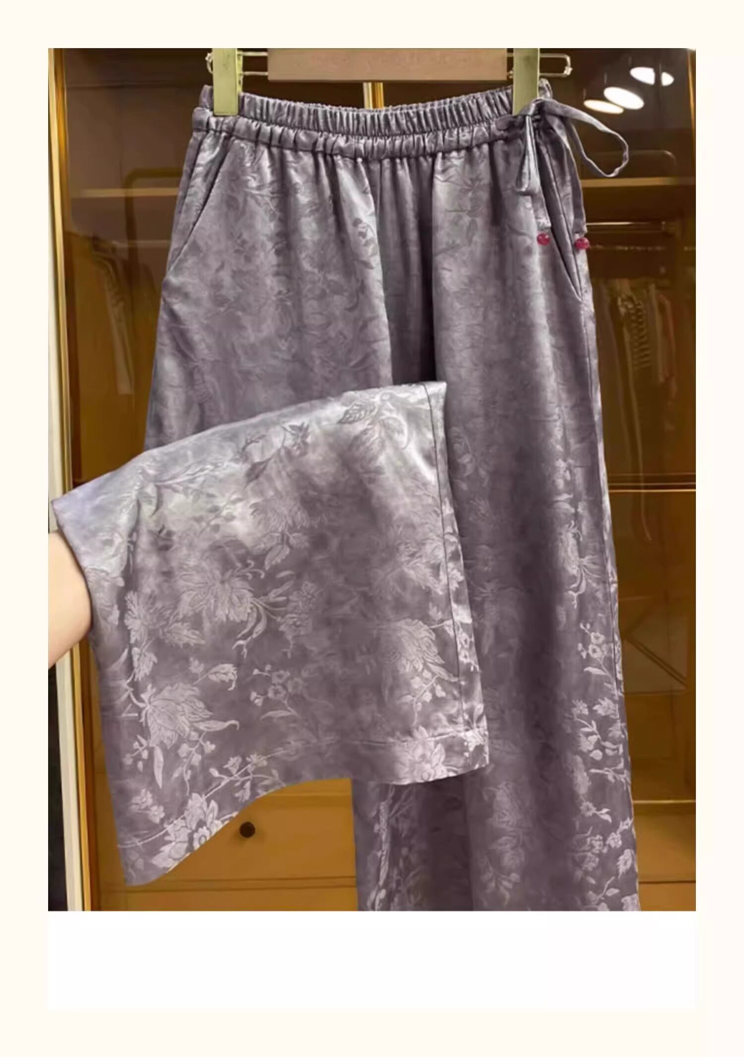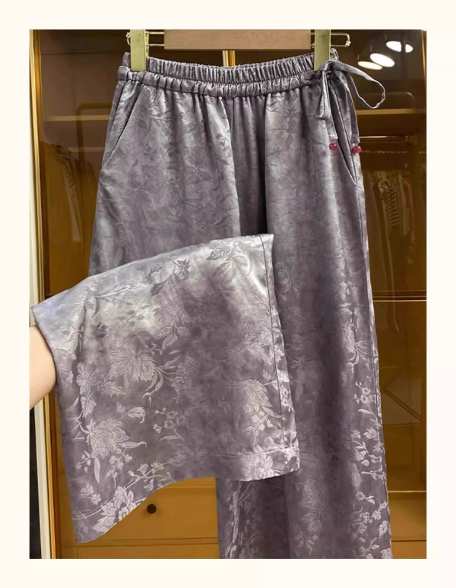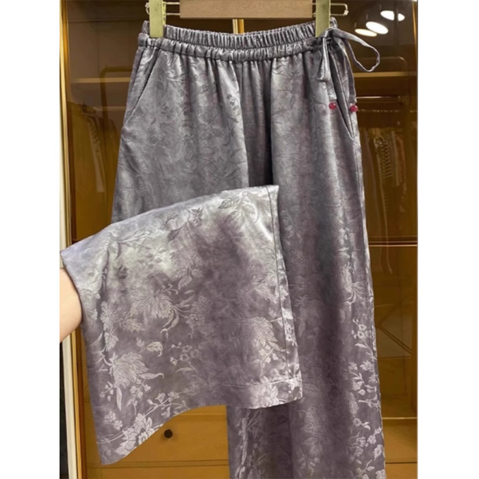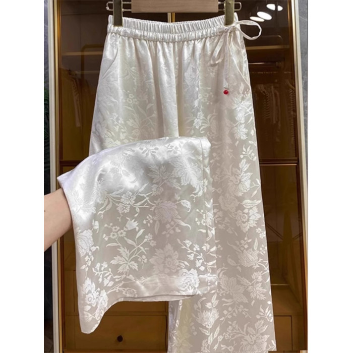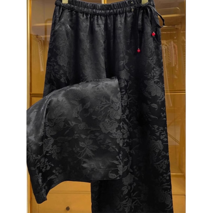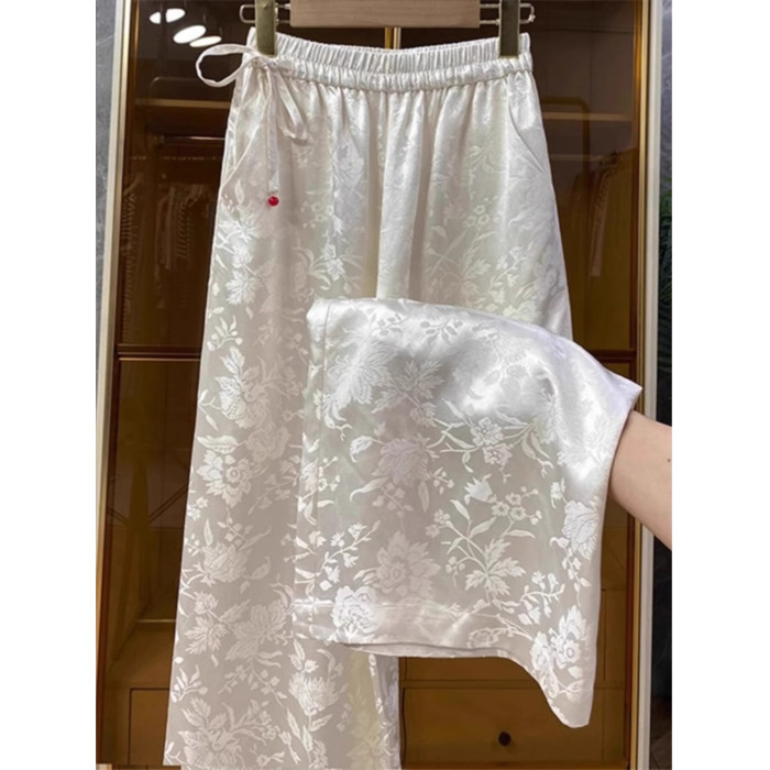 新中式提花緞面濶腿褲女夏季薄款寬鬆高腰垂感國風高檔直筒長褲子