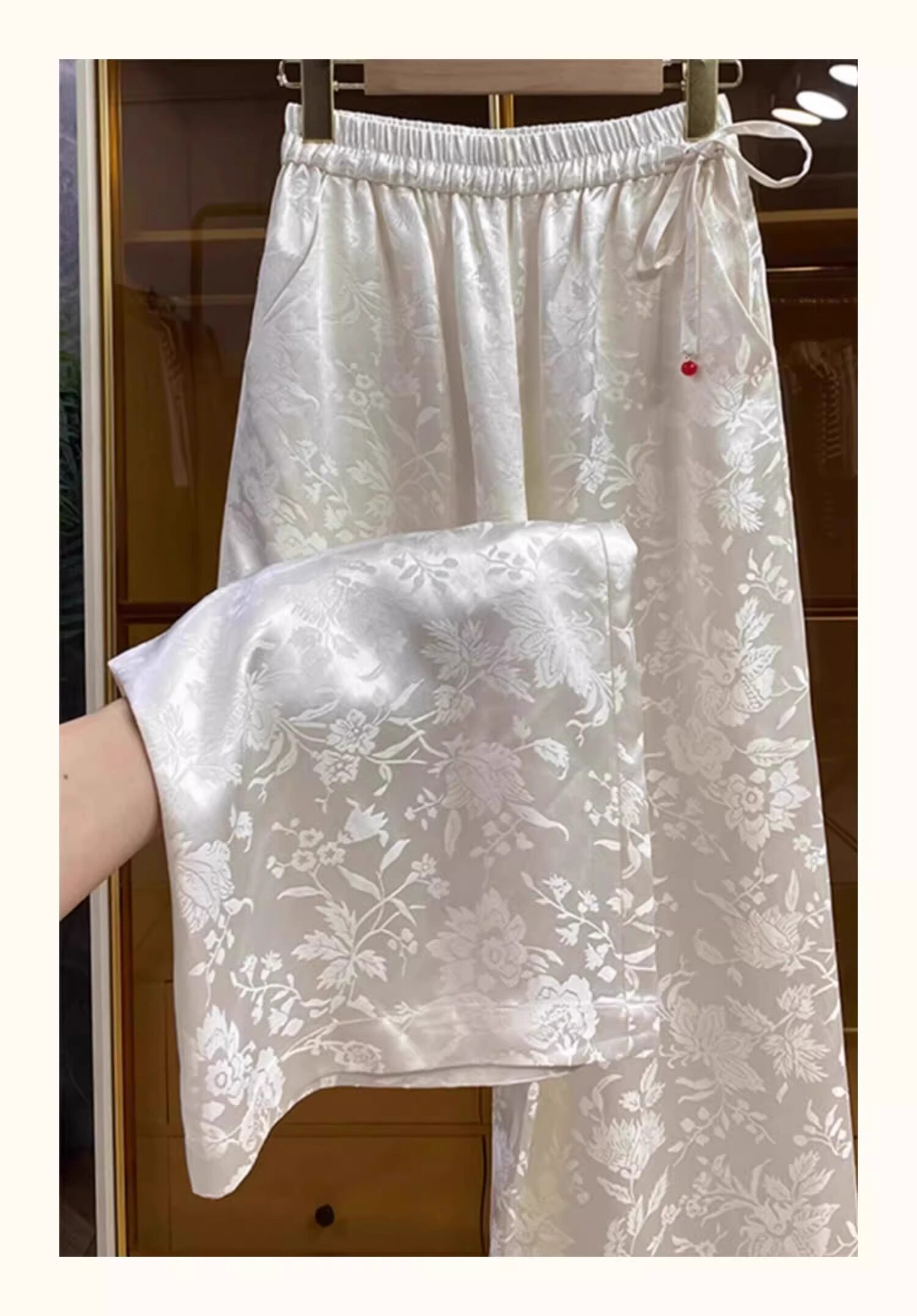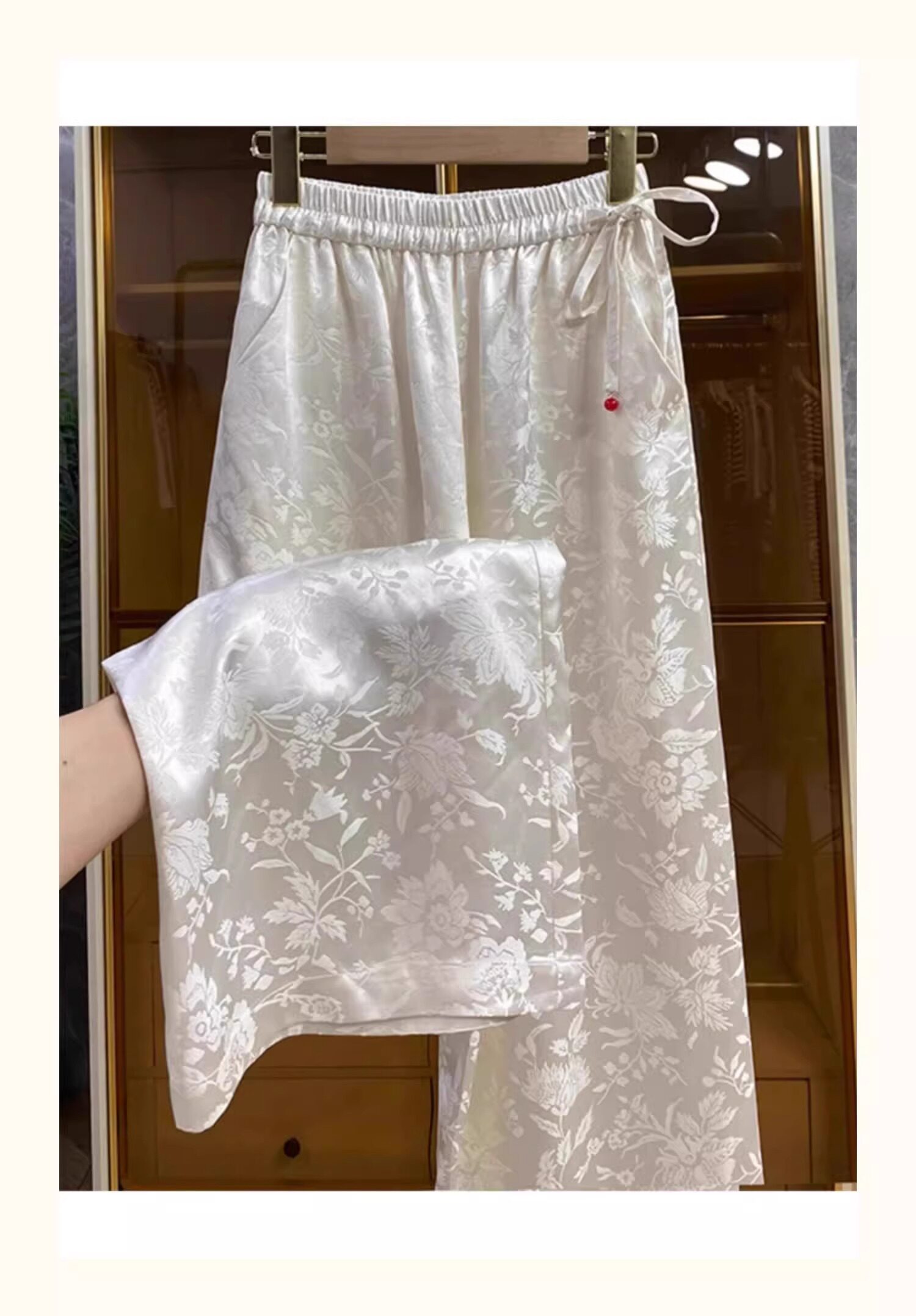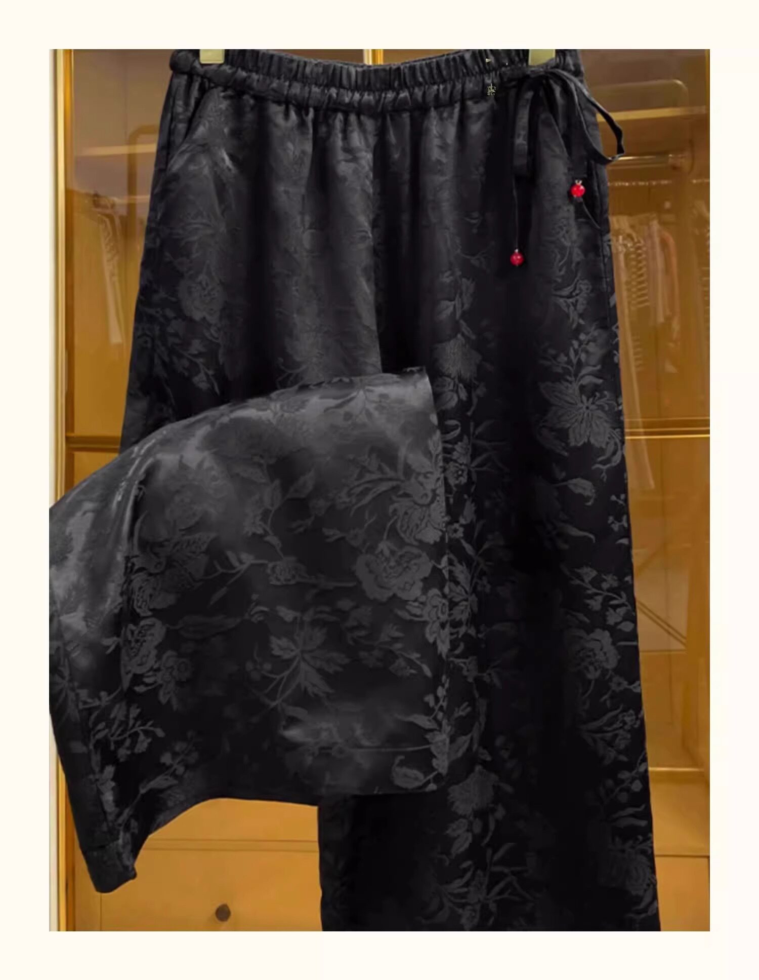 新中式提花緞面濶腿褲女夏季薄款寬鬆高腰垂感國風高檔直筒長褲子