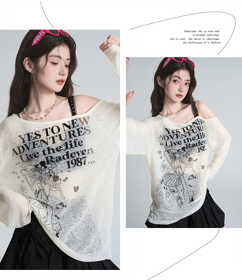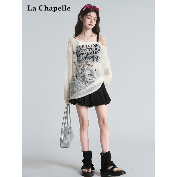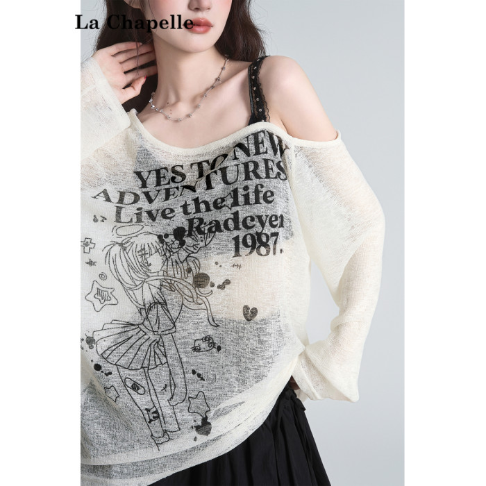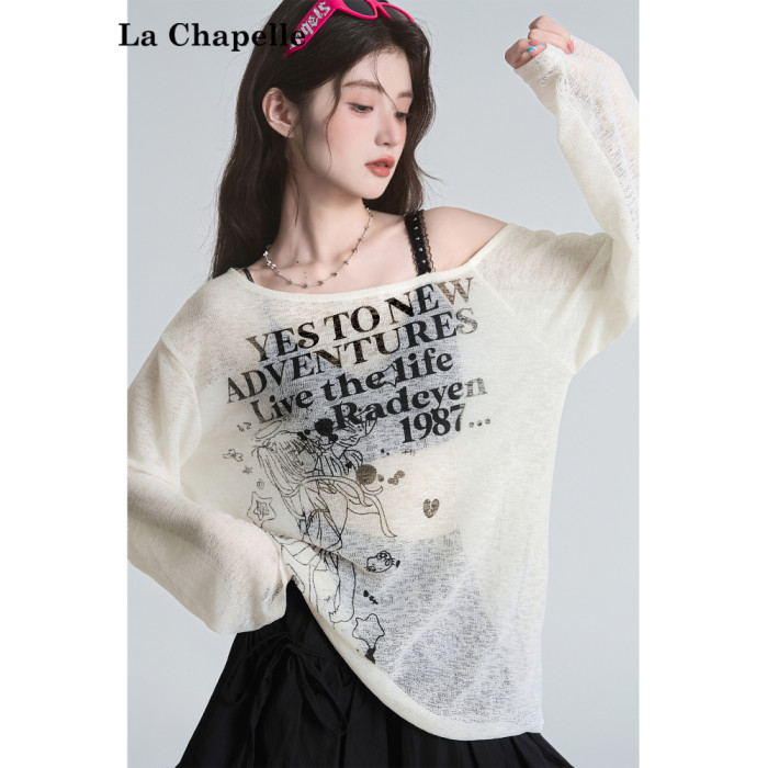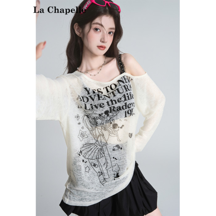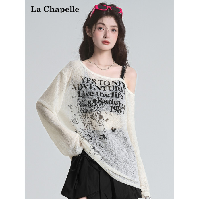 拉夏貝爾美式斜領防曬罩衫長袖T恤女夏季設計感性感寬鬆露肩上衣