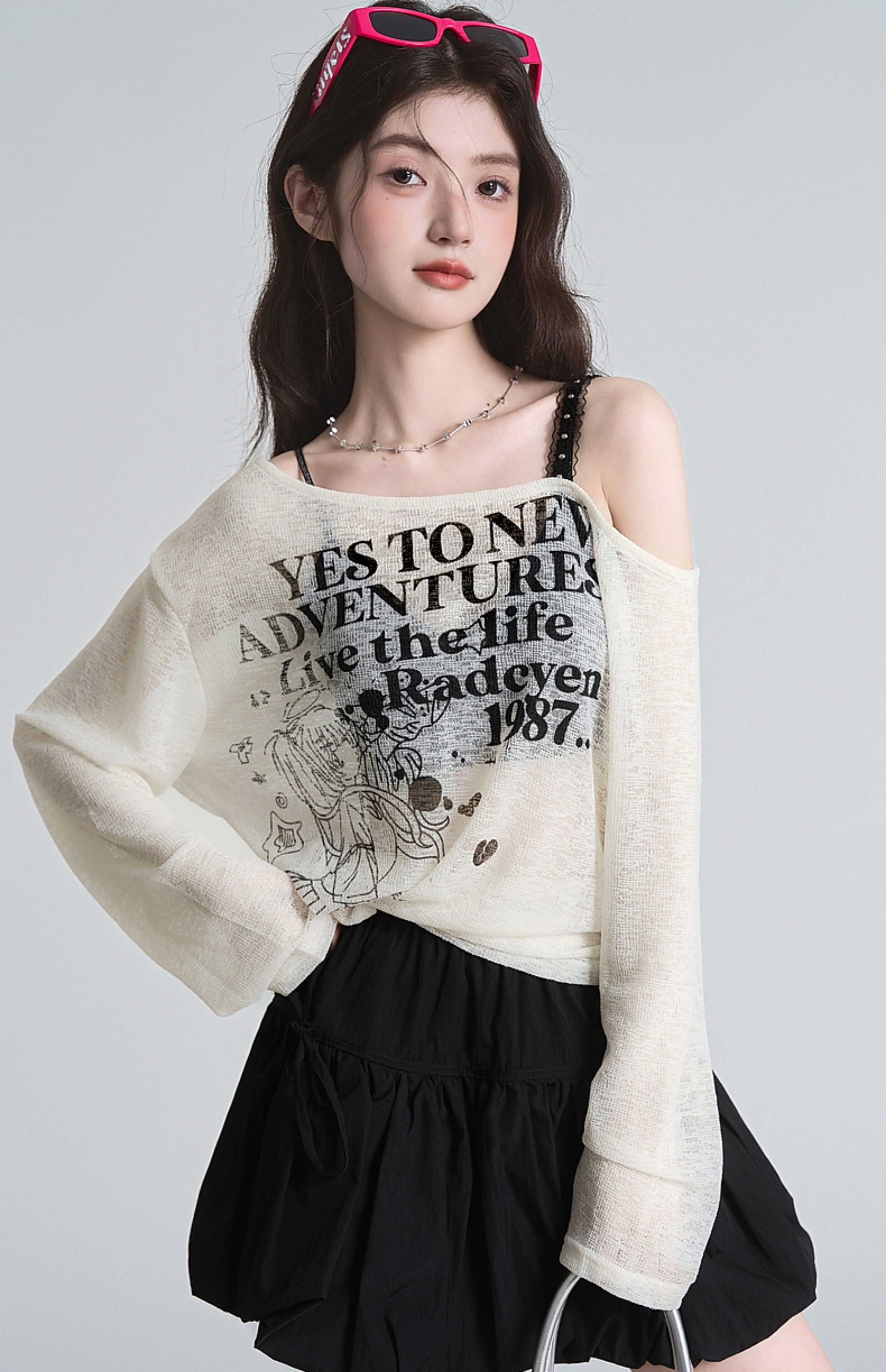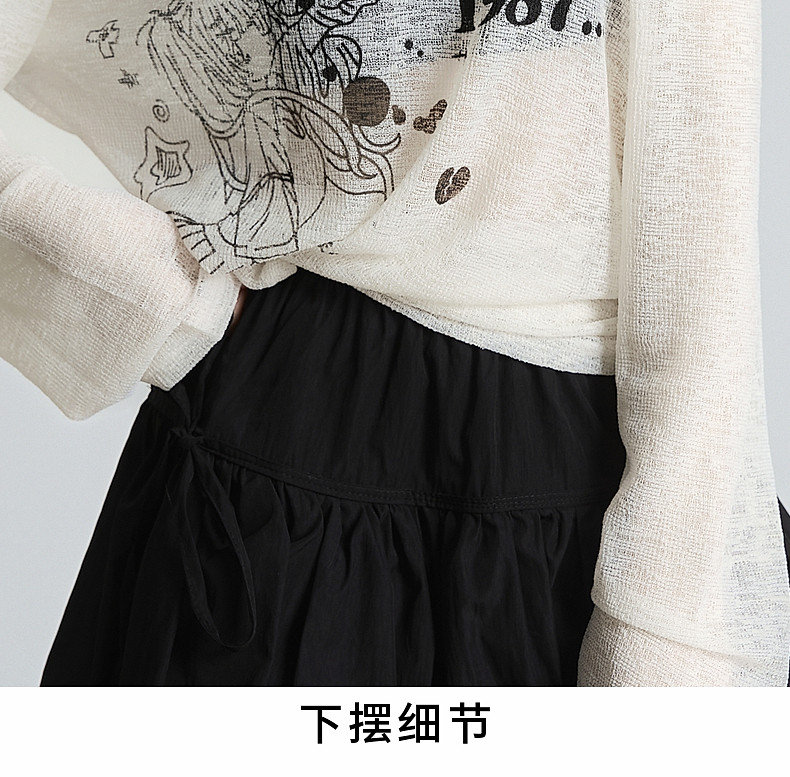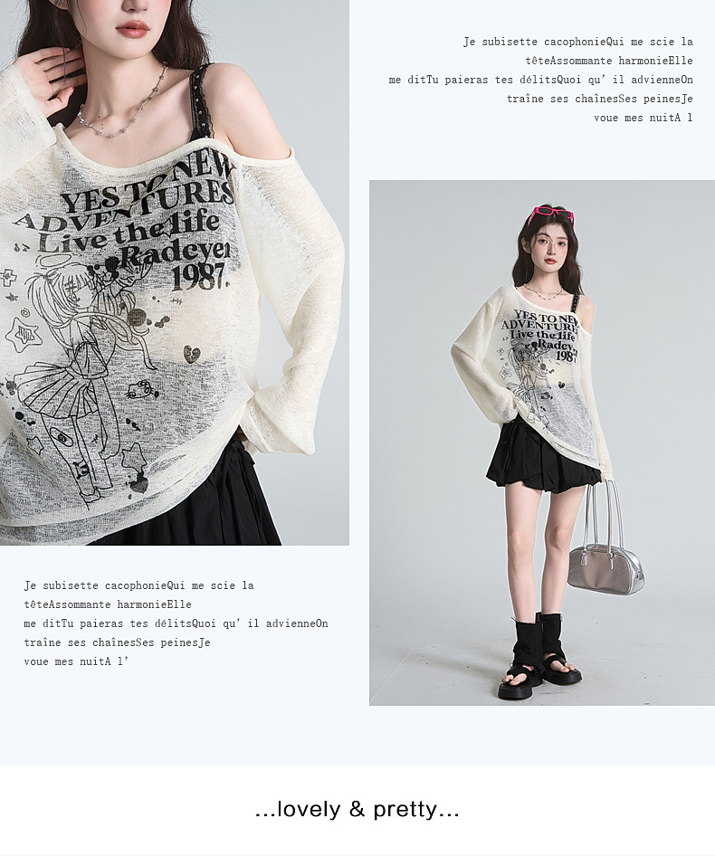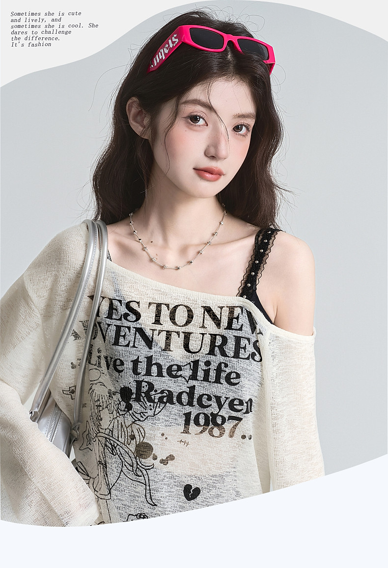 拉夏貝爾美式斜領防曬罩衫長袖T恤女夏季設計感性感寬鬆露肩上衣