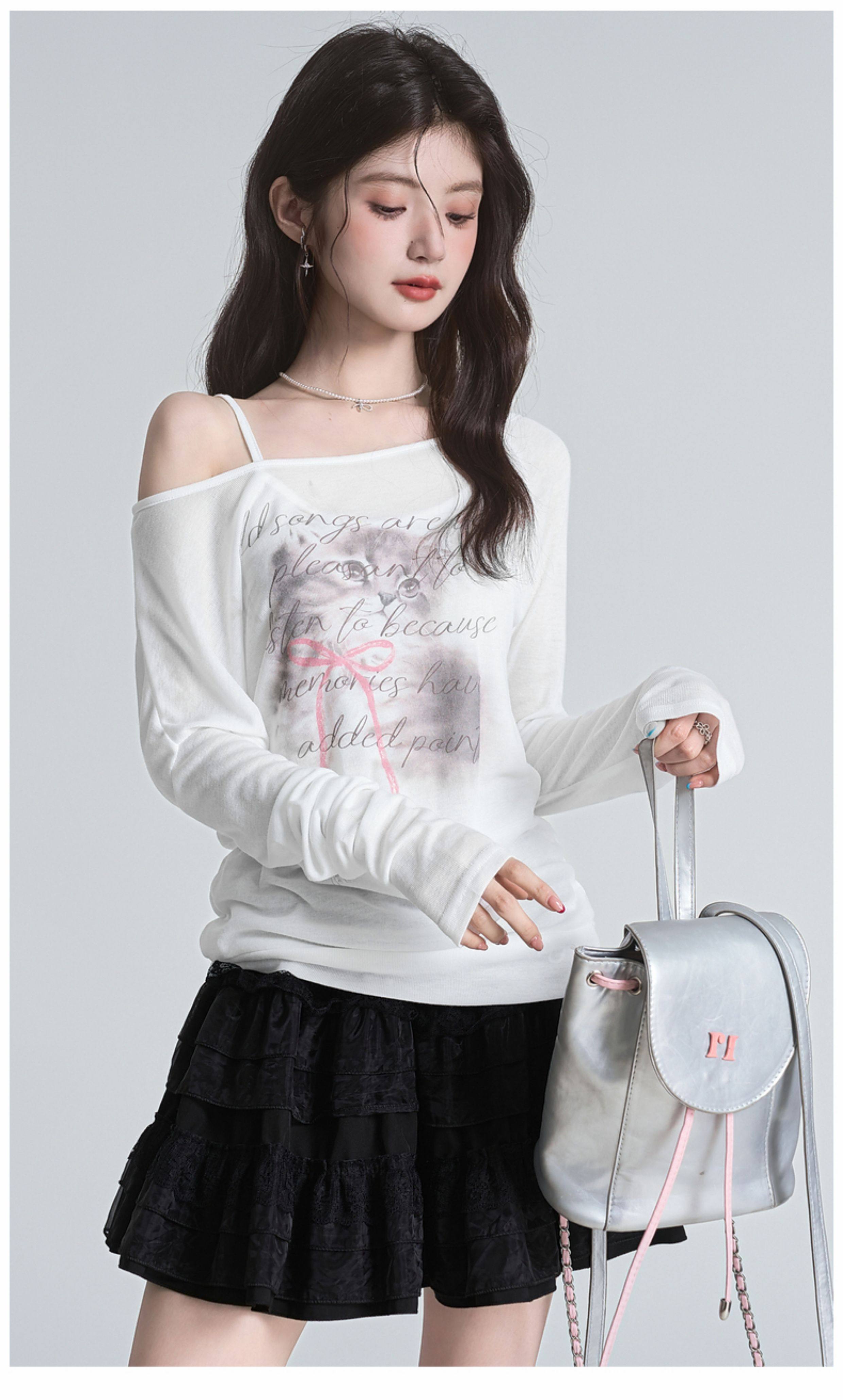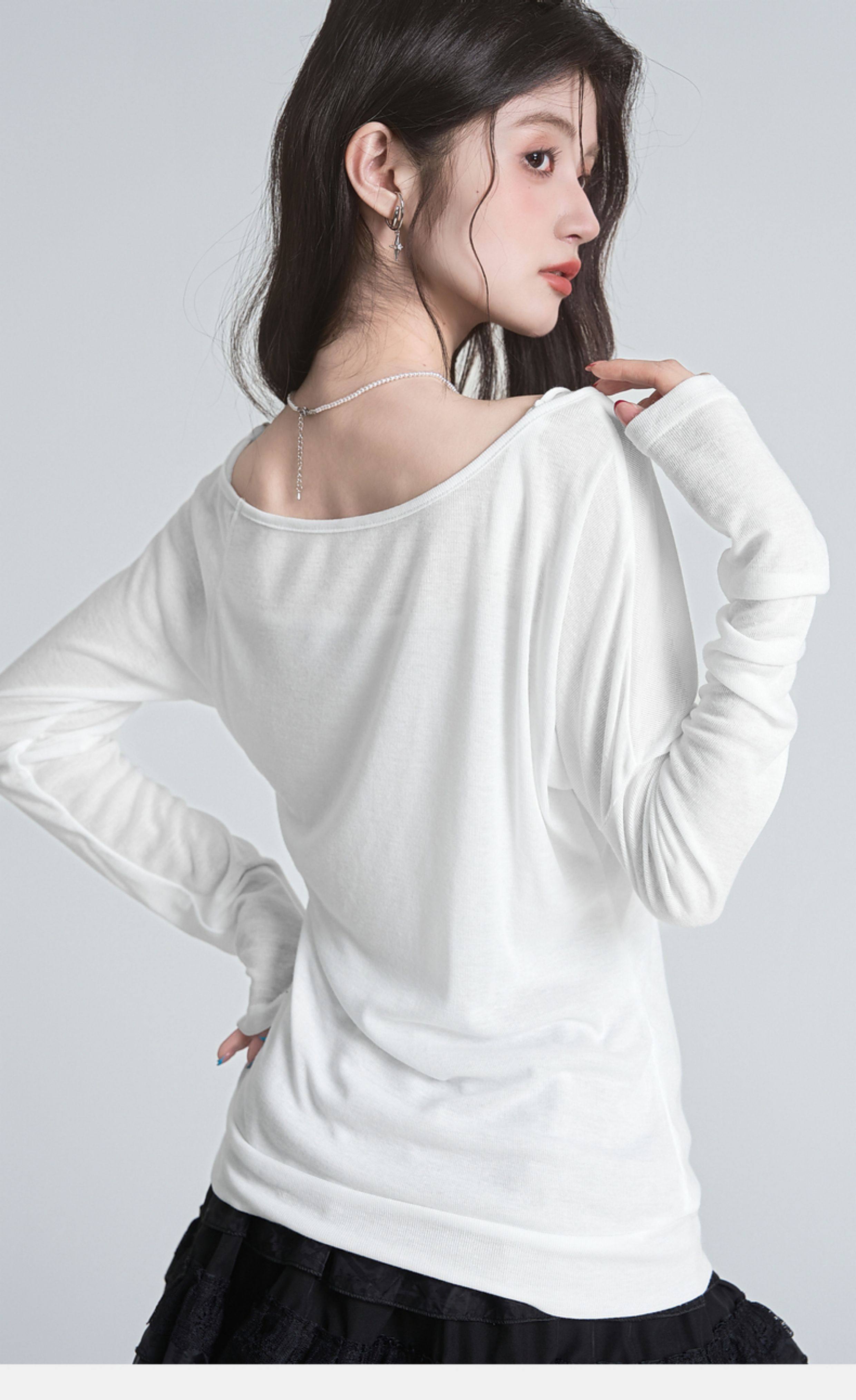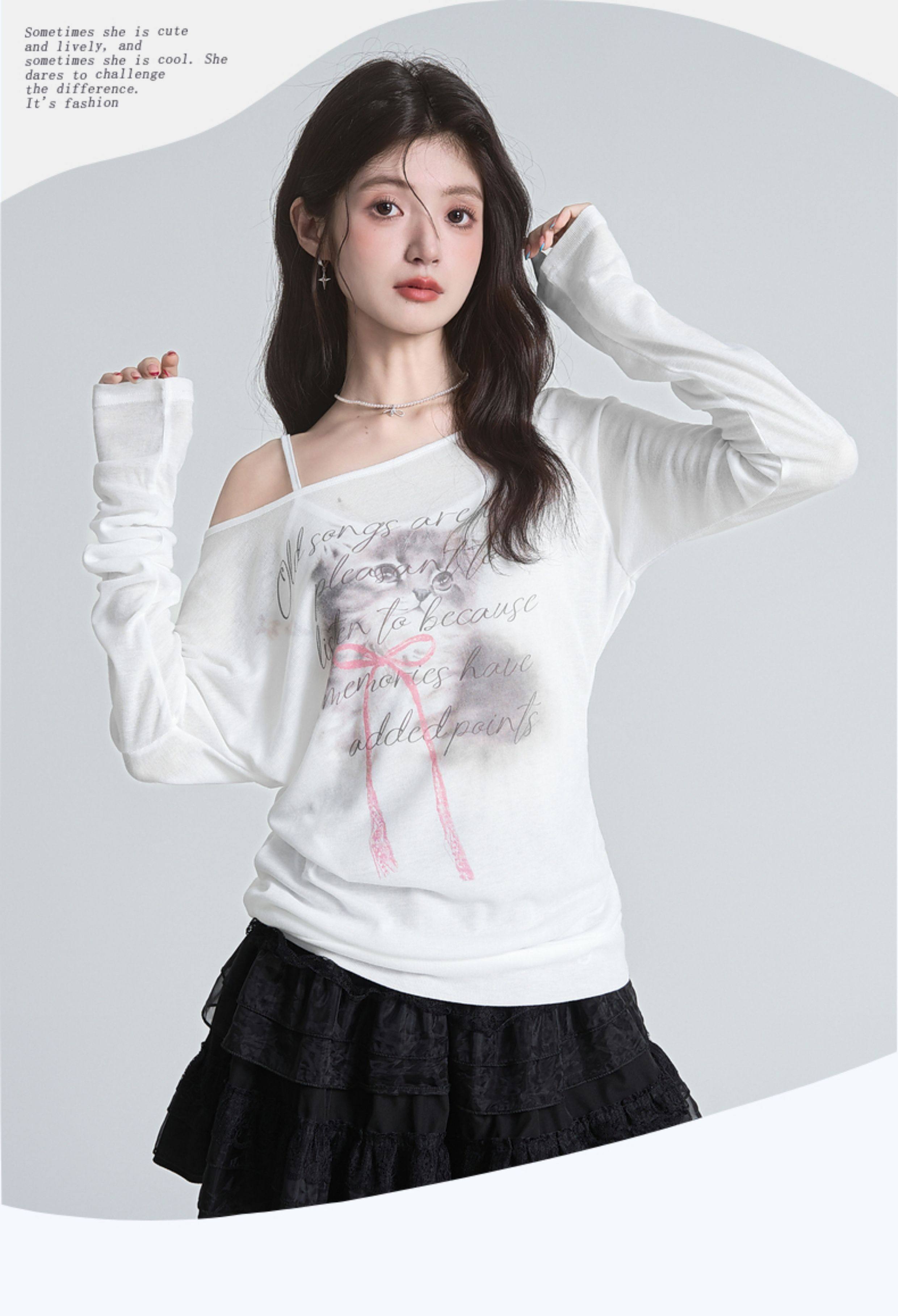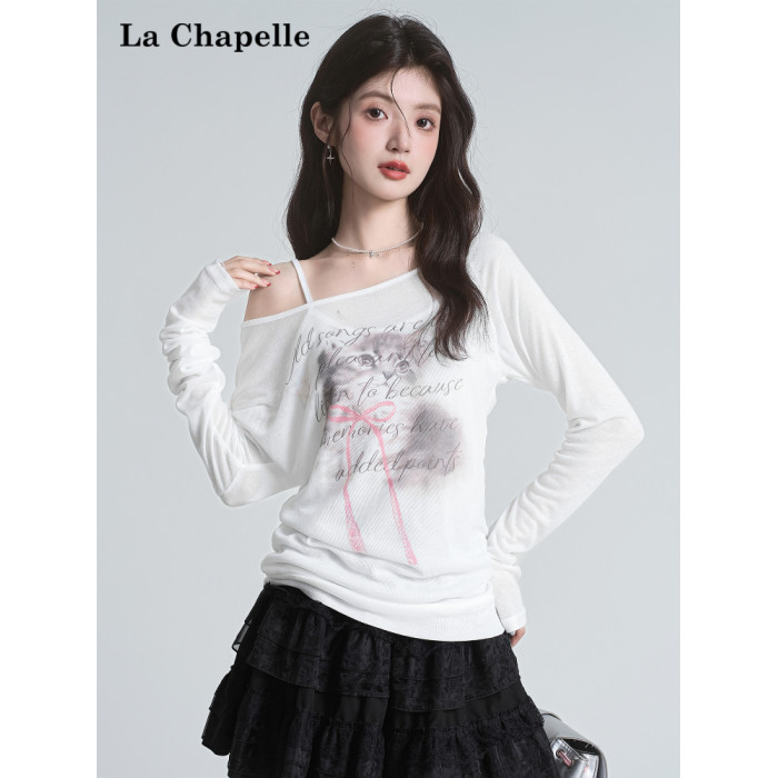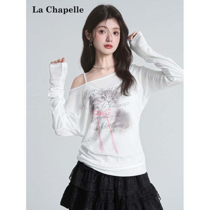 拉夏貝爾罩衫慵懶風斜肩針織衫女夏輕薄防曬T恤白色長袖露肩上衣