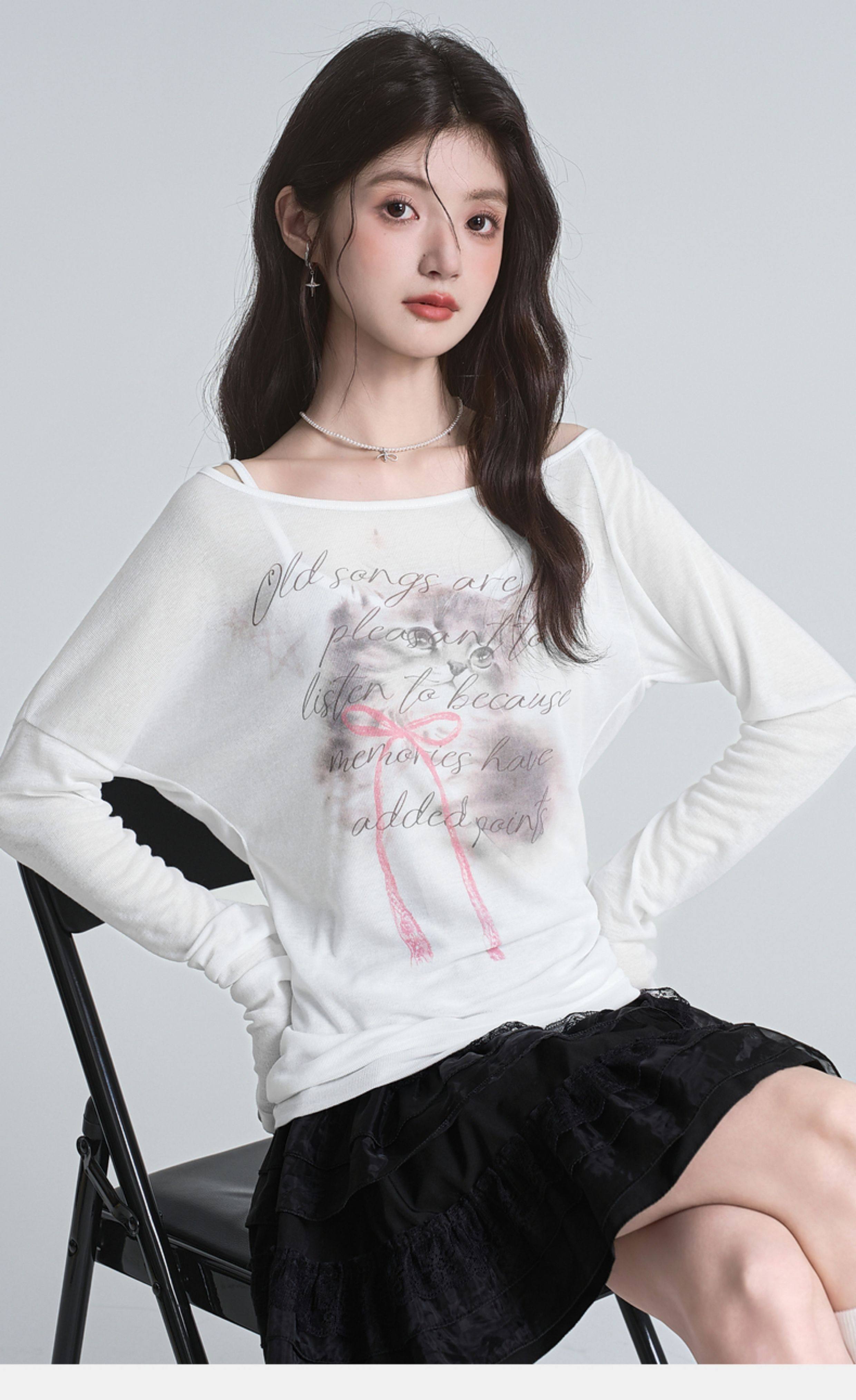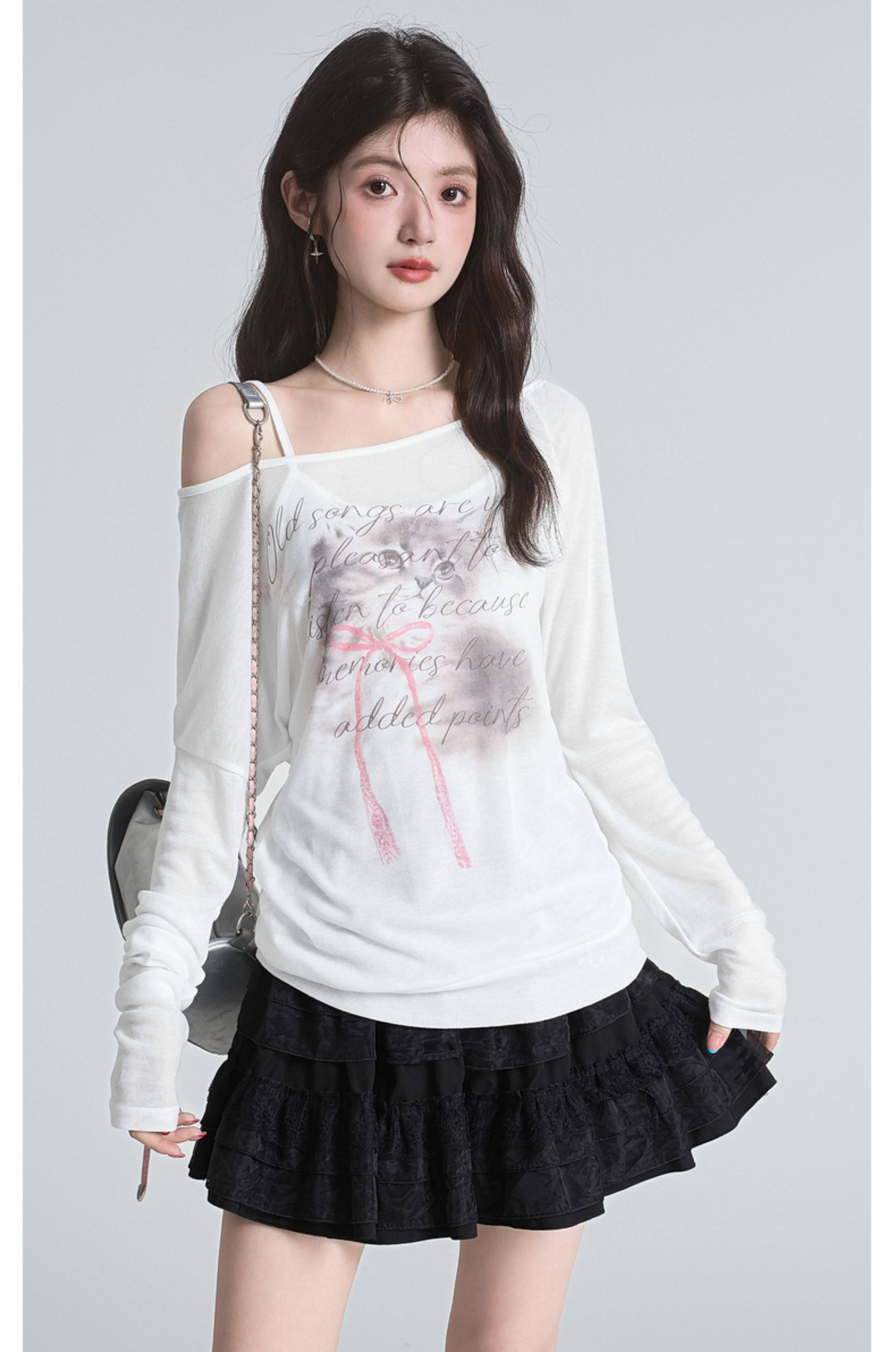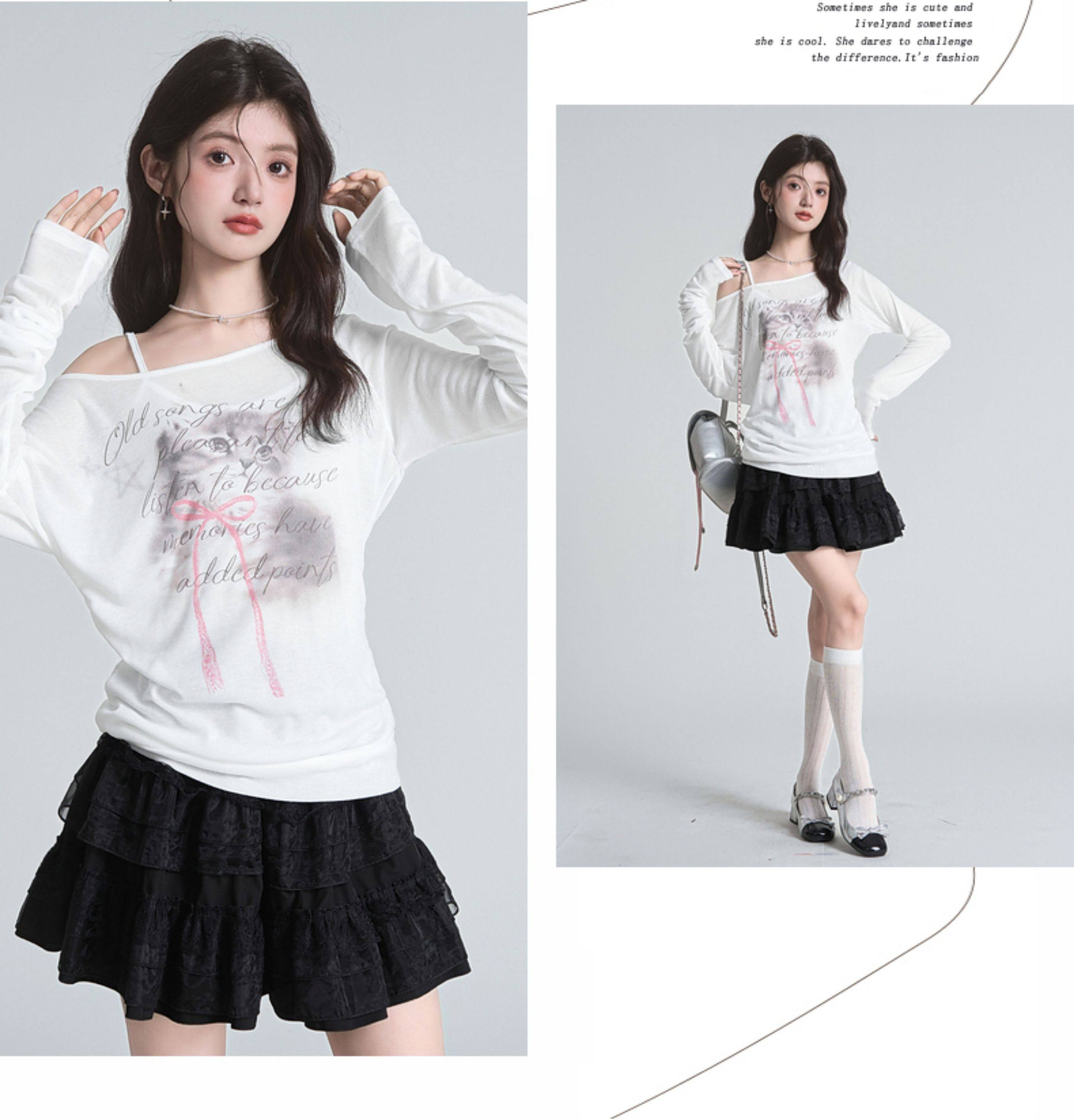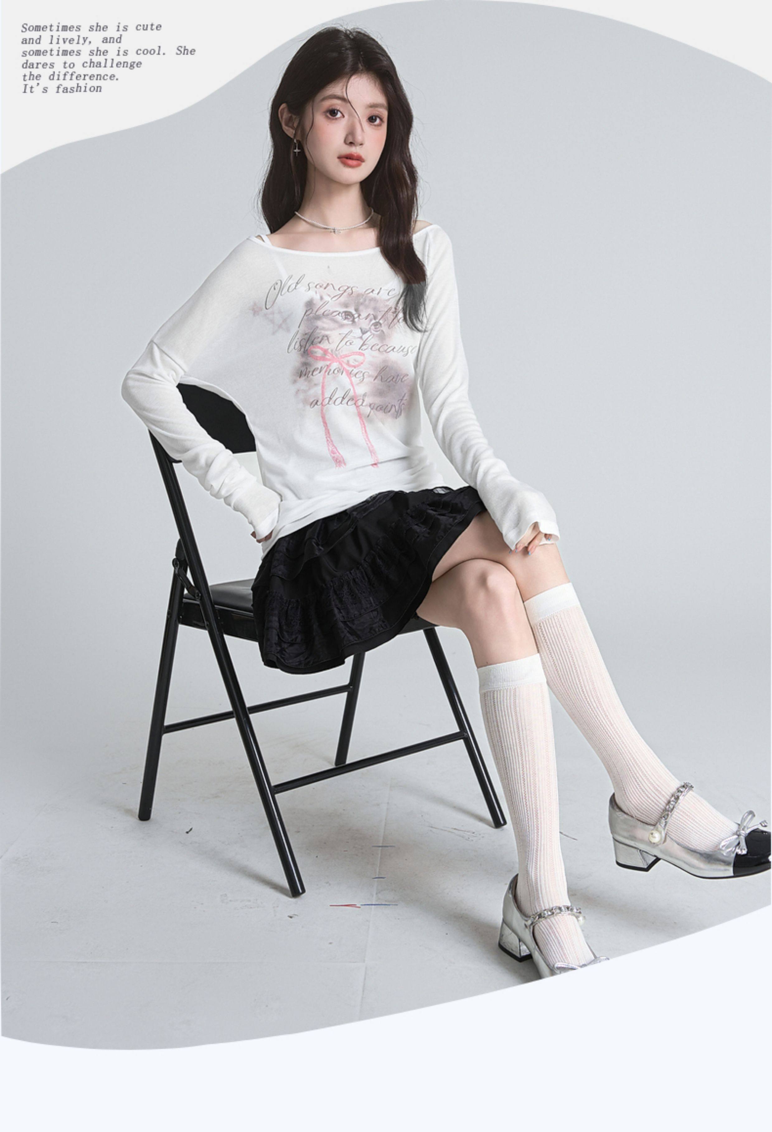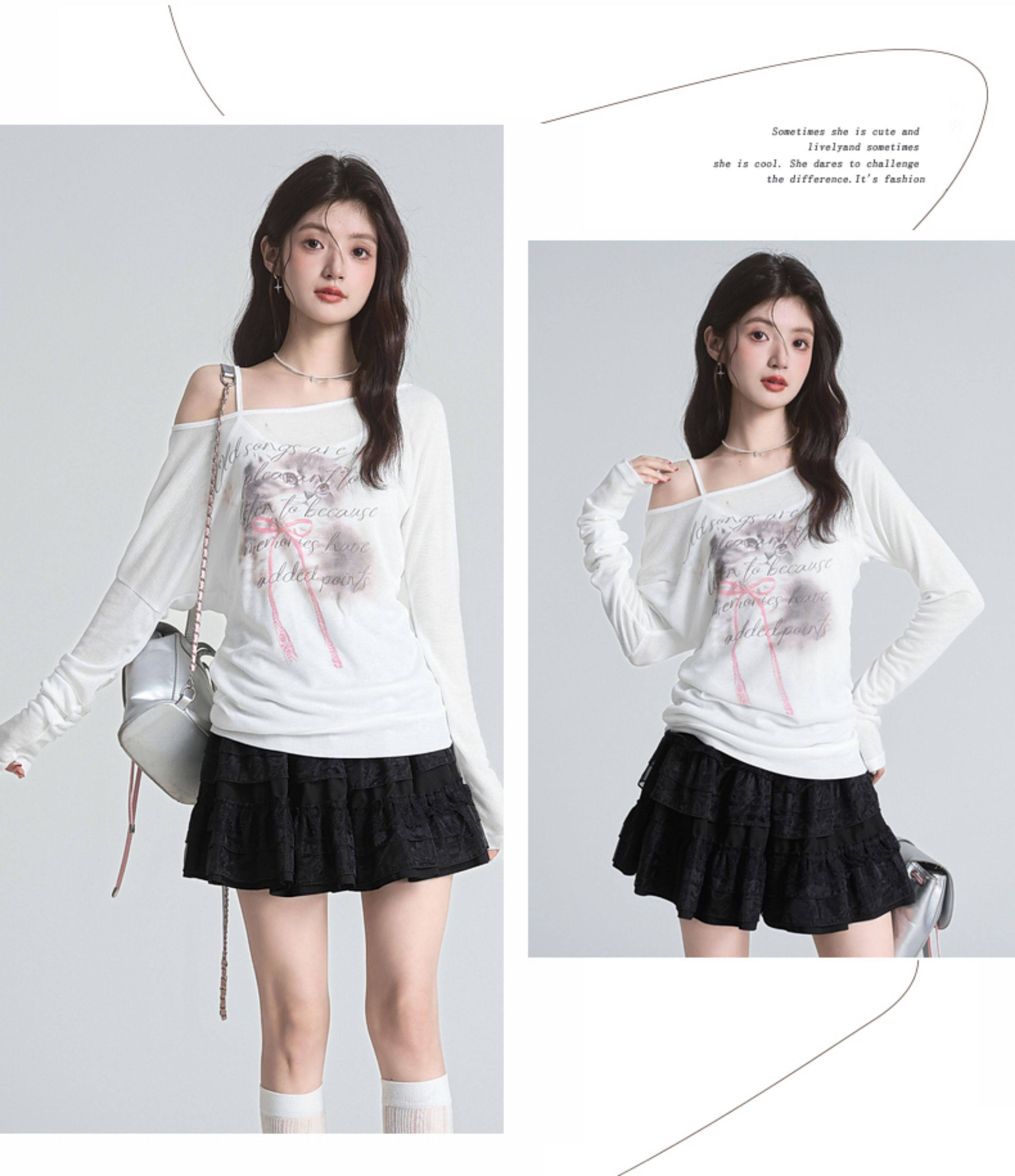拉夏貝爾罩衫慵懶風斜肩針織衫女夏輕薄防曬T恤白色長袖露肩上衣
