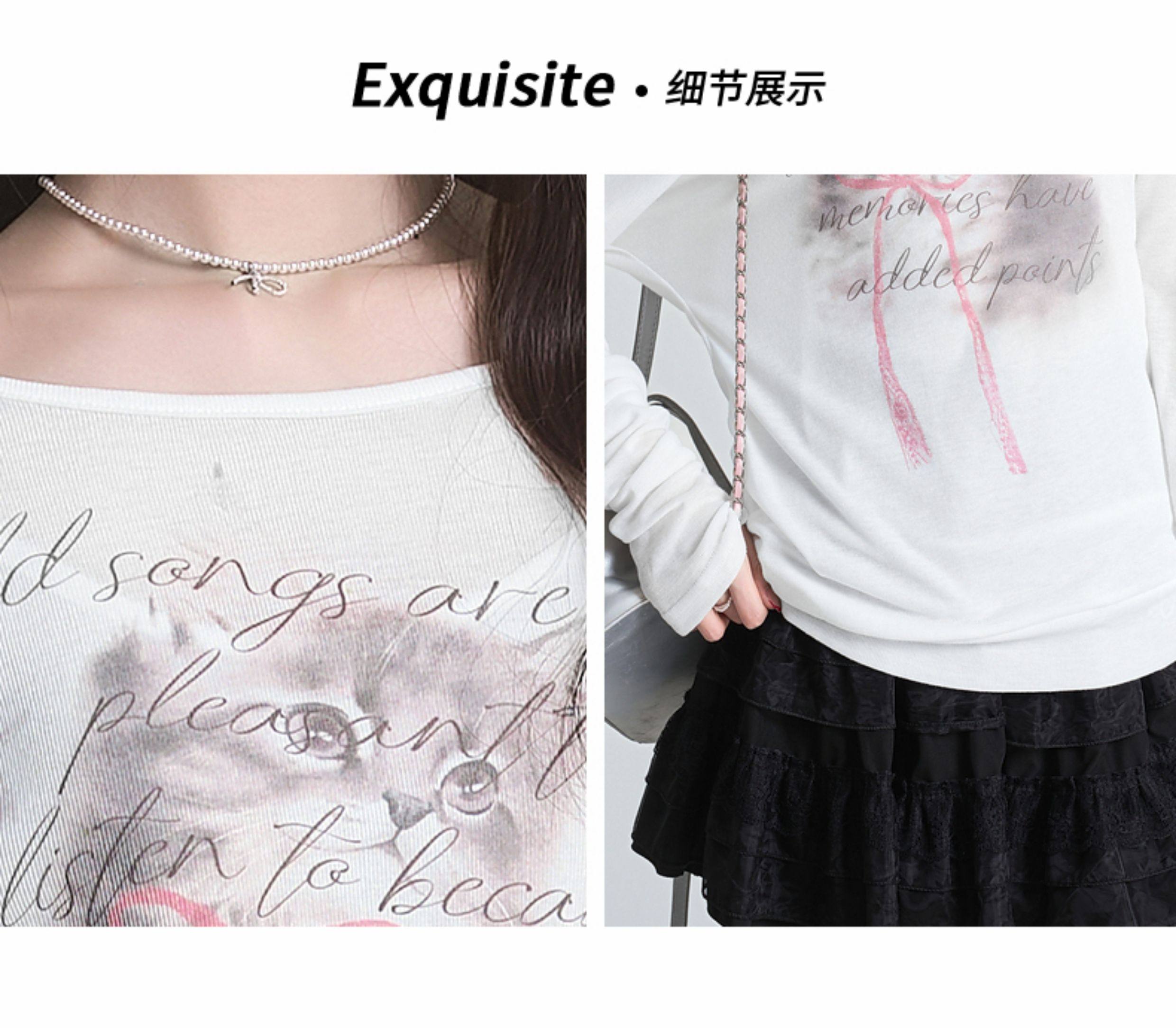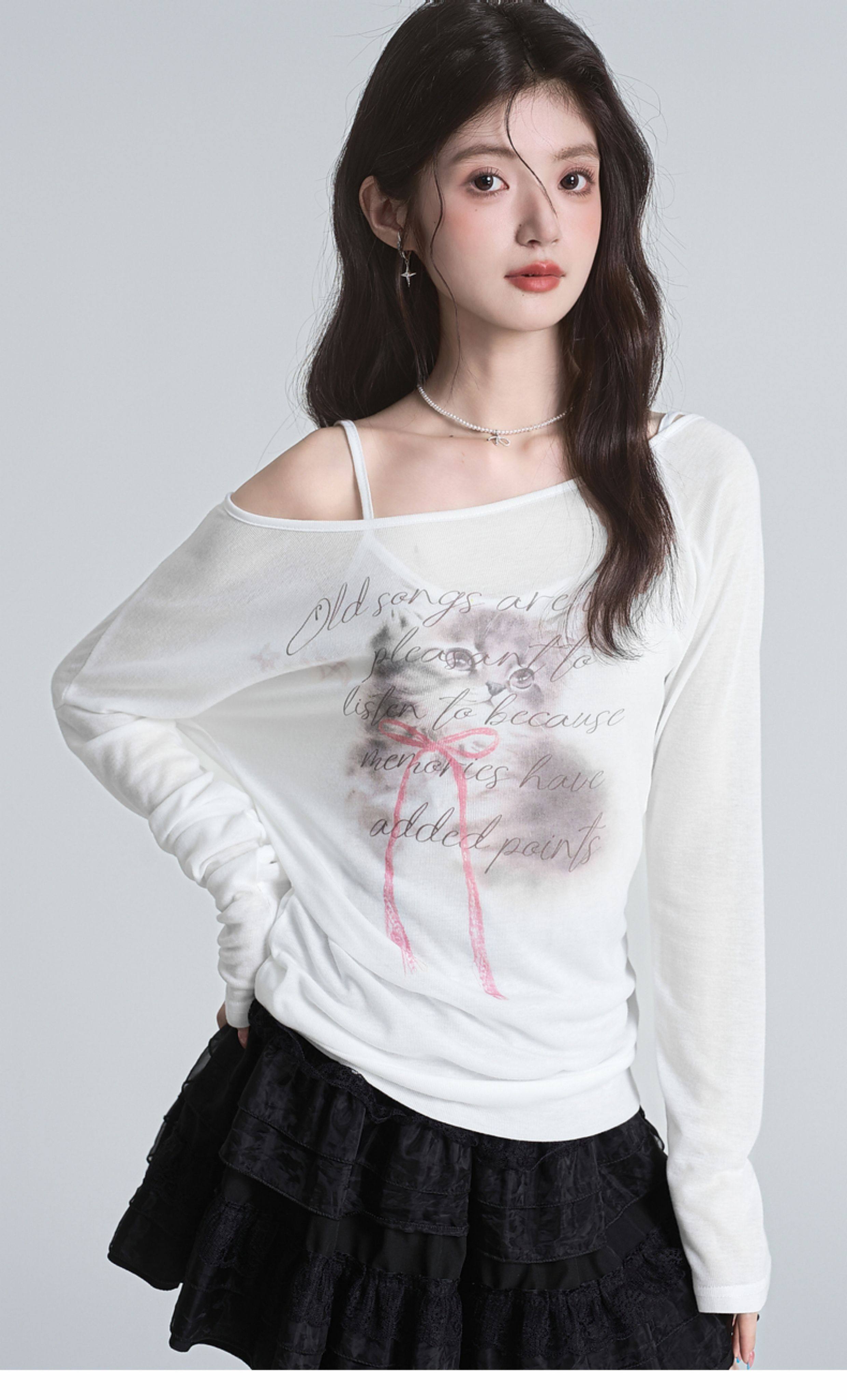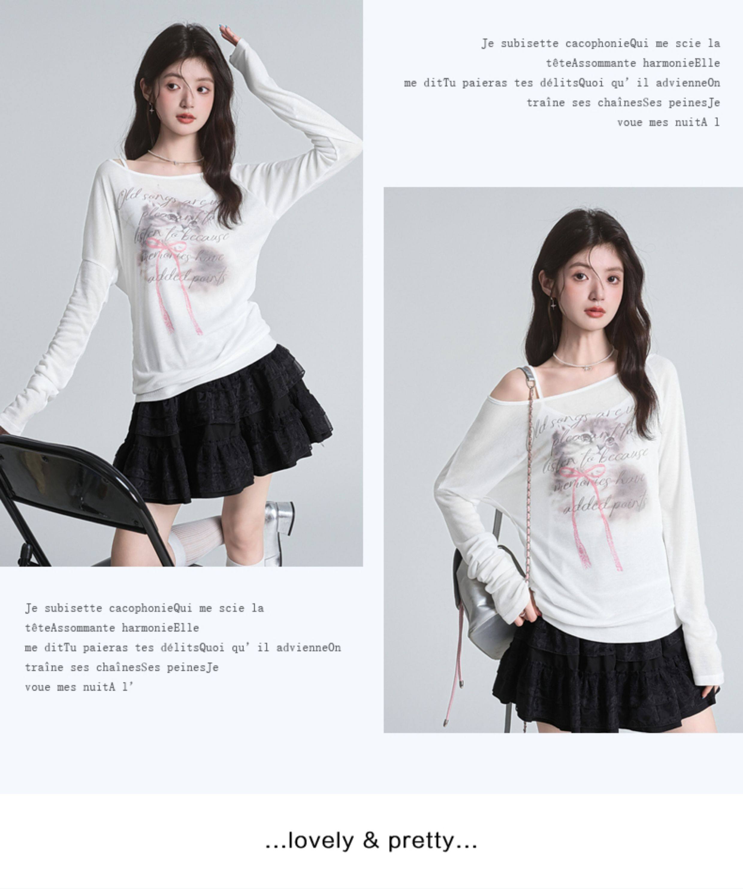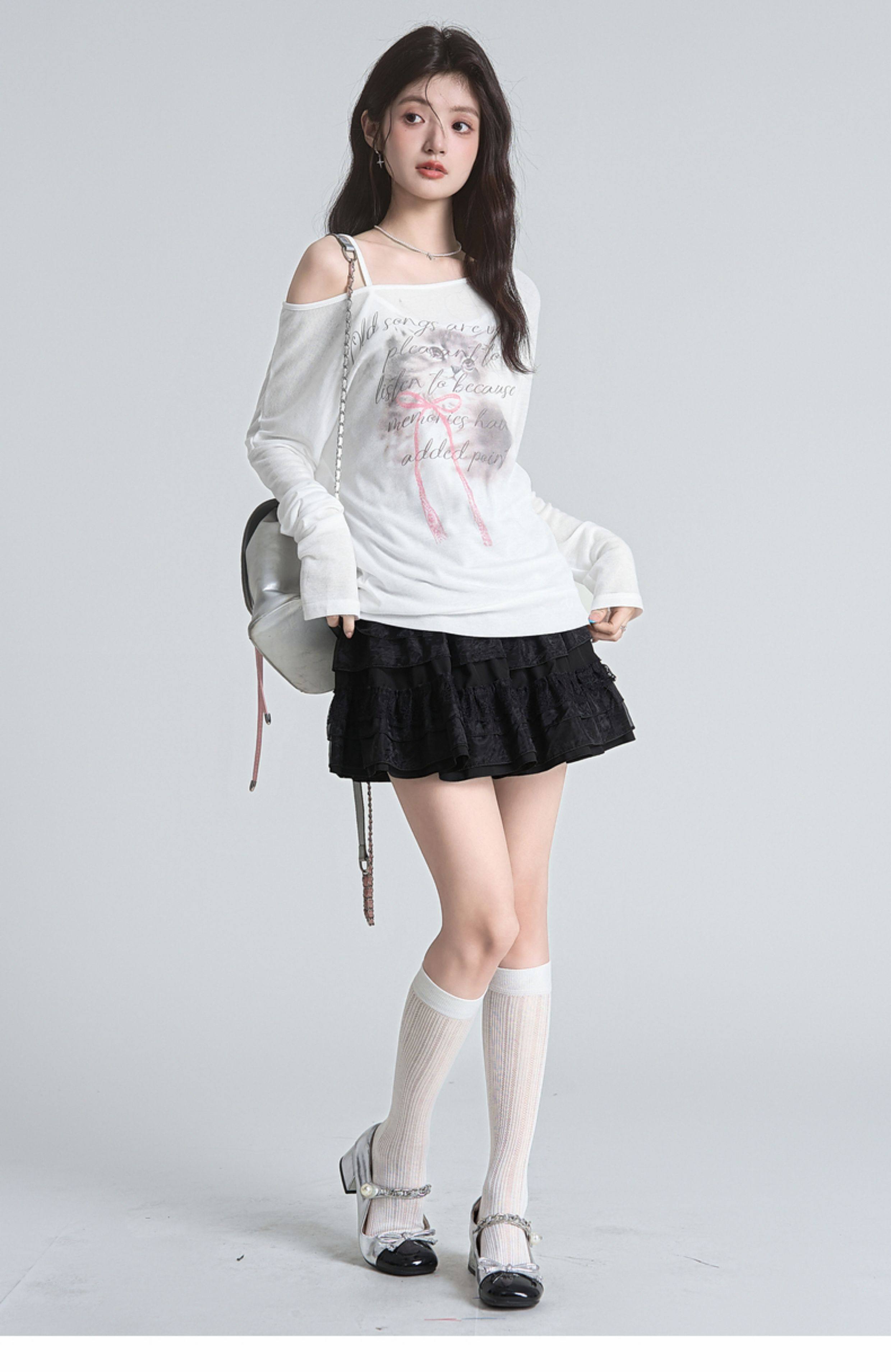 拉夏貝爾罩衫慵懶風斜肩針織衫女夏輕薄防曬T恤白色長袖露肩上衣