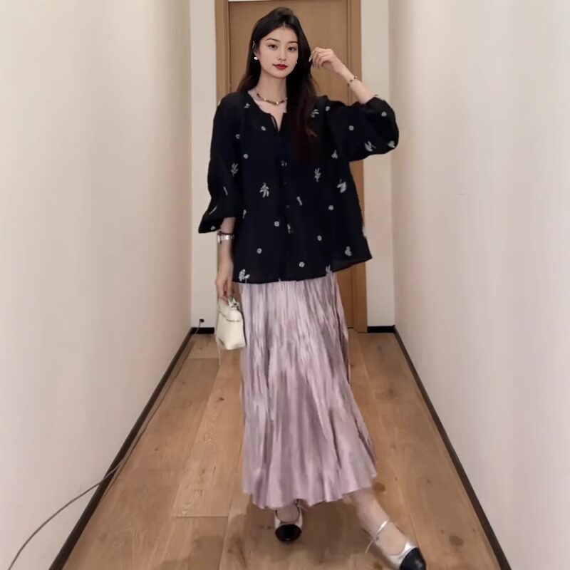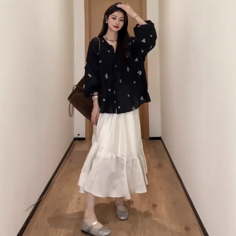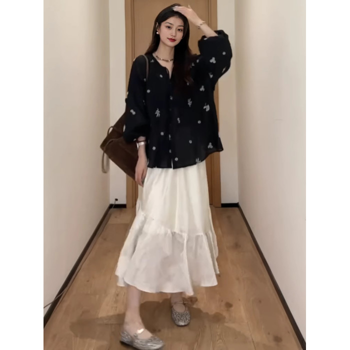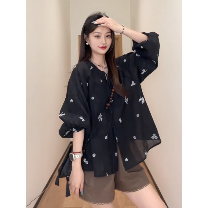 夏季韓版氣質時尚黑色寬鬆女士上衣刺綉減齡長袖百搭防曬襯衫襯衣
