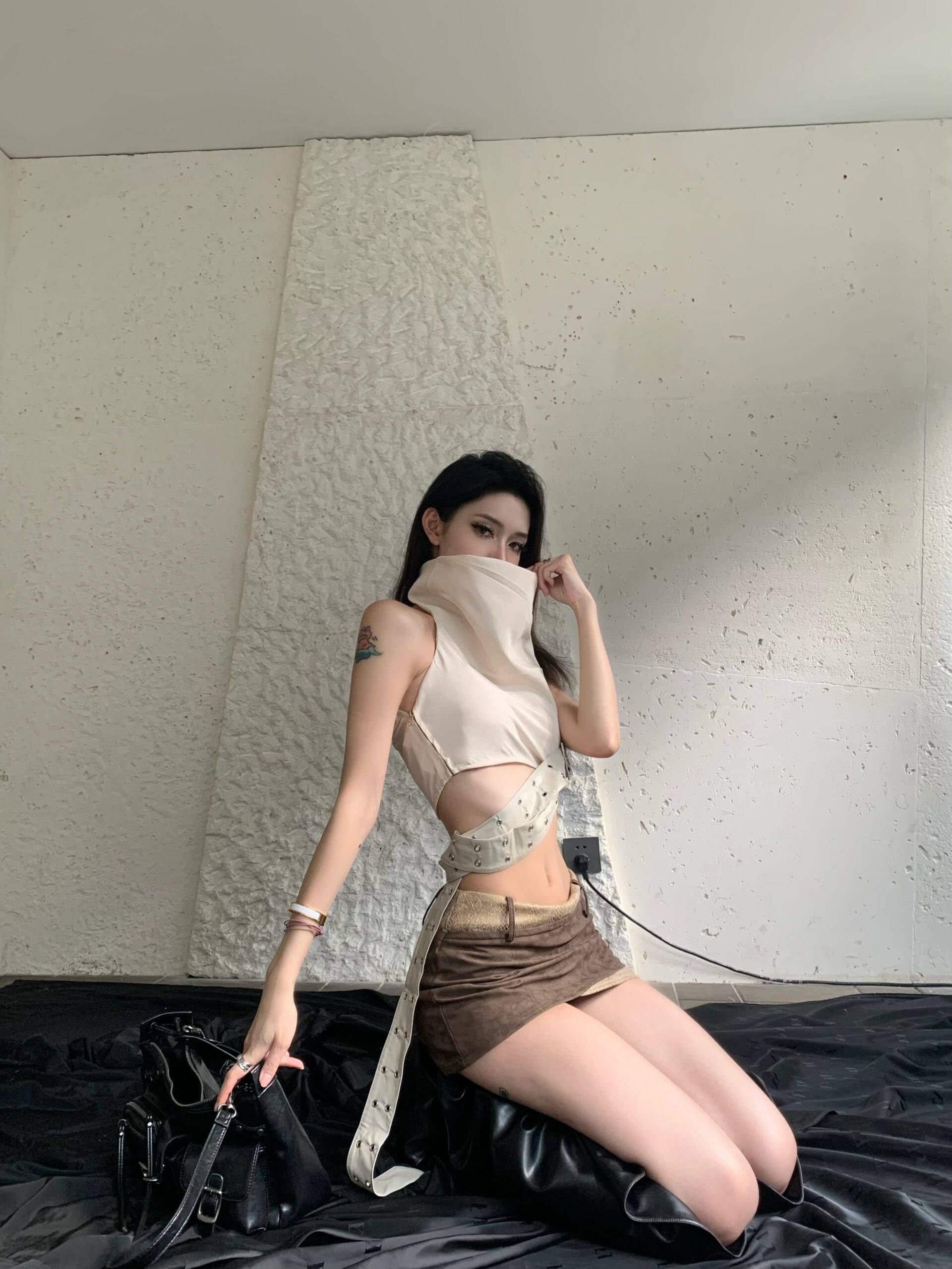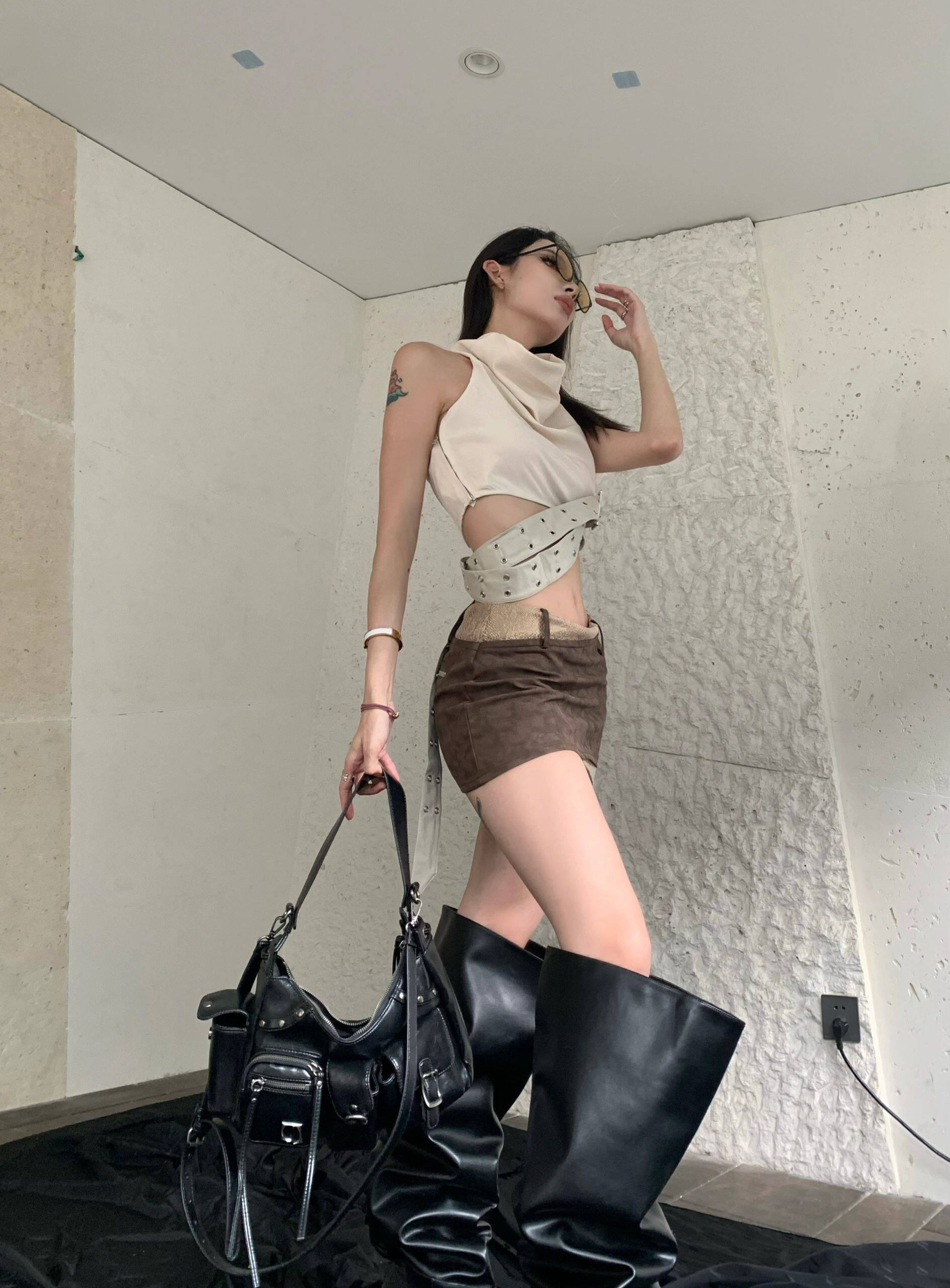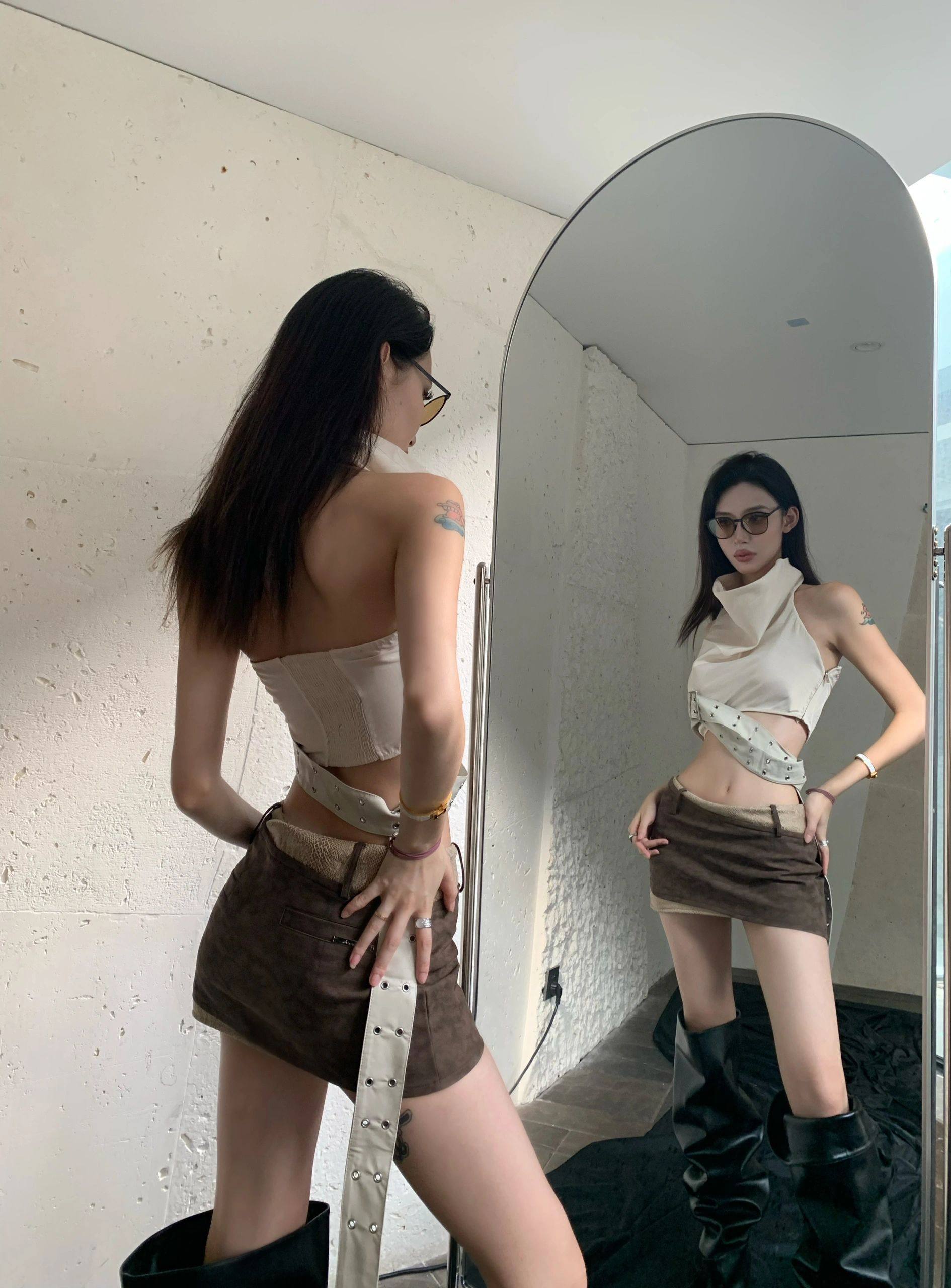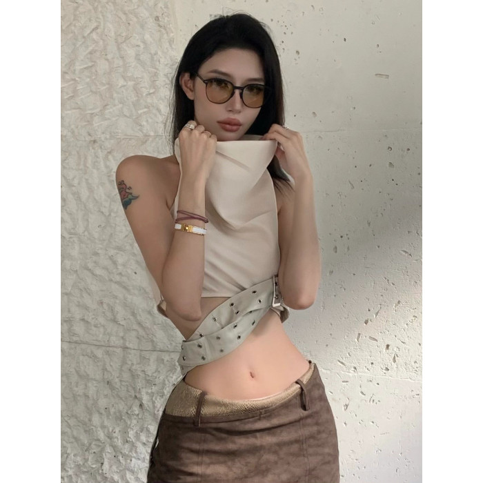 廢土風小衆設計感美背美式外穿辣妹掛脖背心吊帶上衣短裙套裝