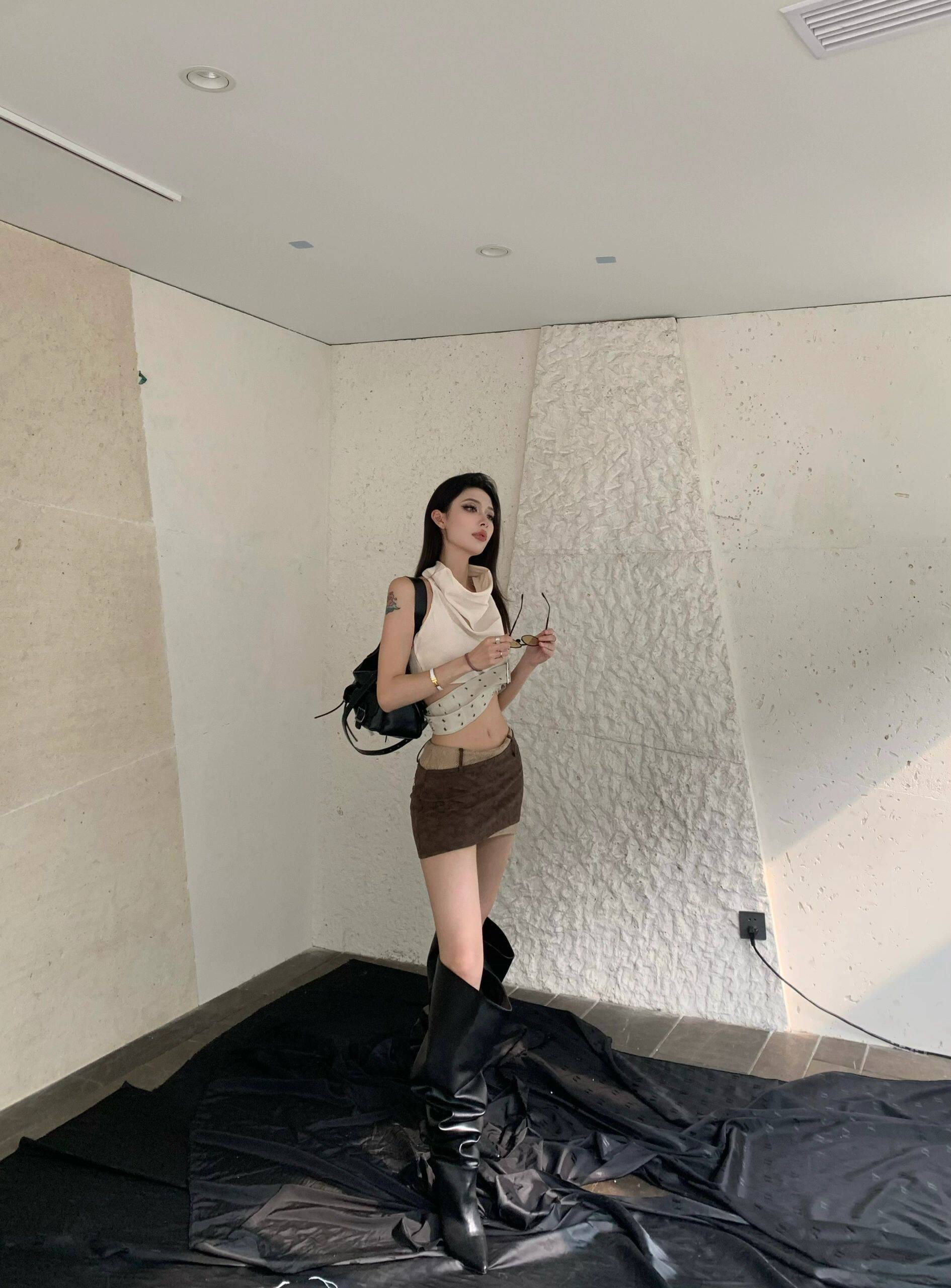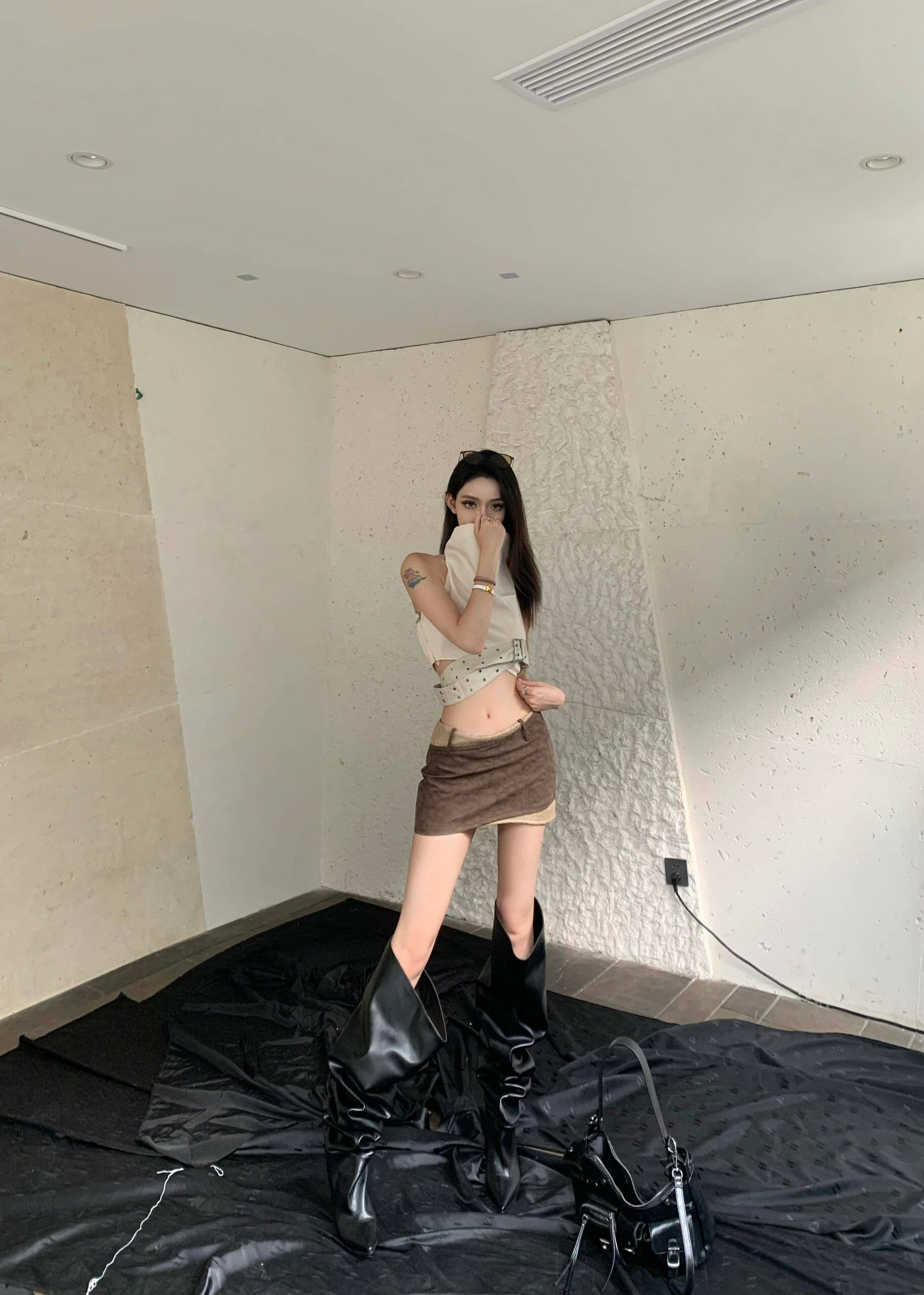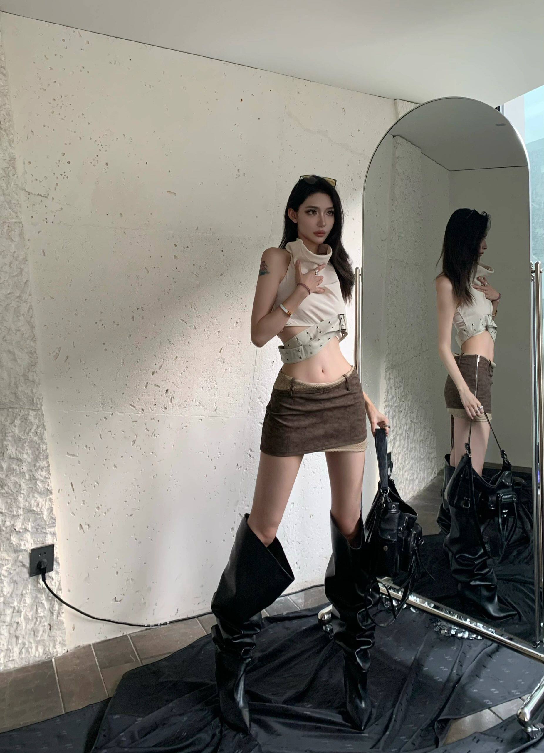 廢土風小衆設計感美背美式外穿辣妹掛脖背心吊帶上衣短裙套裝