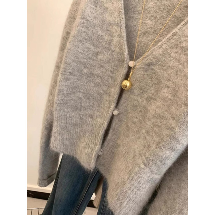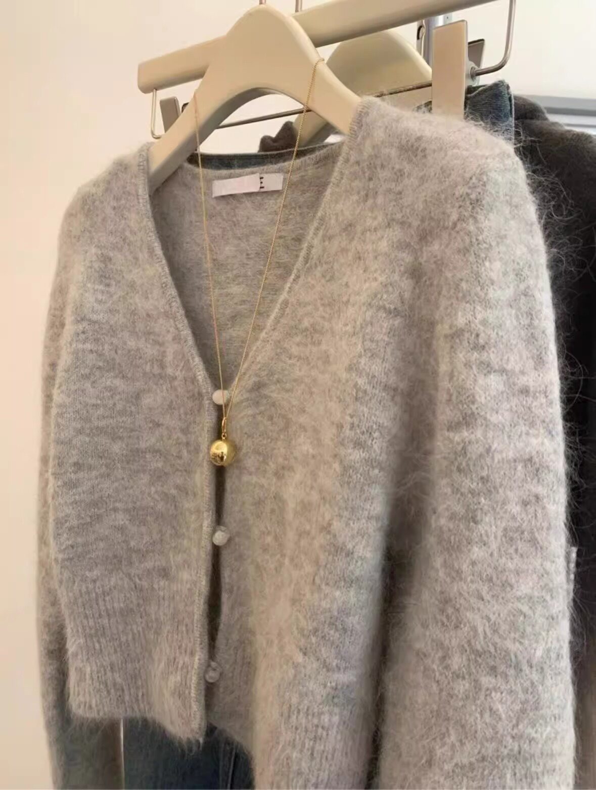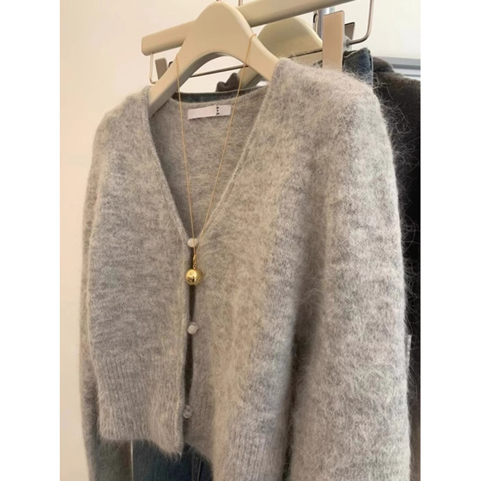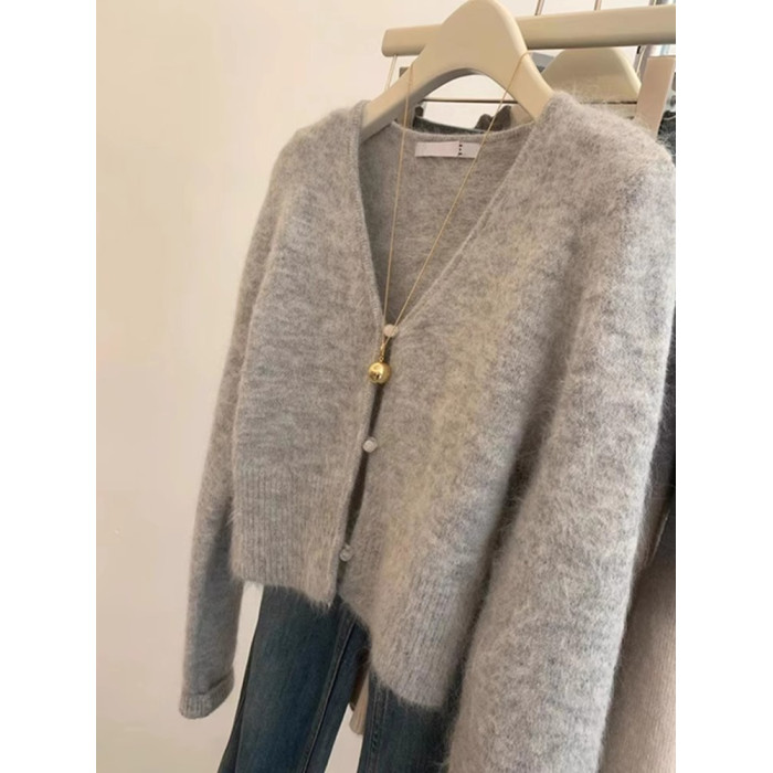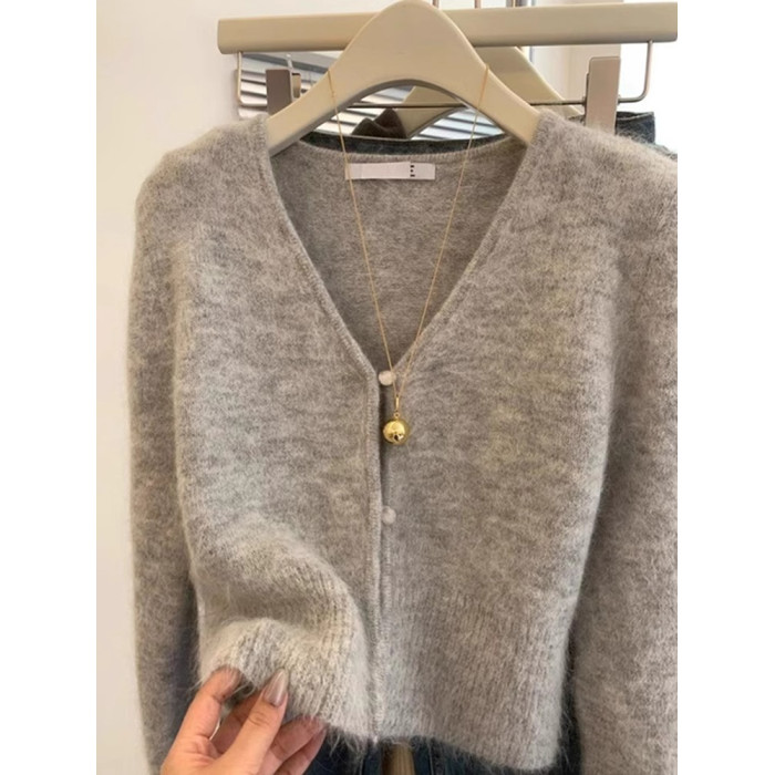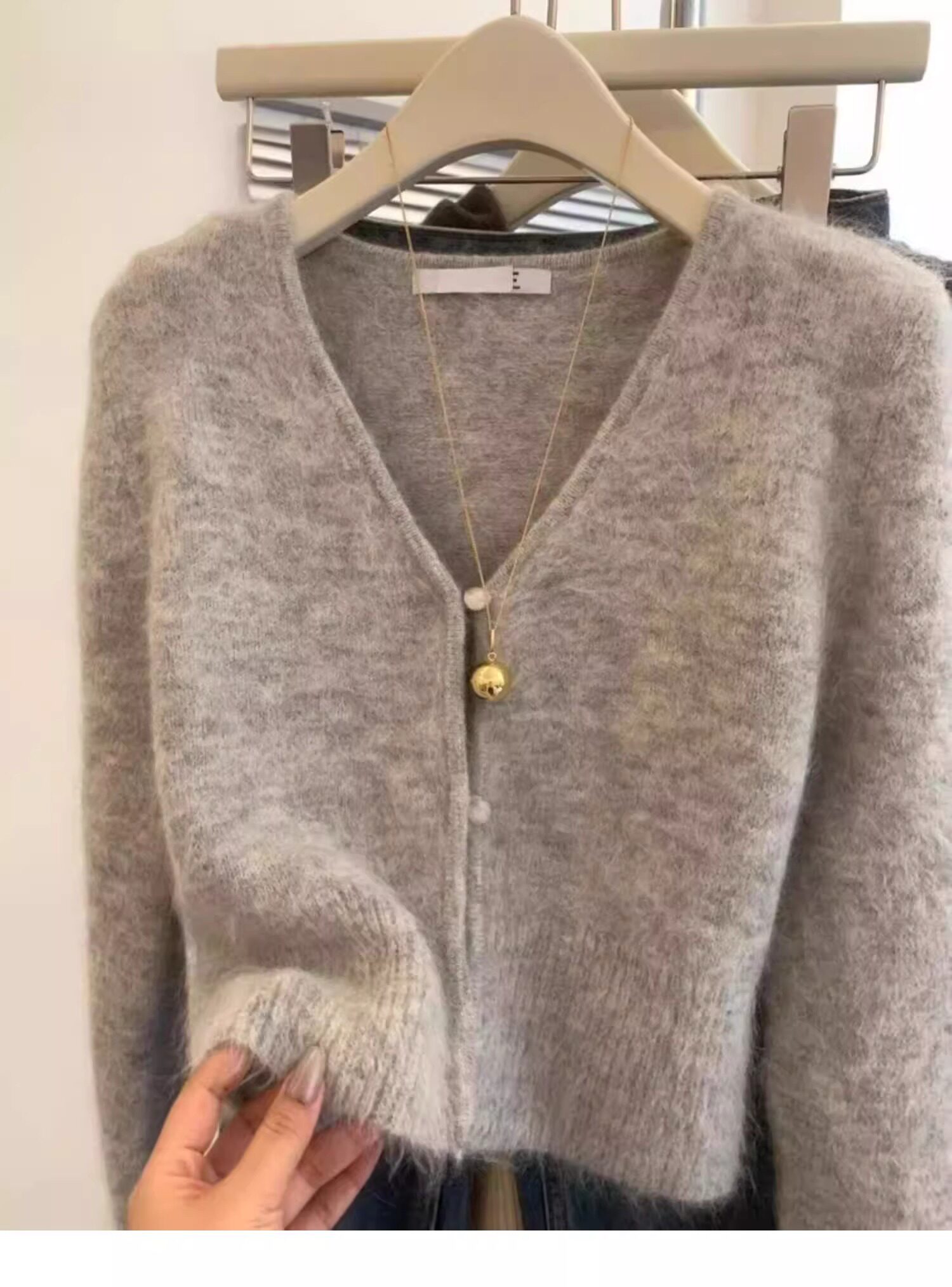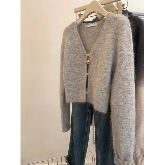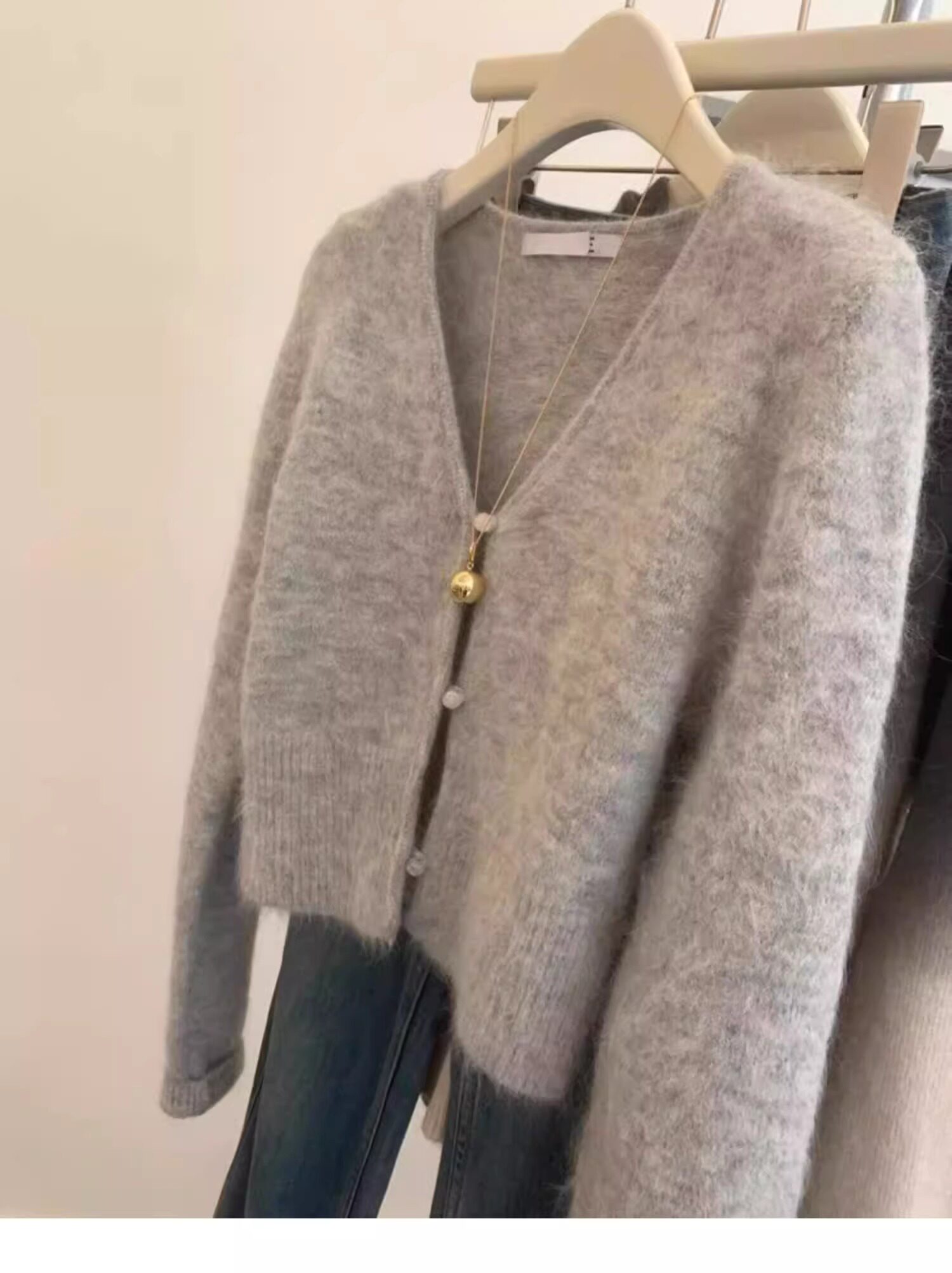 一線大牌剪標餘單浣熊絨v領短款毛衣開衫女復古灰色針織外套