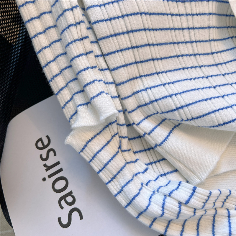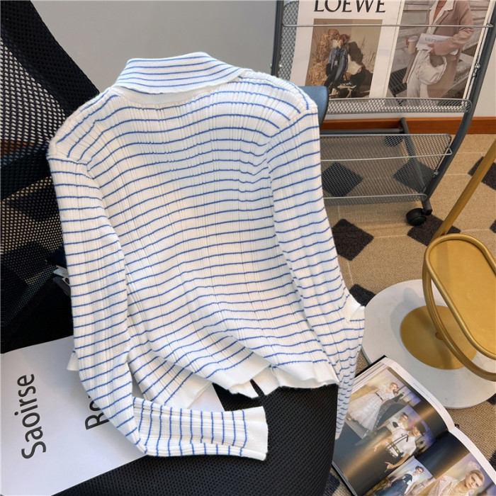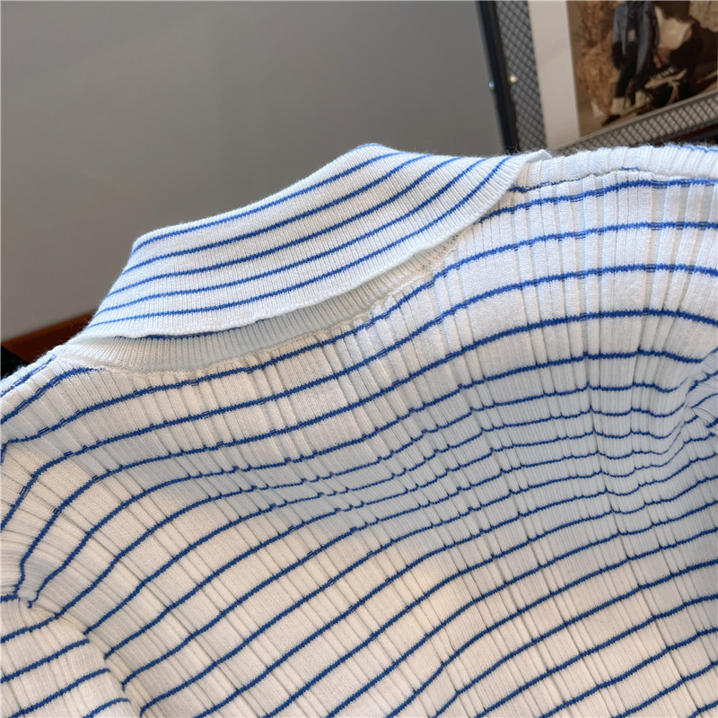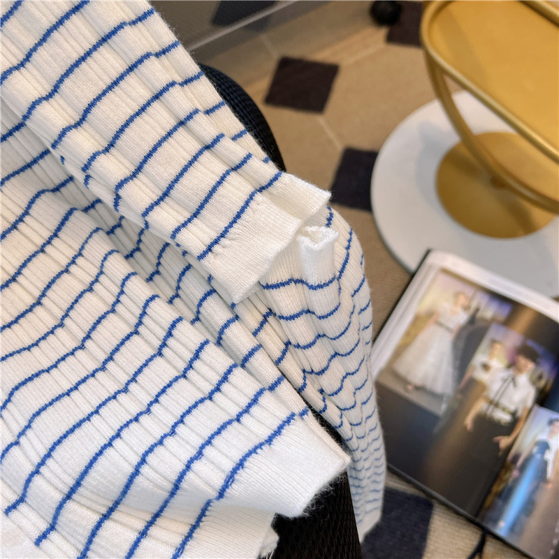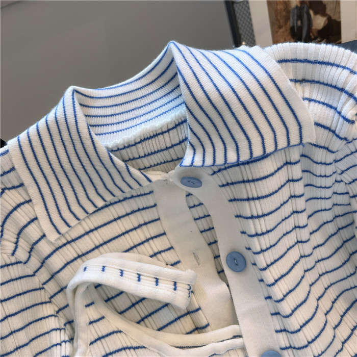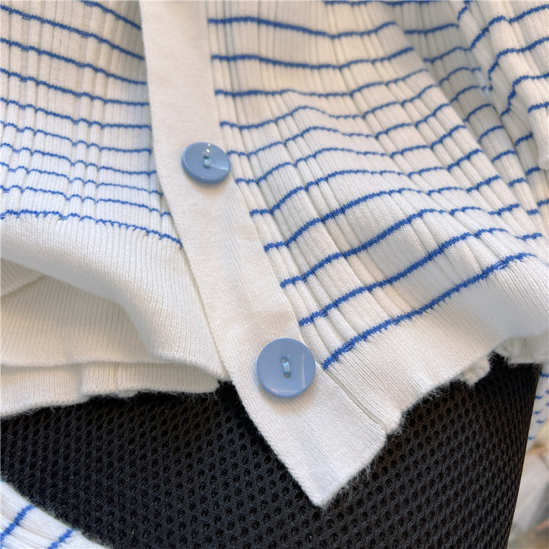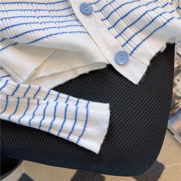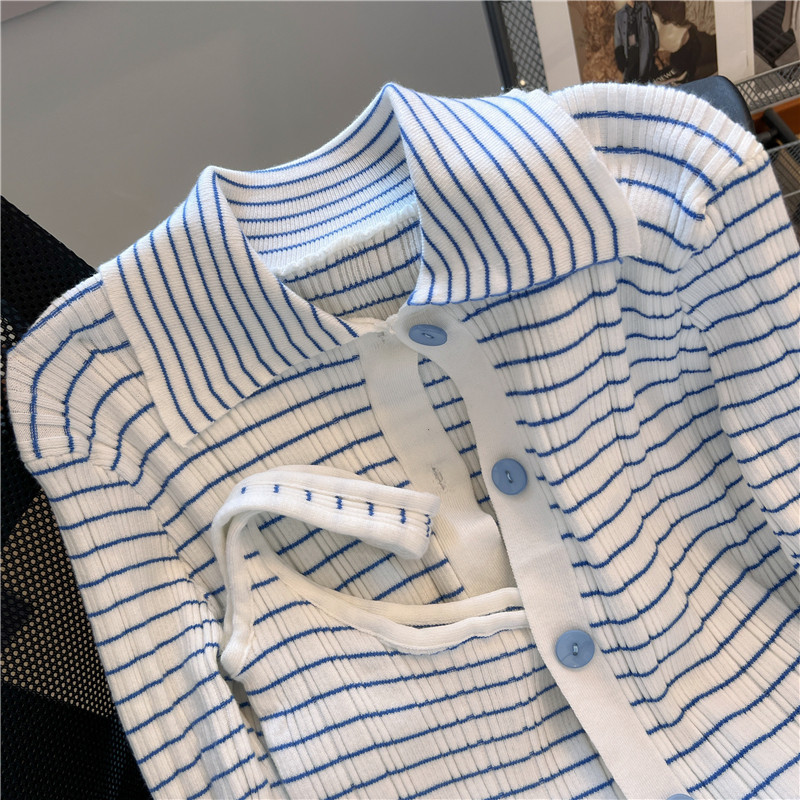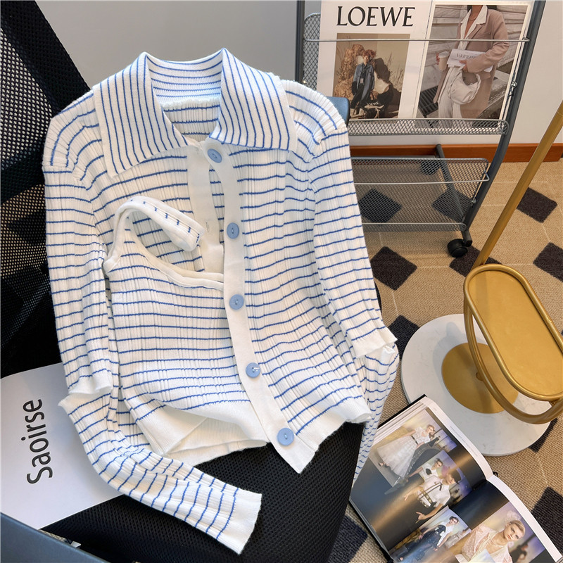 專櫃撤廻!條紋繙領針織開衫配無袖短款小背心女春季新款曡穿套裝