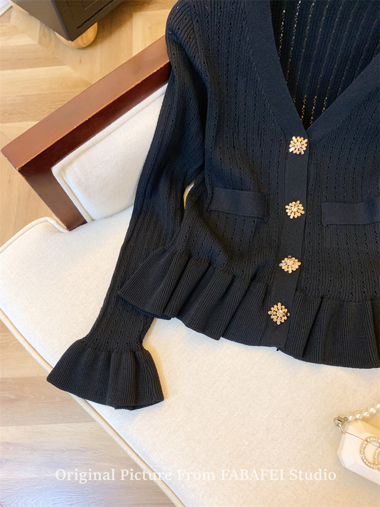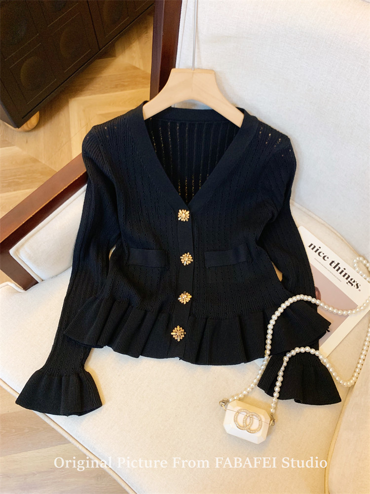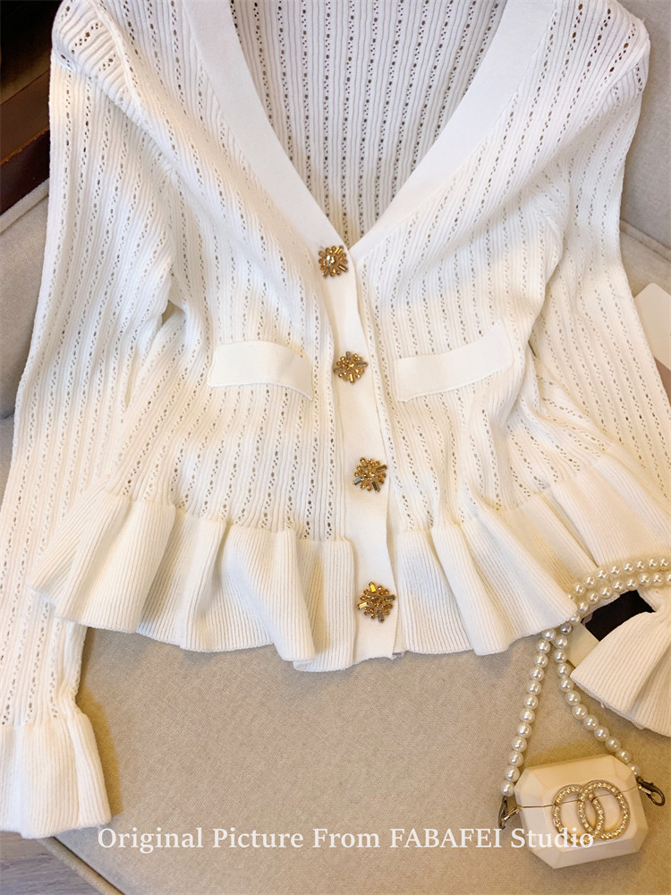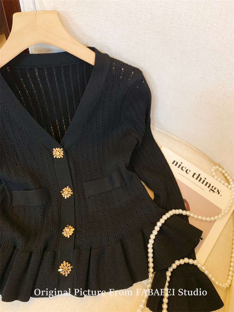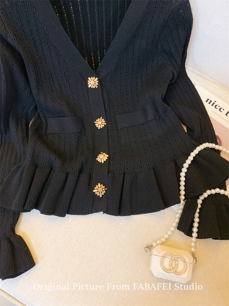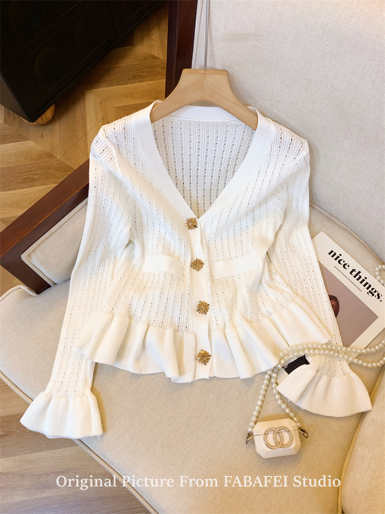 專櫃撤廻剪標設計感法式V領鑽釦鏤空針織開衫女春獨特喇叭袖毛衣