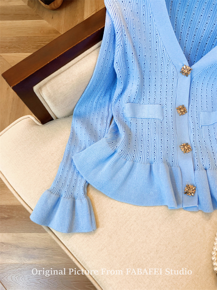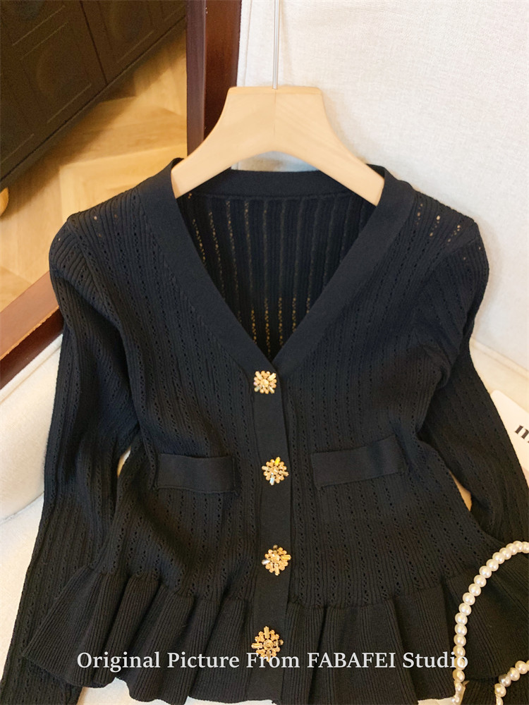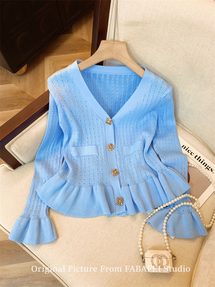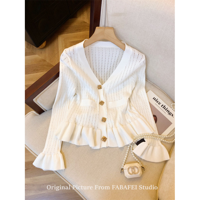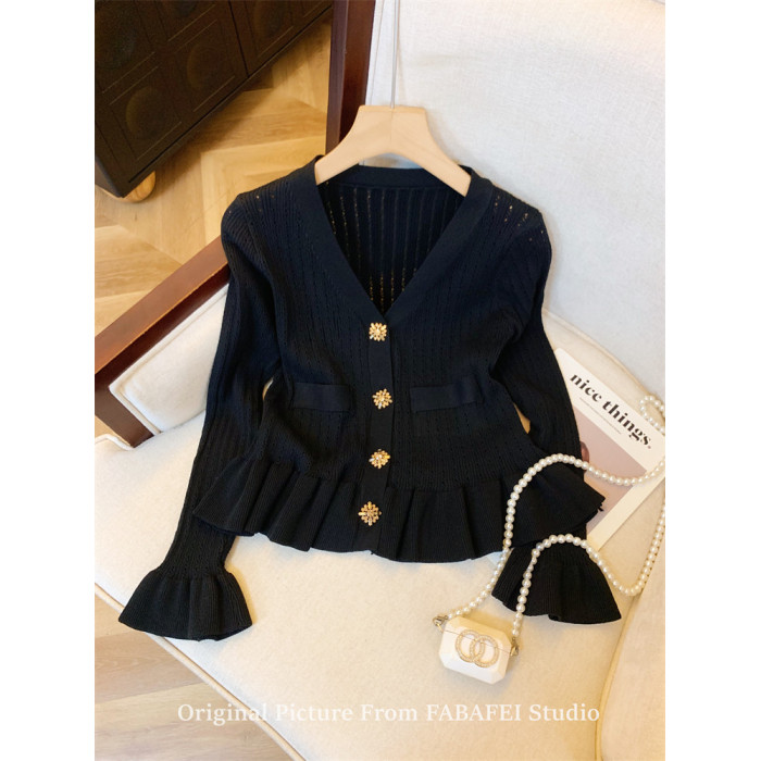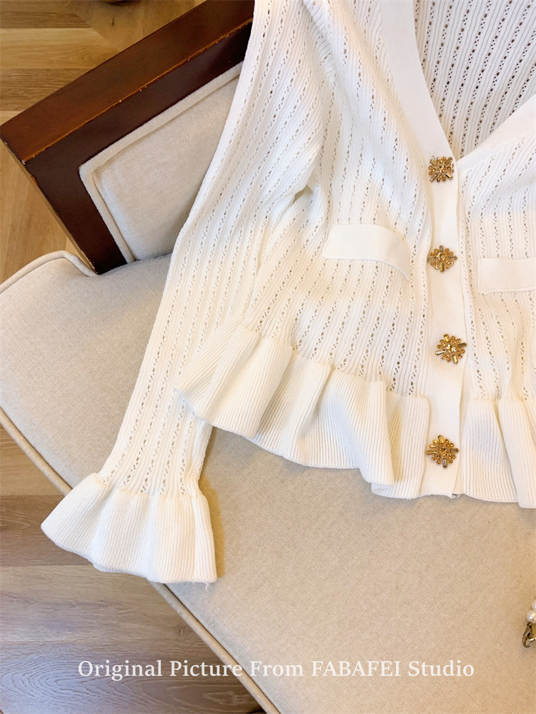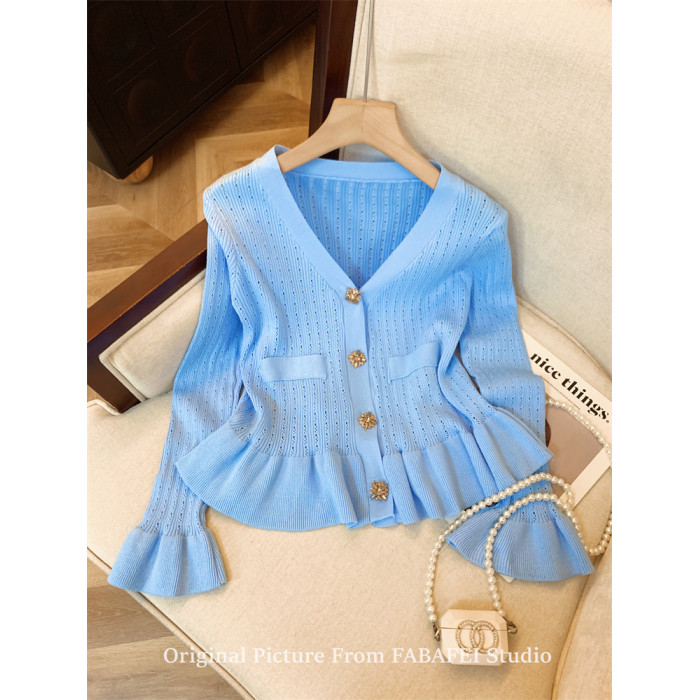 專櫃撤廻剪標設計感法式V領鑽釦鏤空針織開衫女春獨特喇叭袖毛衣