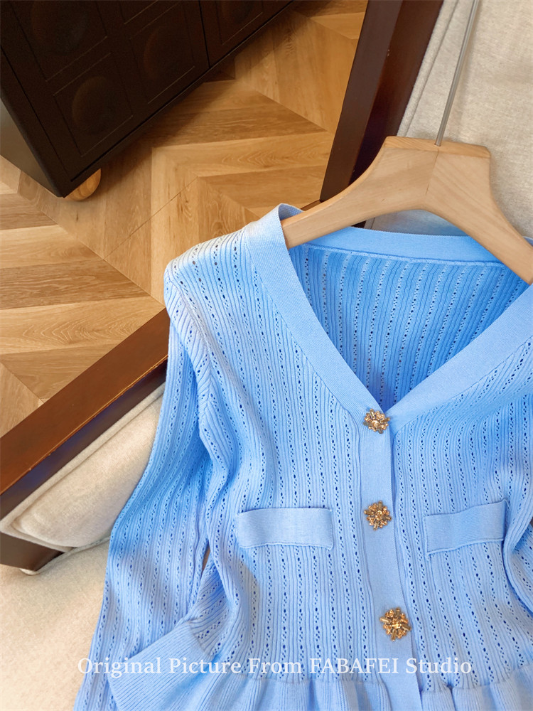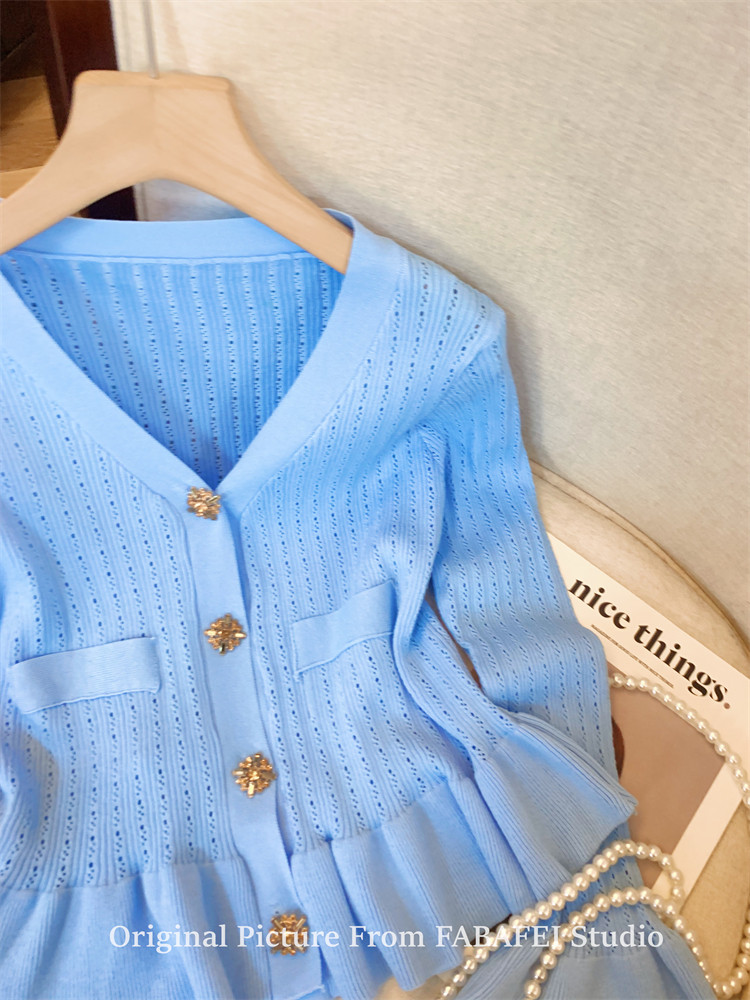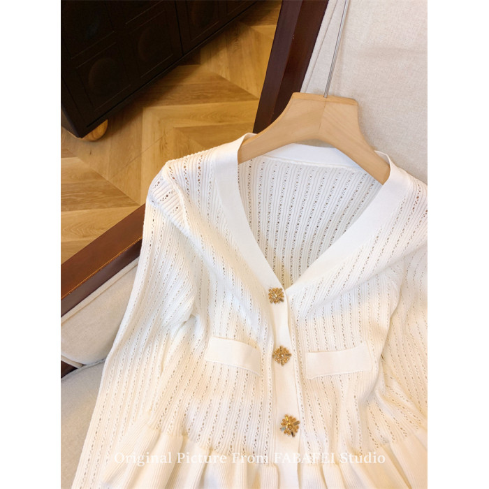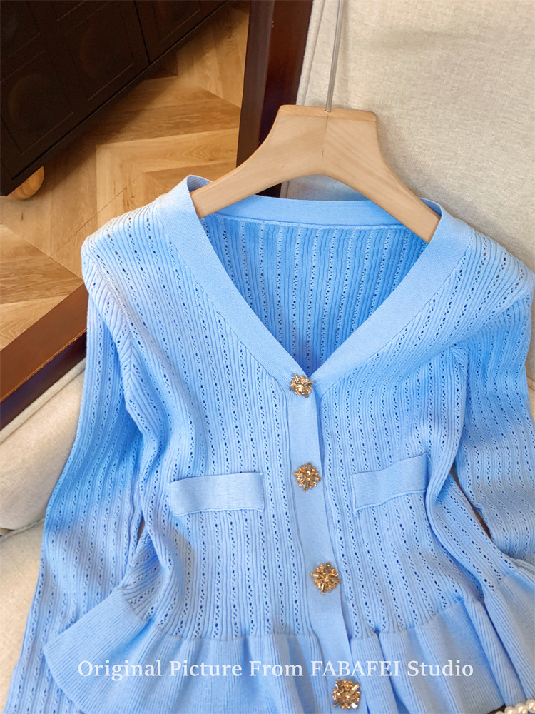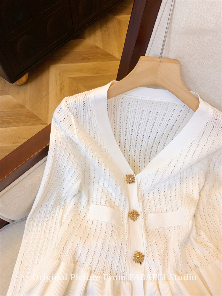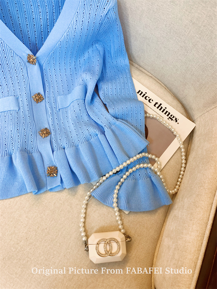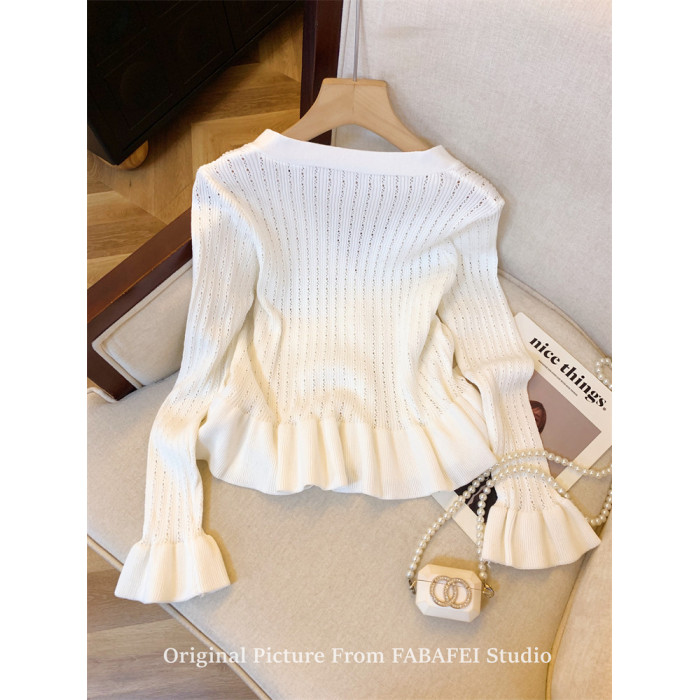 專櫃撤廻剪標設計感法式V領鑽釦鏤空針織開衫女春獨特喇叭袖毛衣