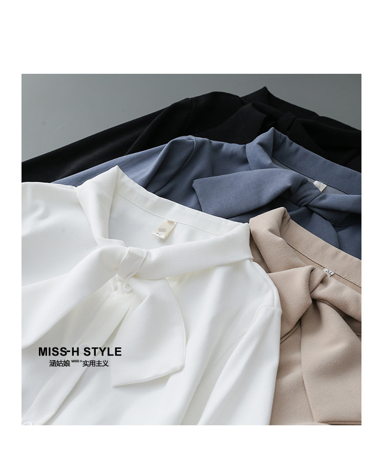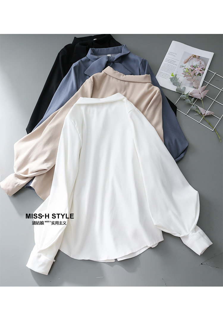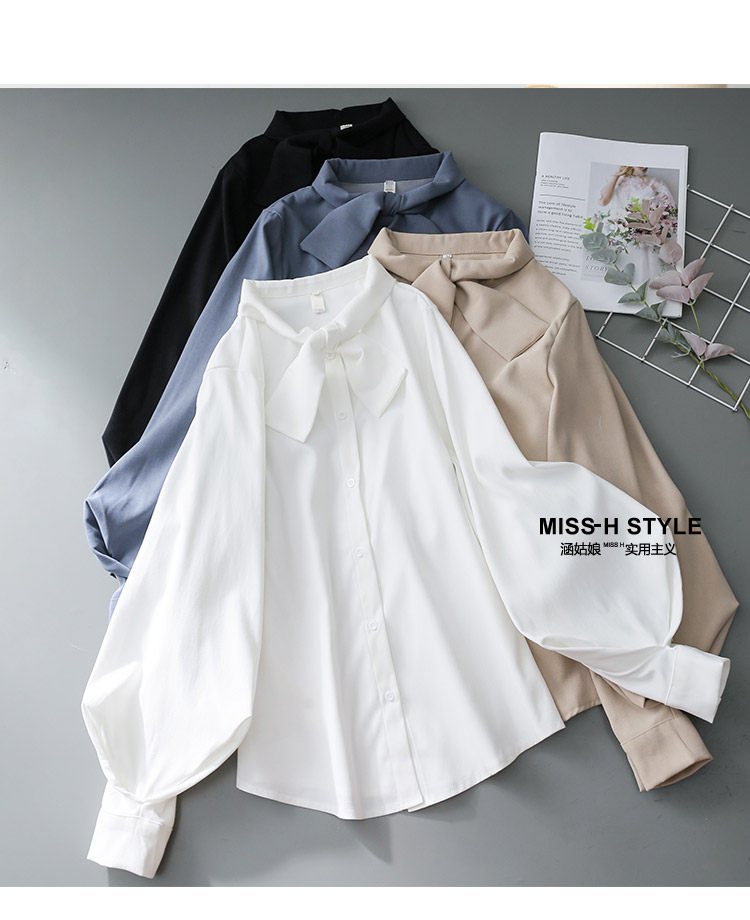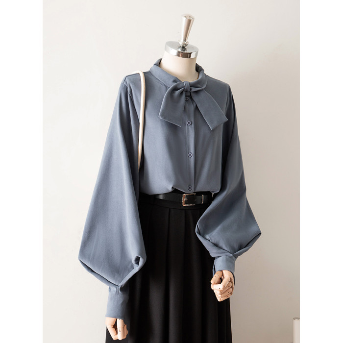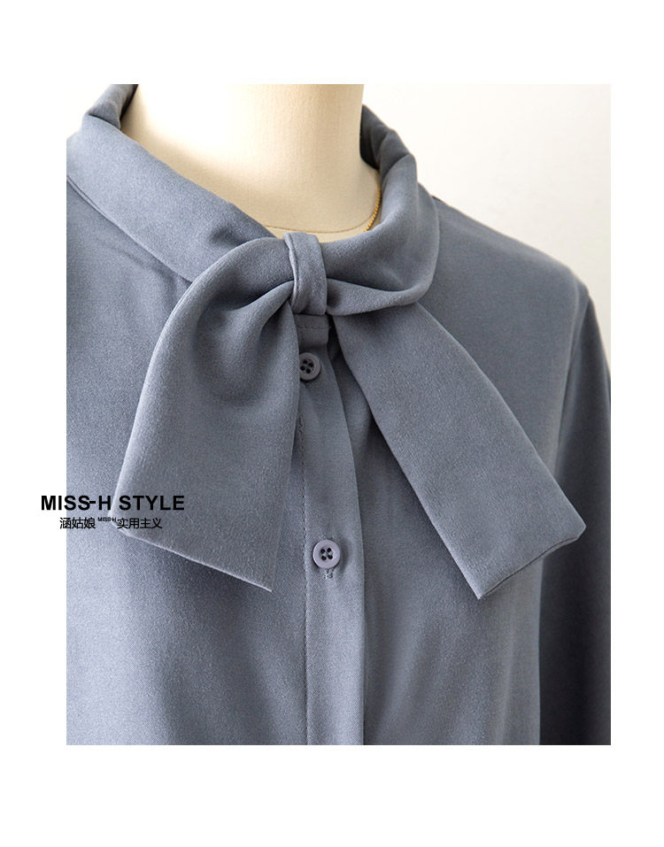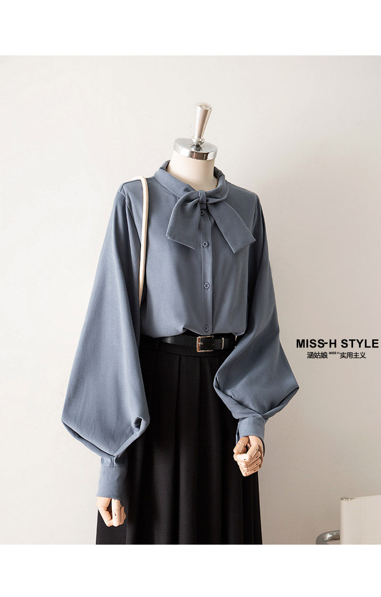 法式復古蝴蝶結寬鬆長袖襯衫女秋新款霧藍色上衣磨毛燈籠袖白襯衣