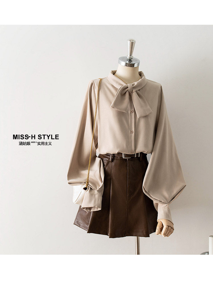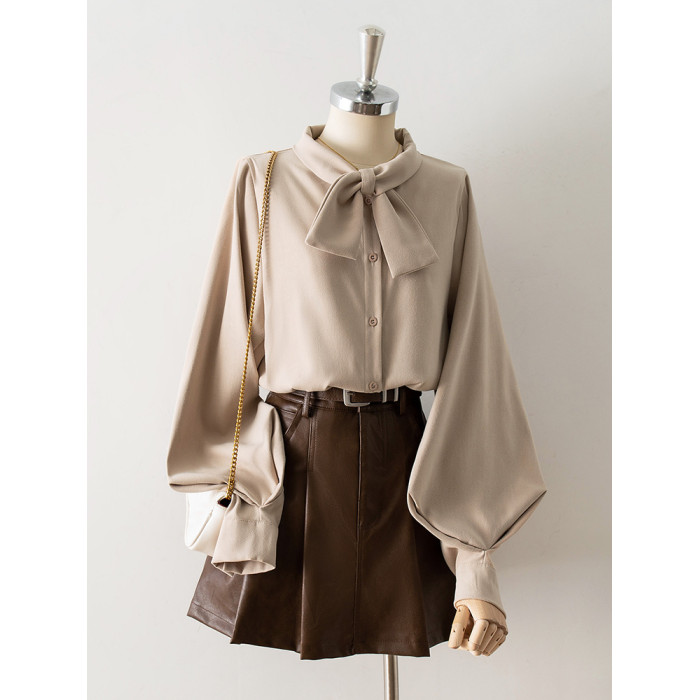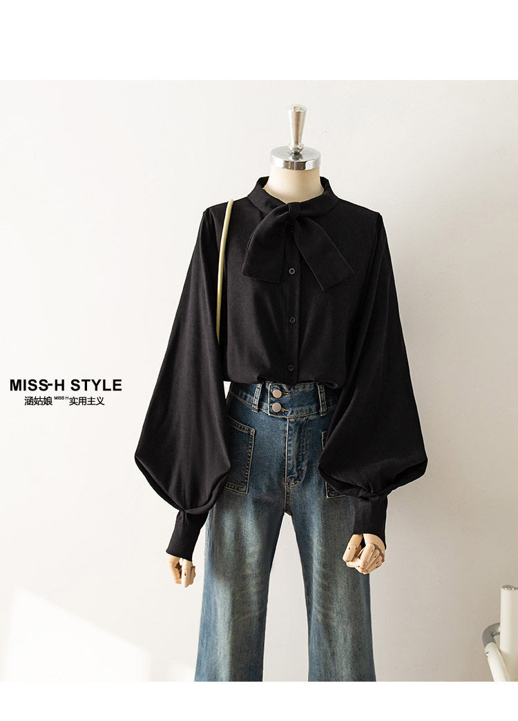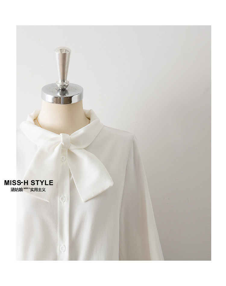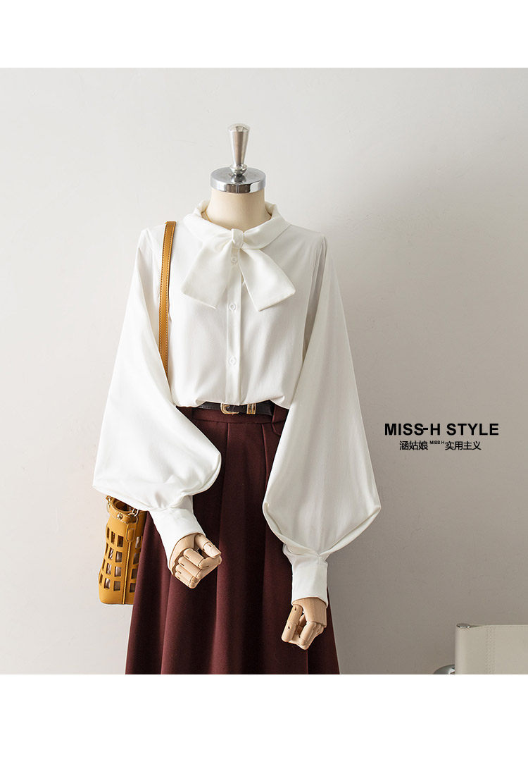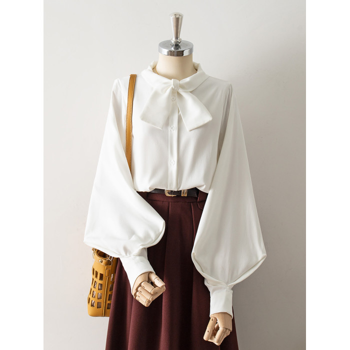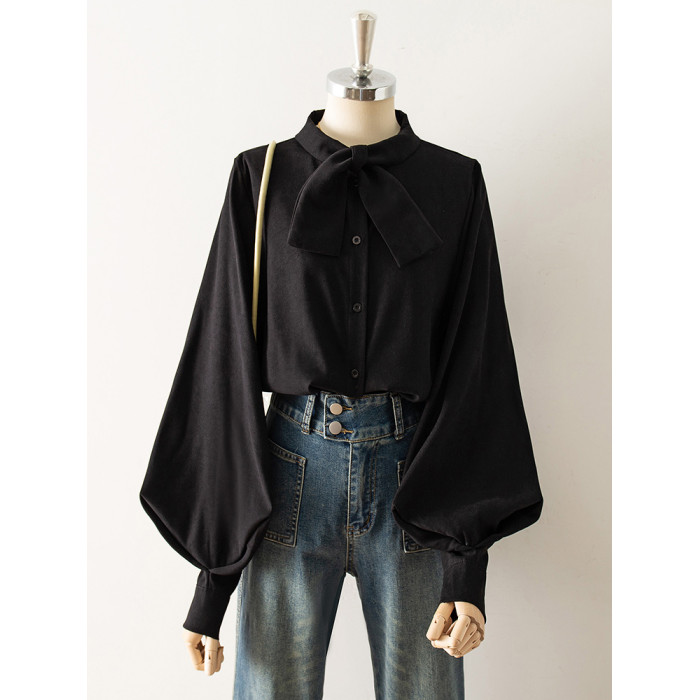 法式復古蝴蝶結寬鬆長袖襯衫女秋新款霧藍色上衣磨毛燈籠袖白襯衣