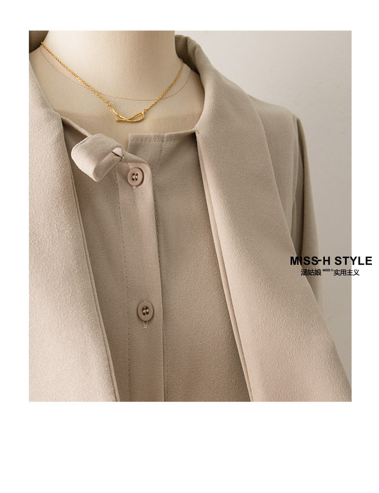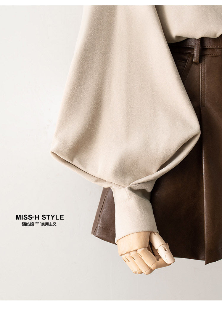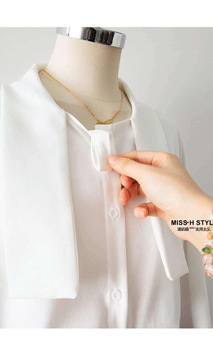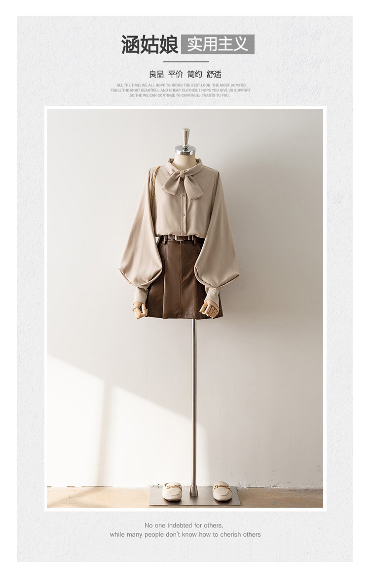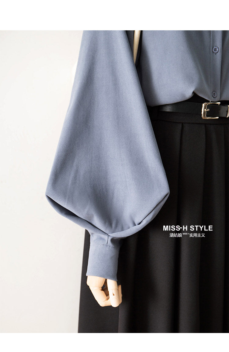 法式復古蝴蝶結寬鬆長袖襯衫女秋新款霧藍色上衣磨毛燈籠袖白襯衣