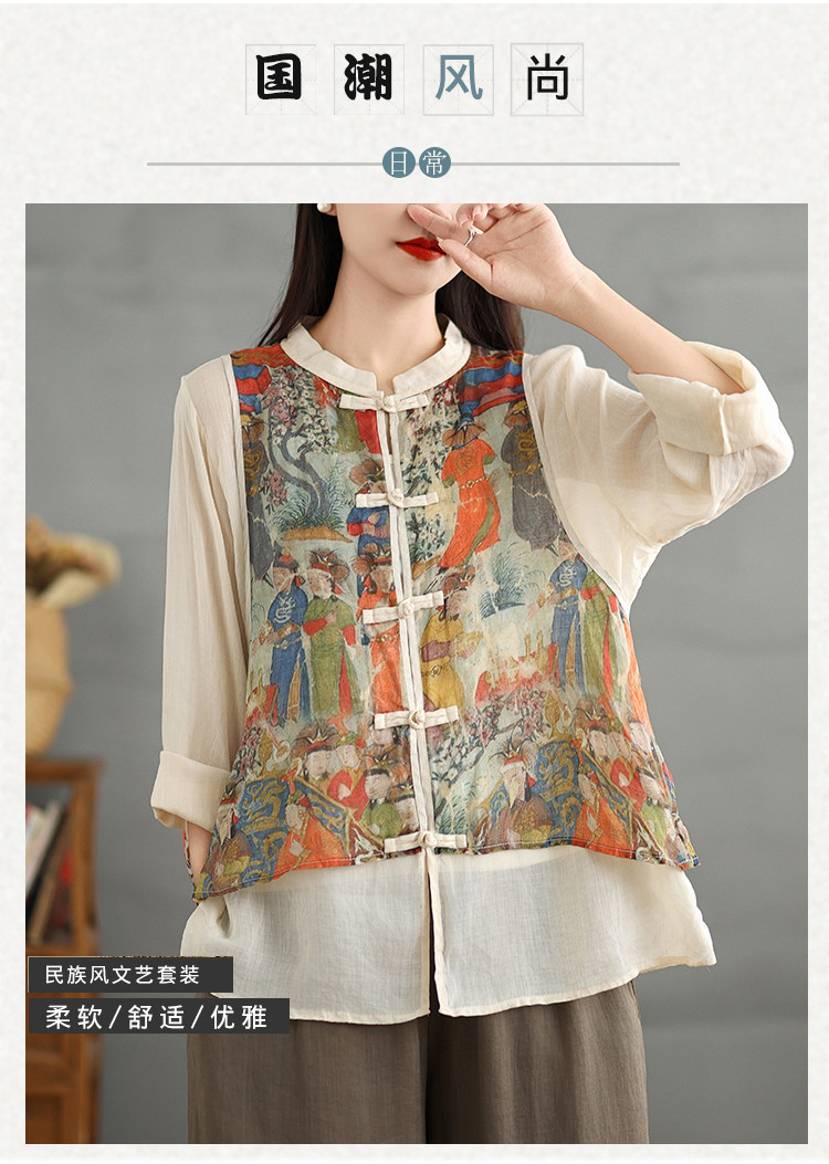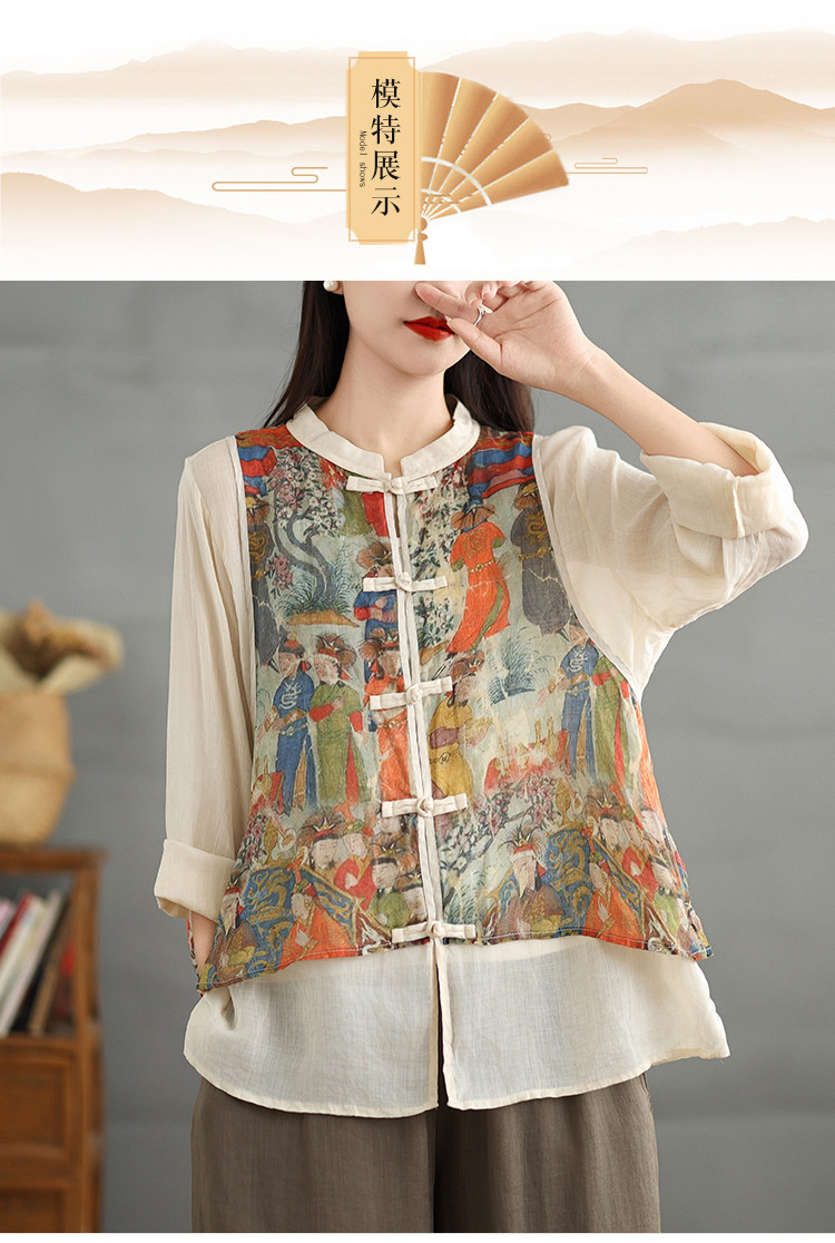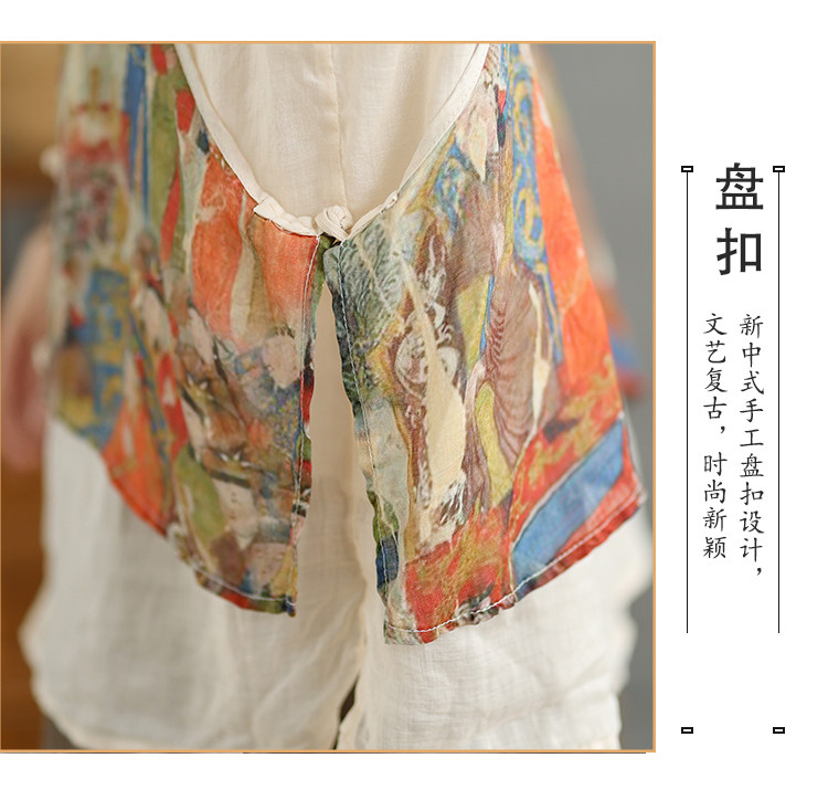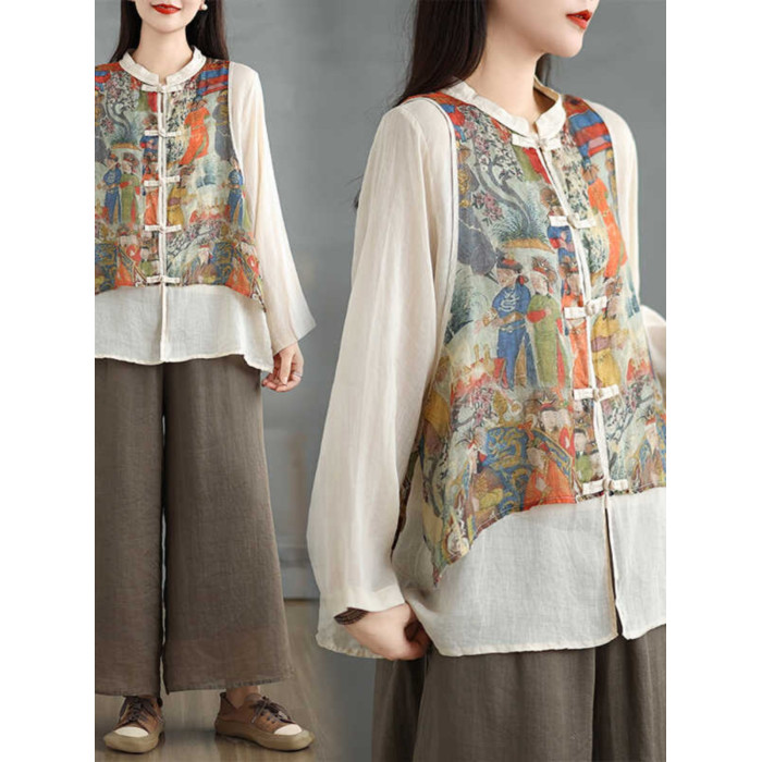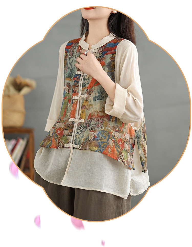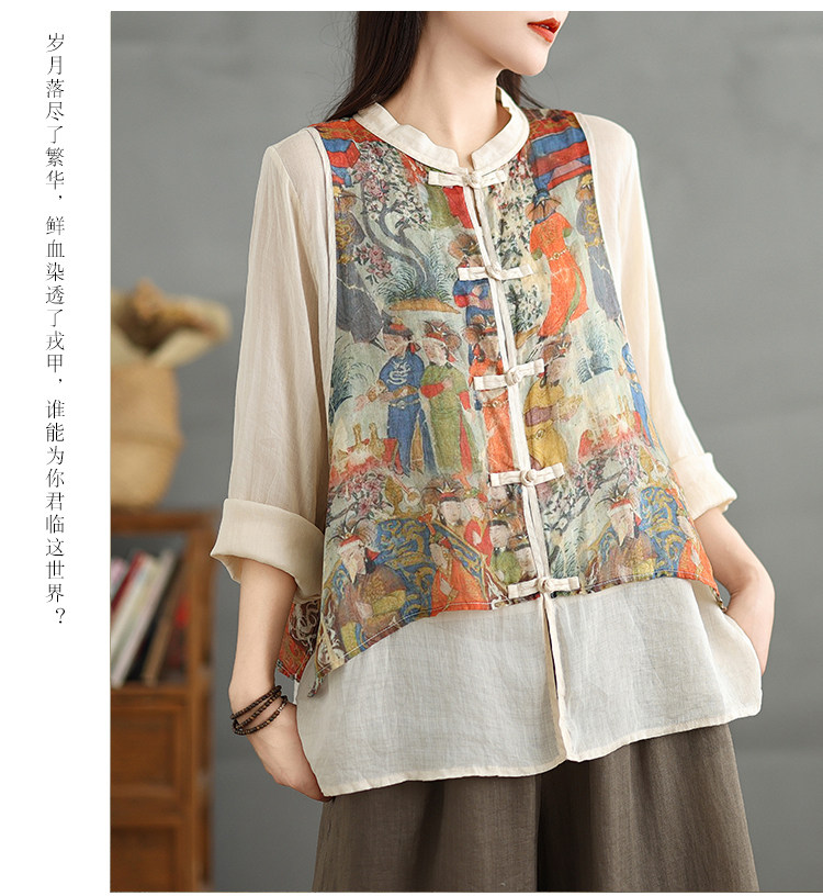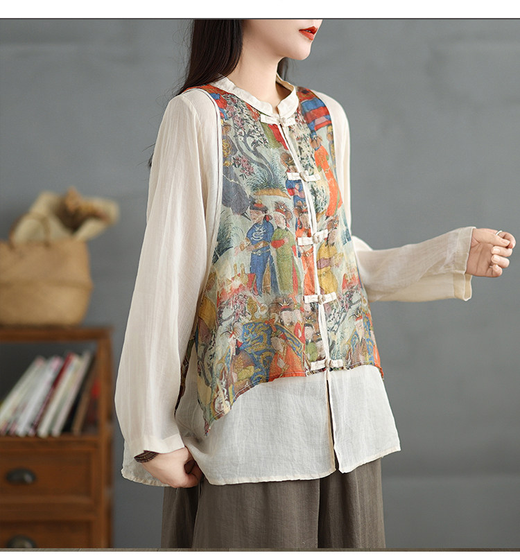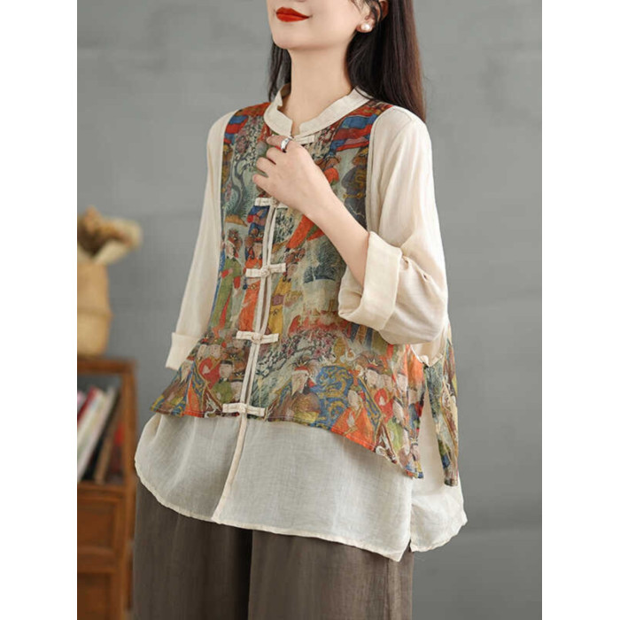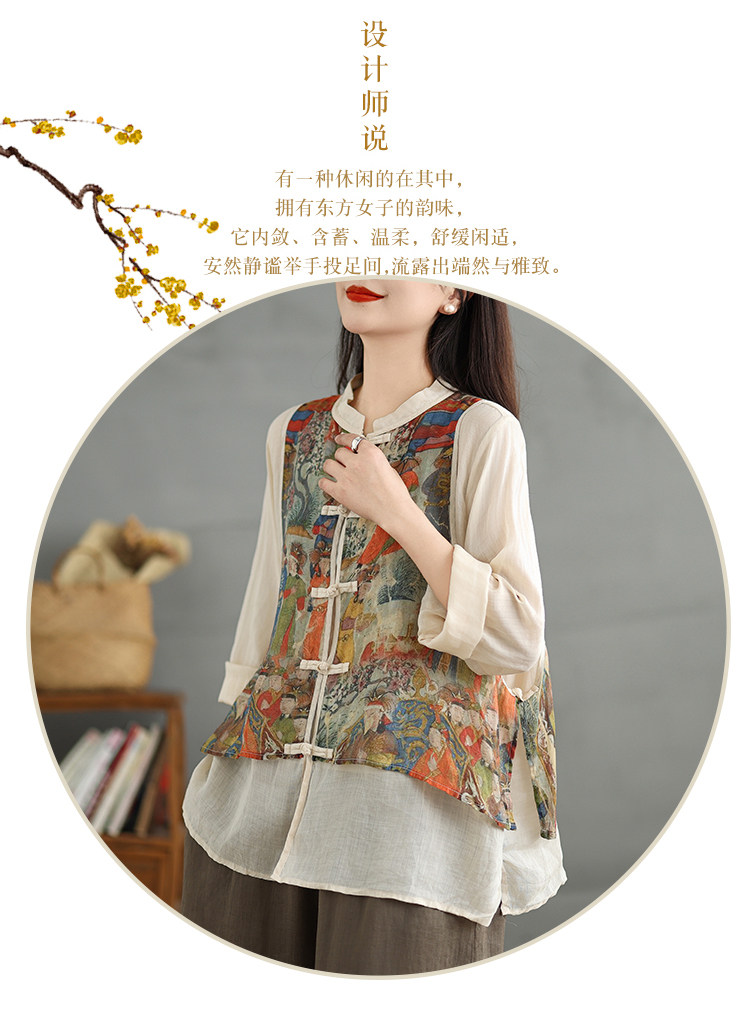商場專櫃撤櫃復古亞麻盤釦拼接假兩件襯衫國風印花長袖打底上衣女