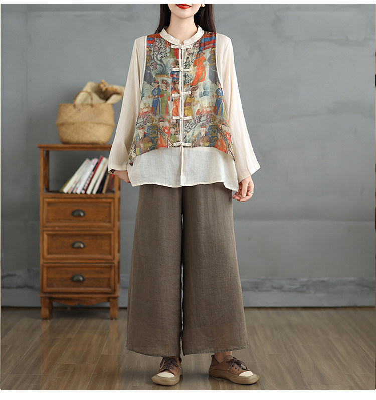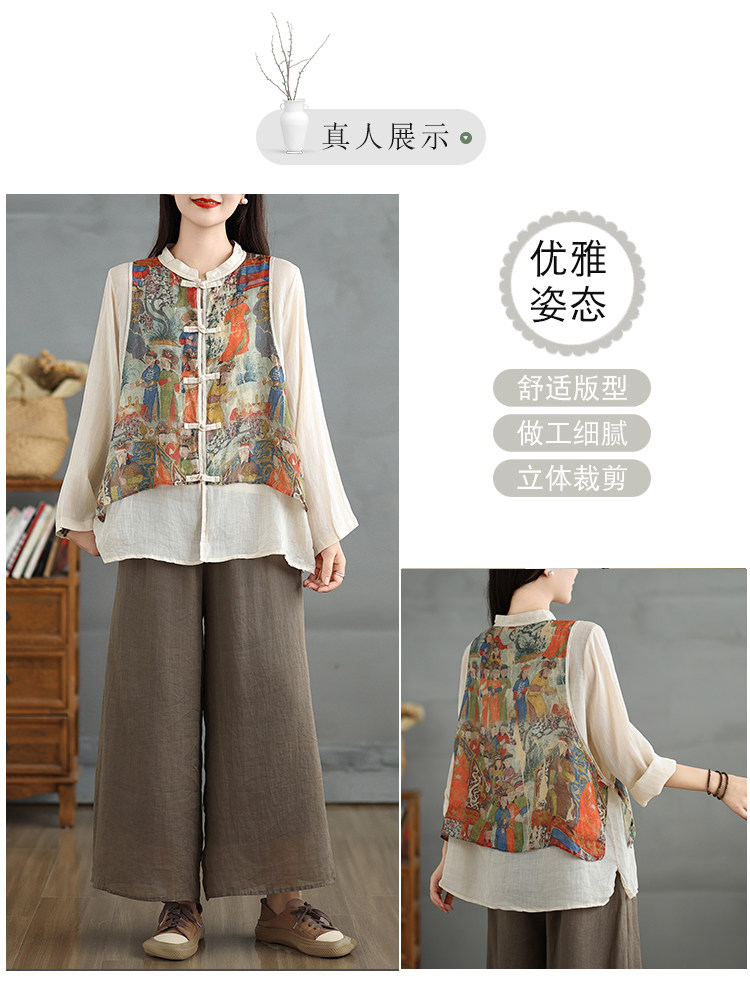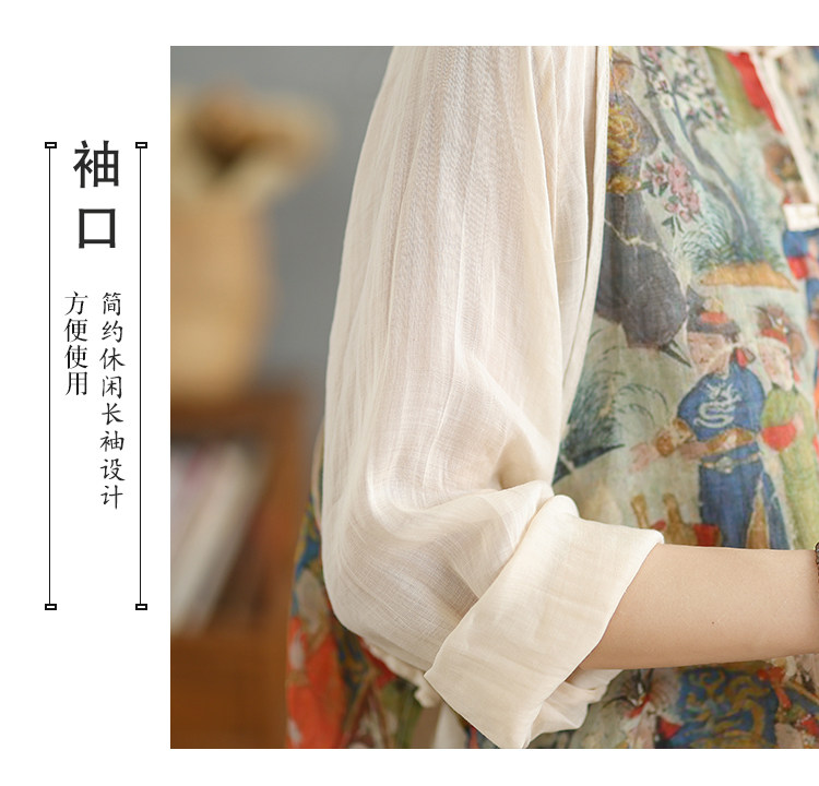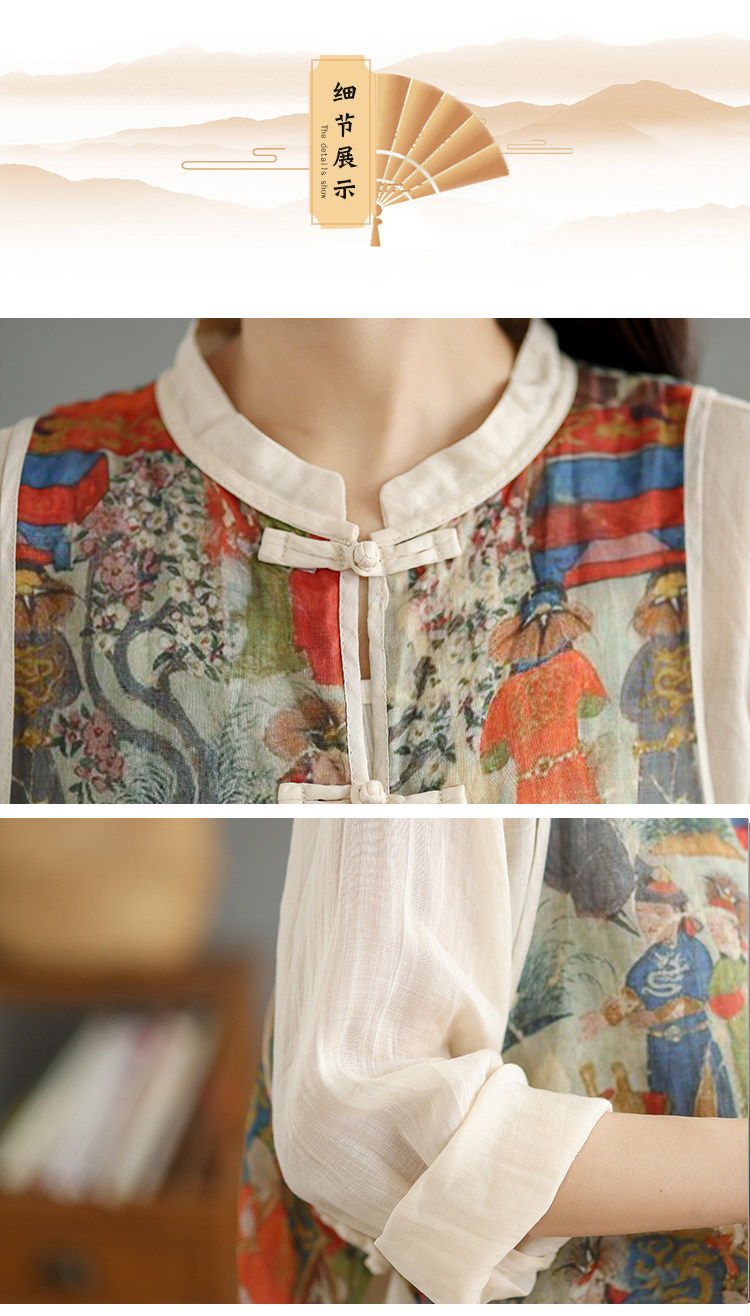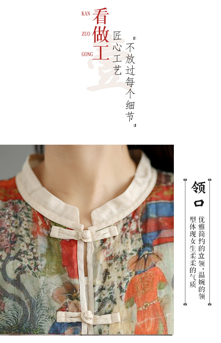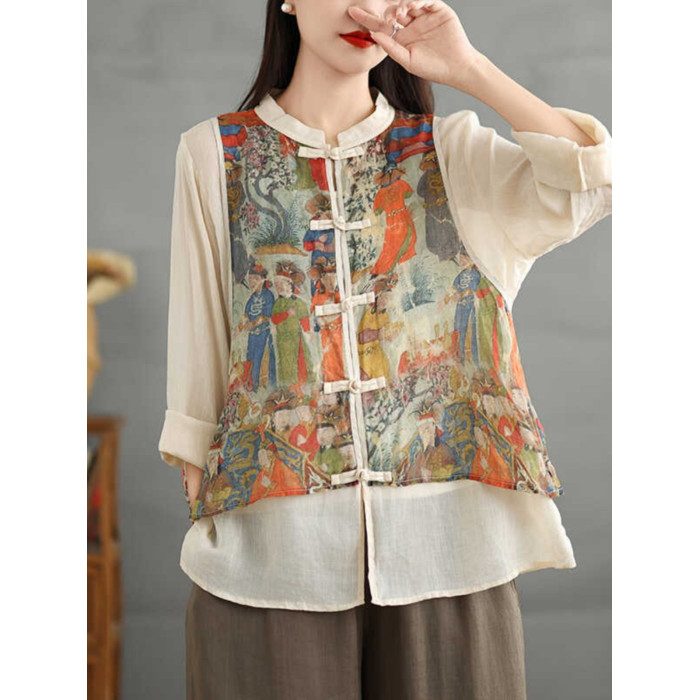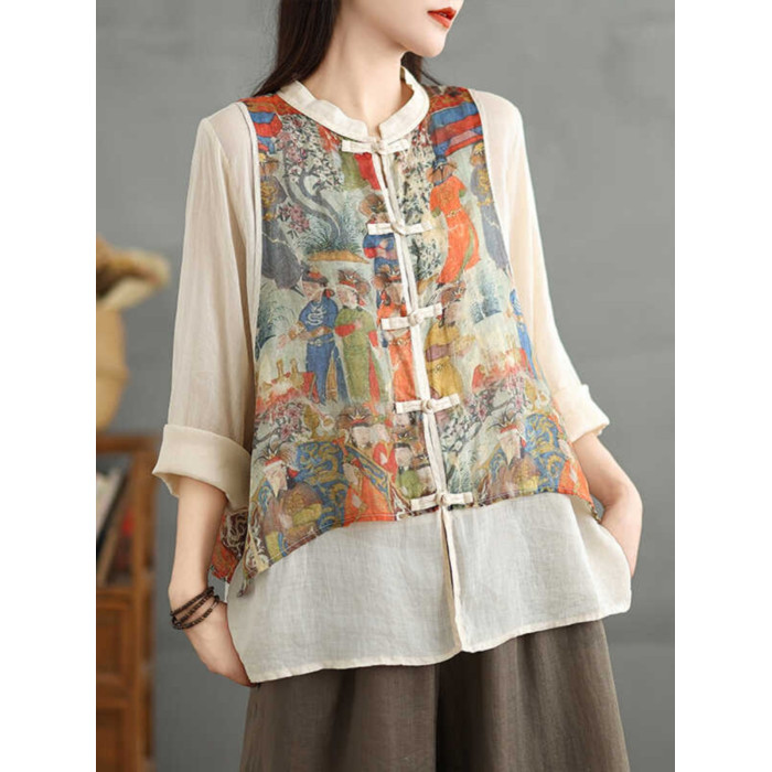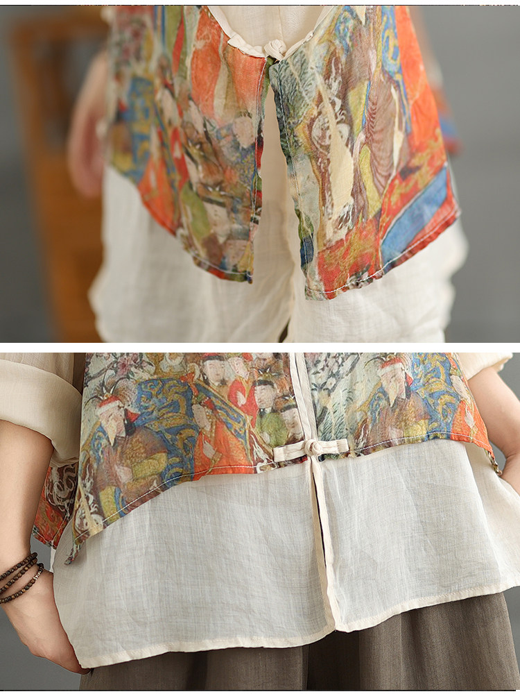 商場專櫃撤櫃復古亞麻盤釦拼接假兩件襯衫國風印花長袖打底上衣女
