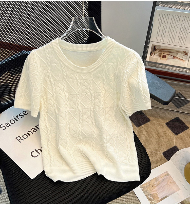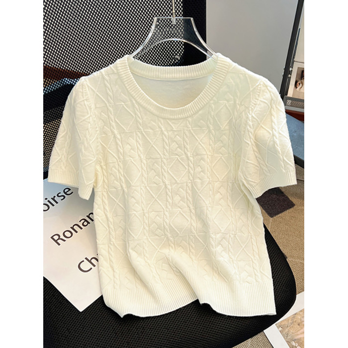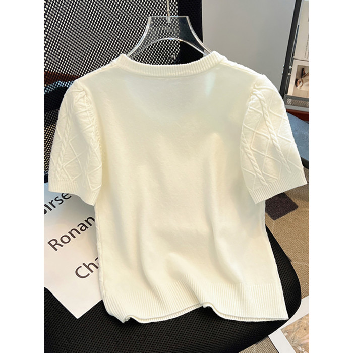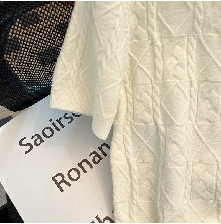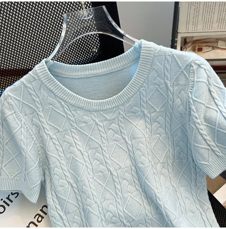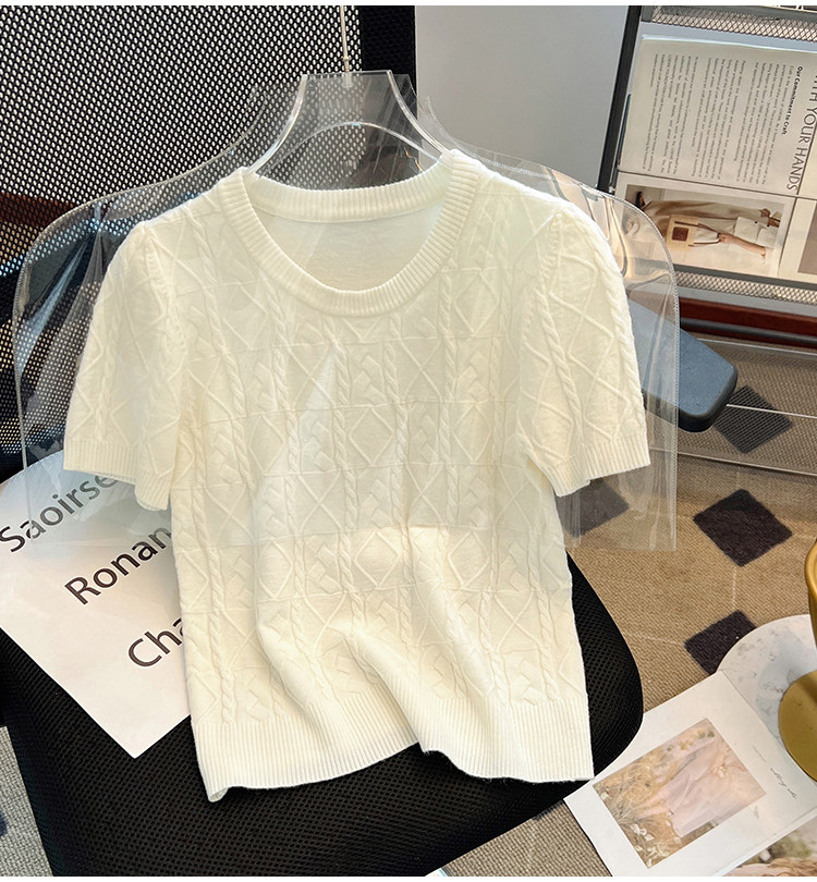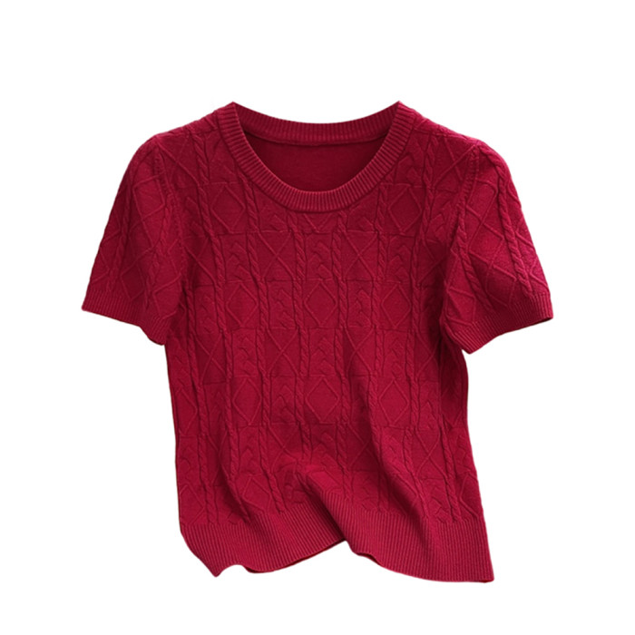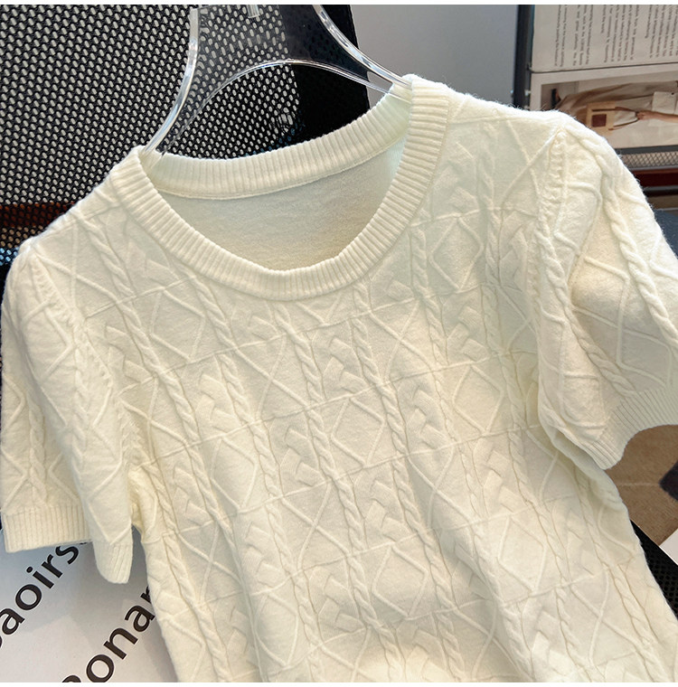 專櫃撤廻剪標復古螺紋圓領短袖針織衫女夏季新款百搭收腰短款上衣