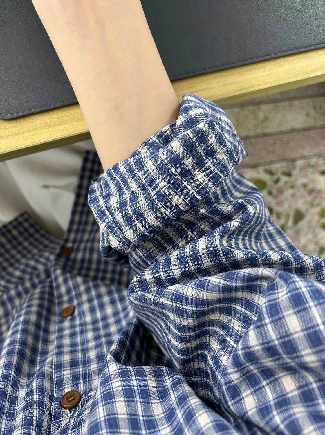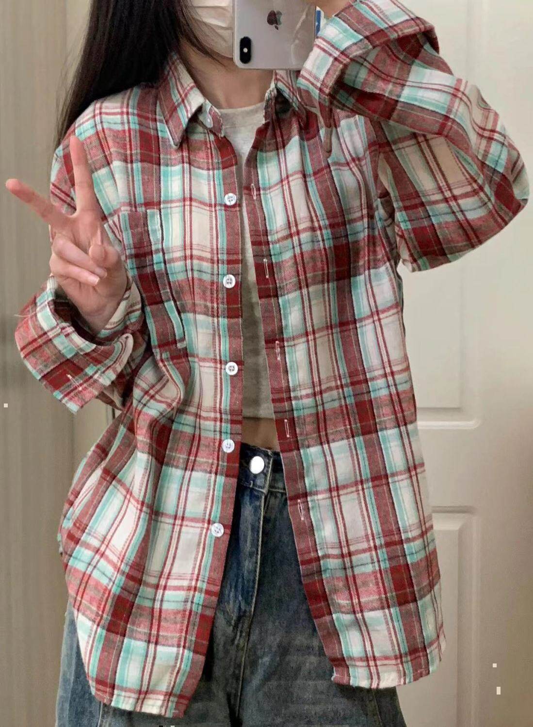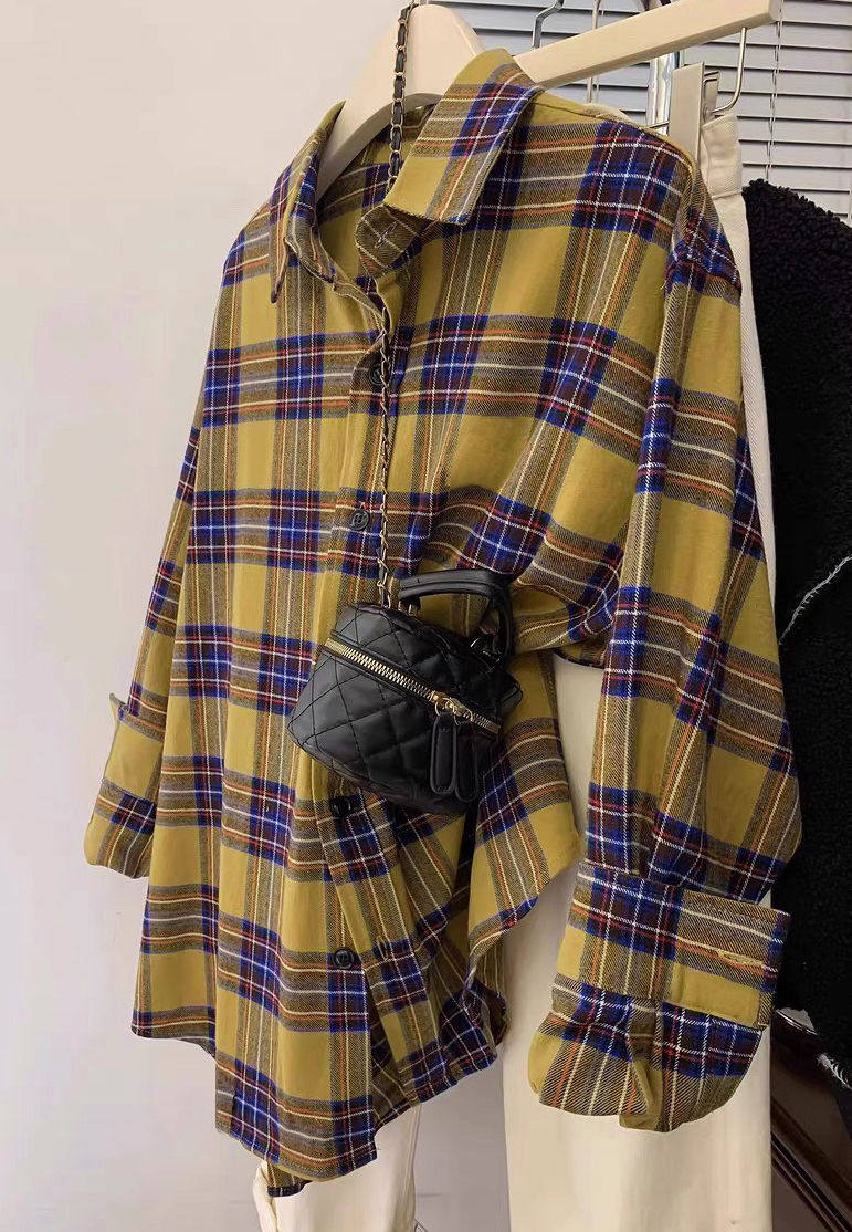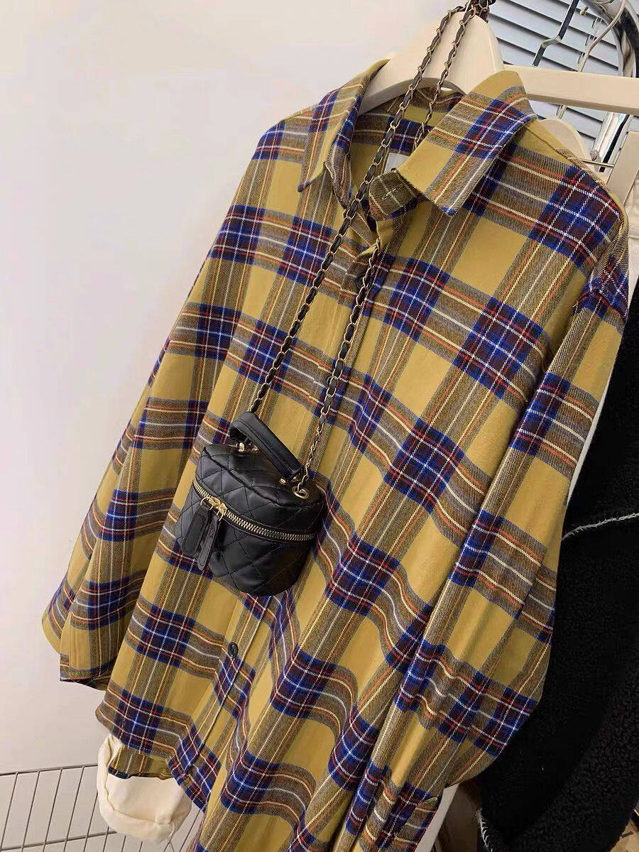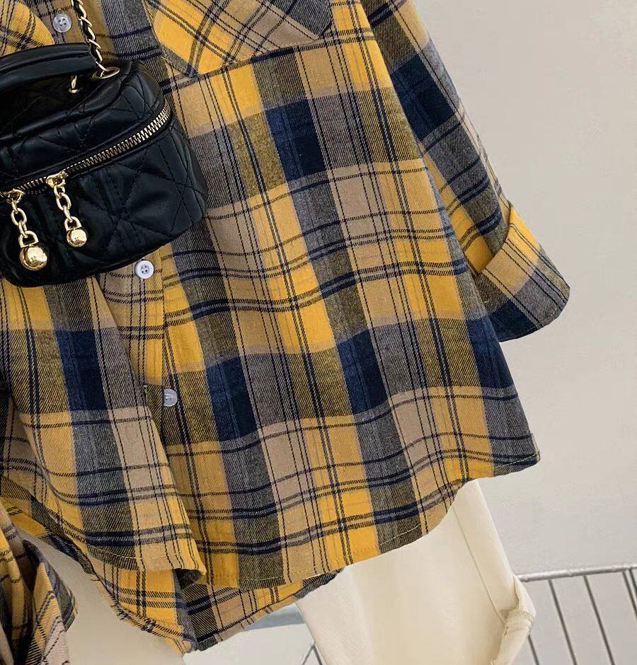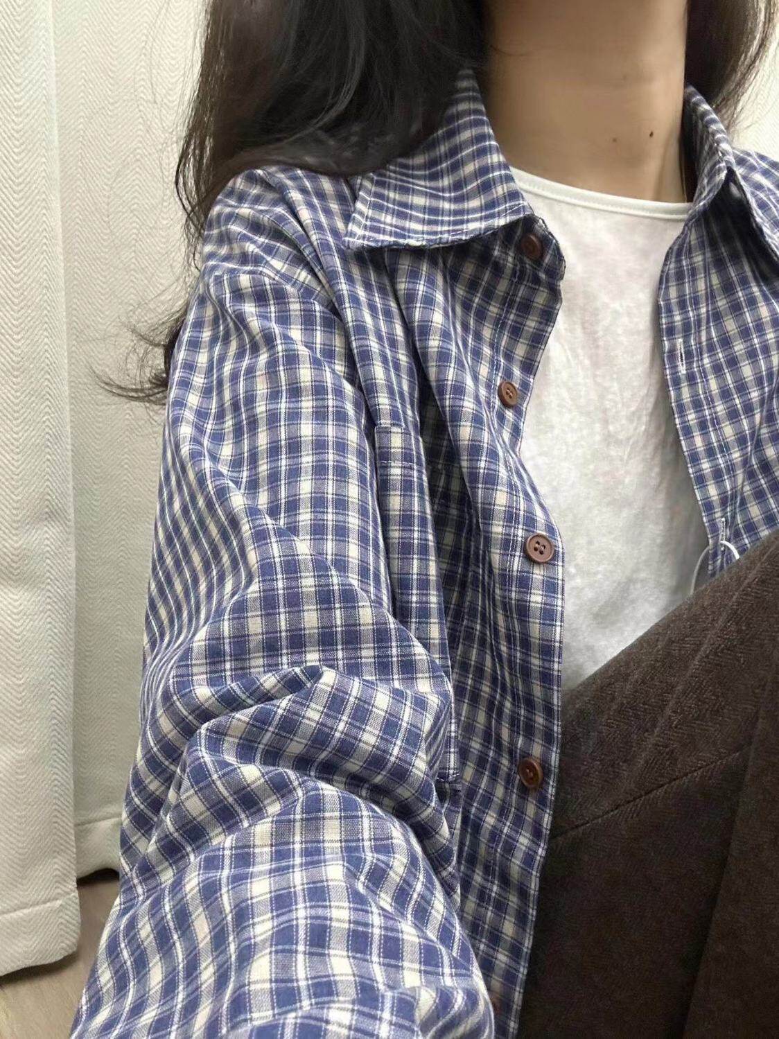 小個子韓系純棉格子襯衫女寬鬆慵懶風遮肉長袖襯衣外穿上衣ins潮