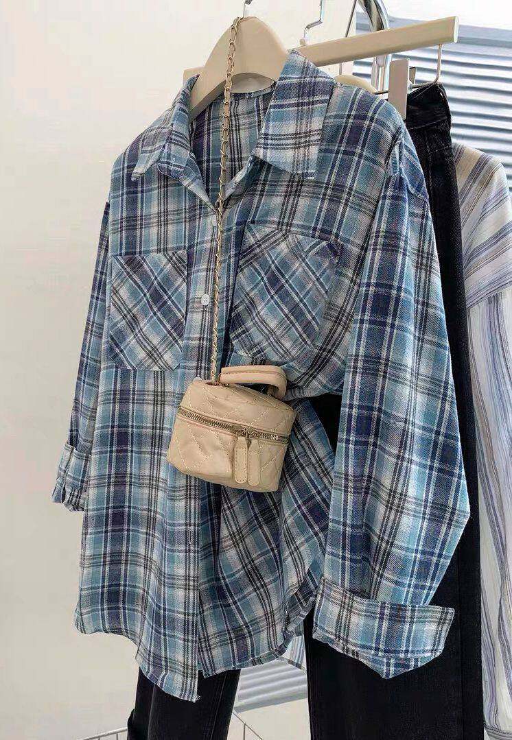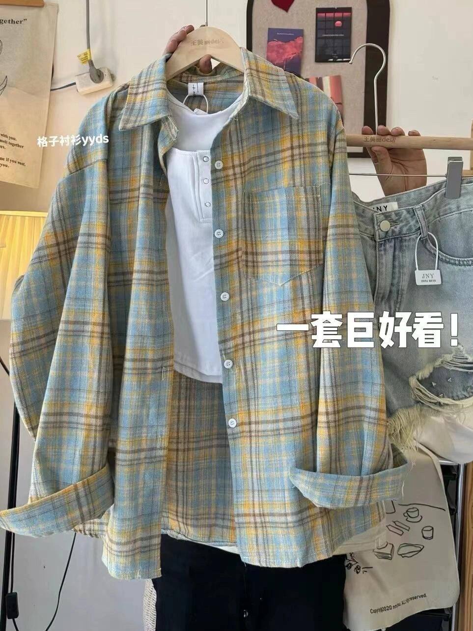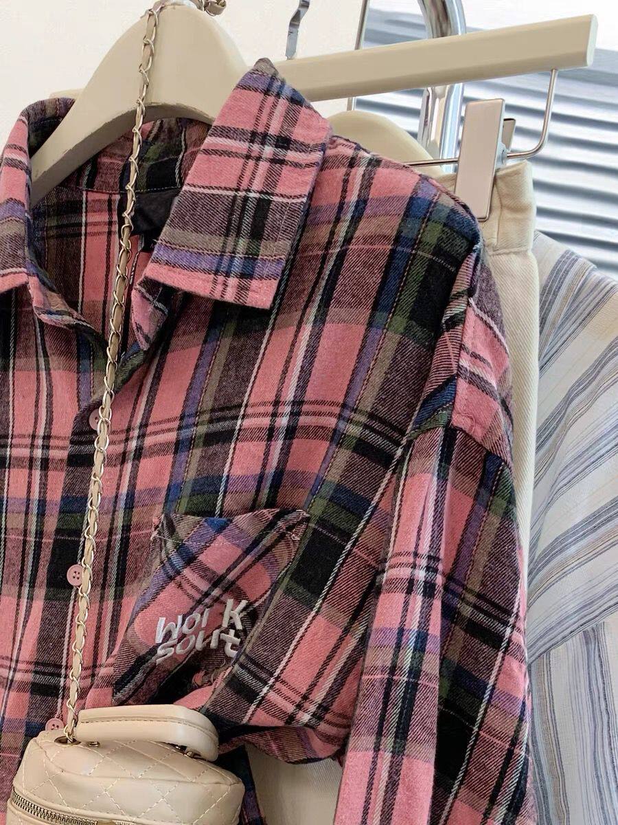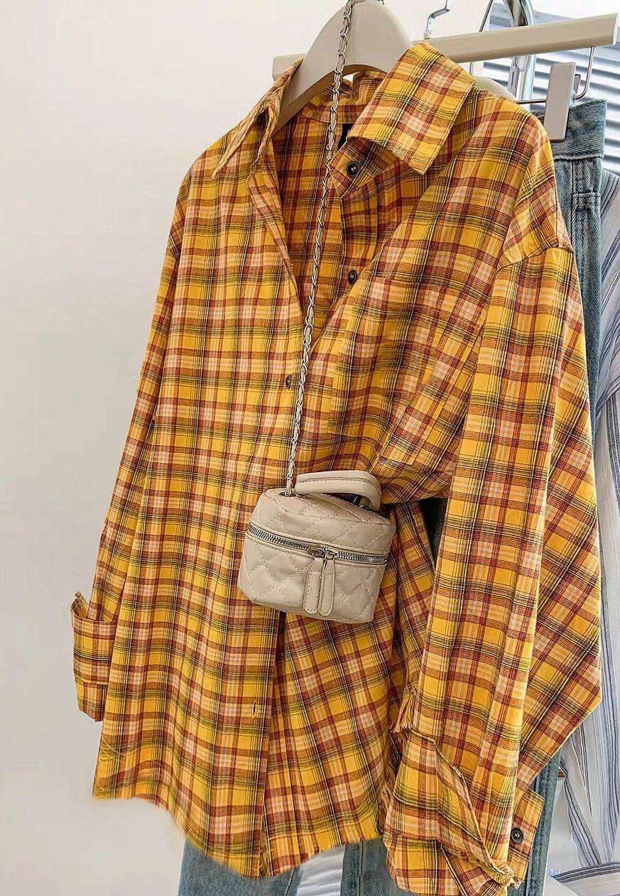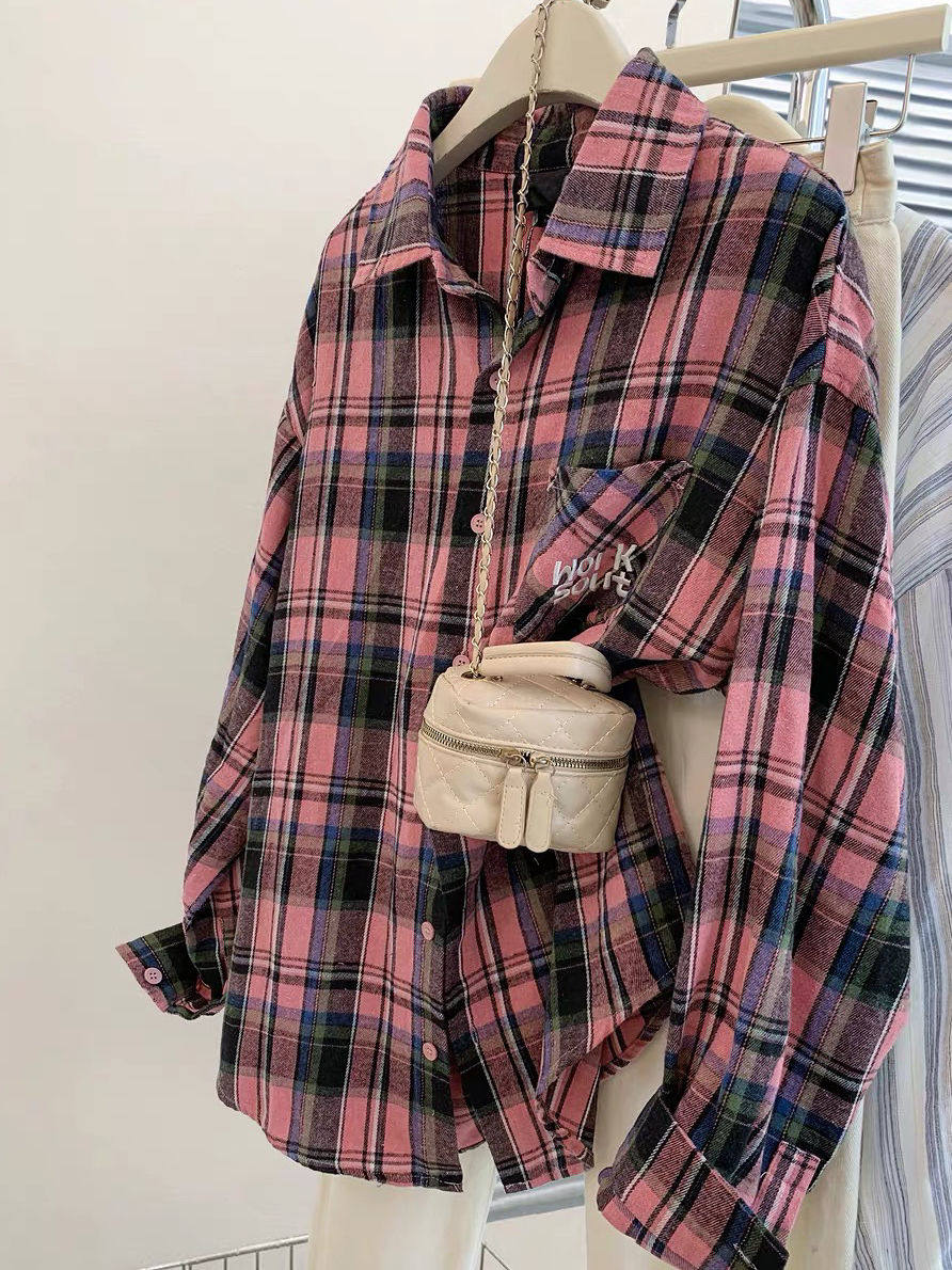小個子韓系純棉格子襯衫女寬鬆慵懶風遮肉長袖襯衣外穿上衣ins潮