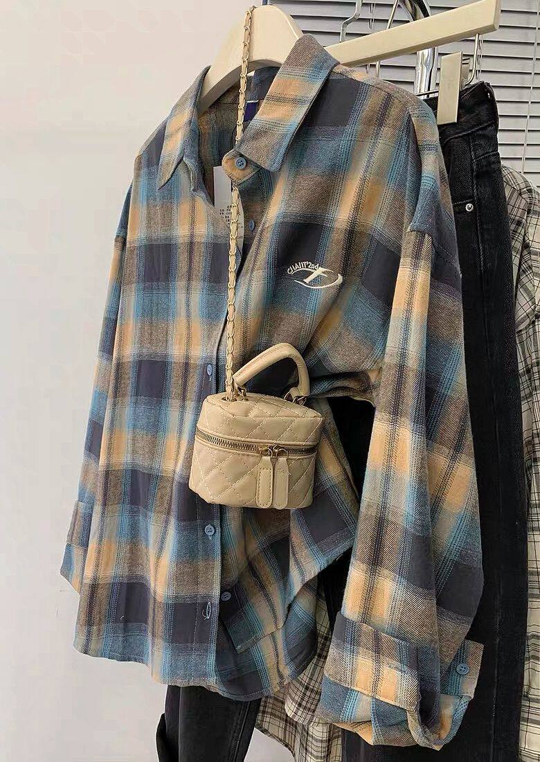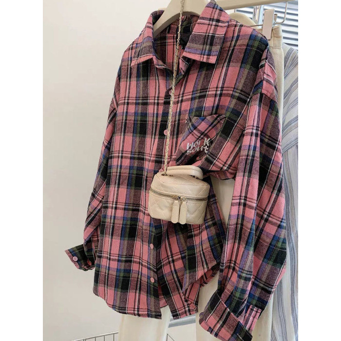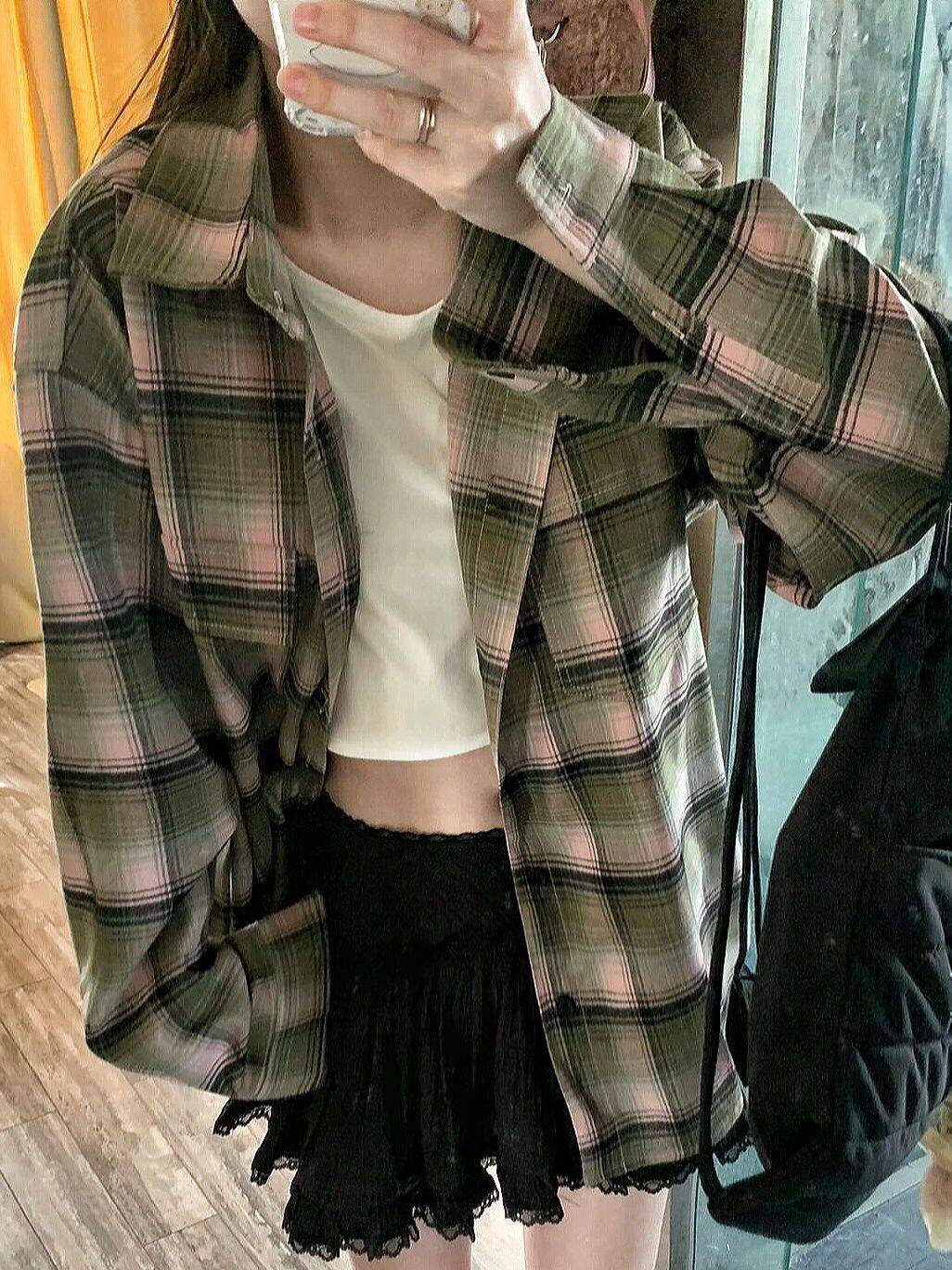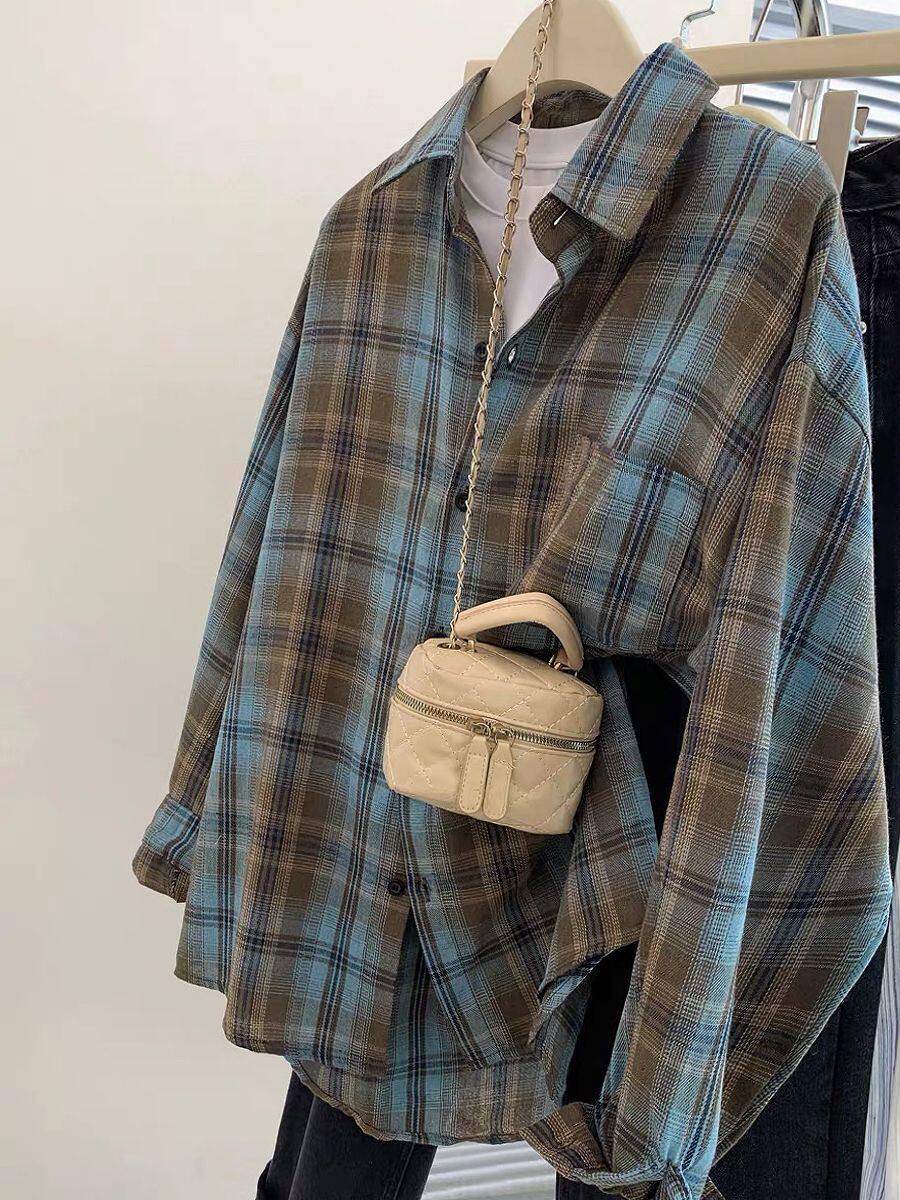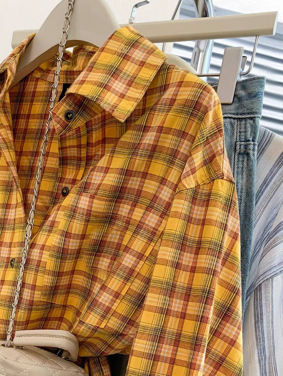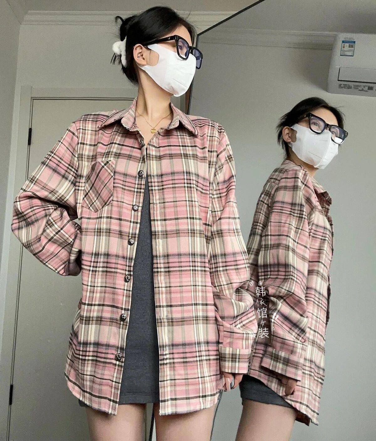 小個子韓系純棉格子襯衫女寬鬆慵懶風遮肉長袖襯衣外穿上衣ins潮