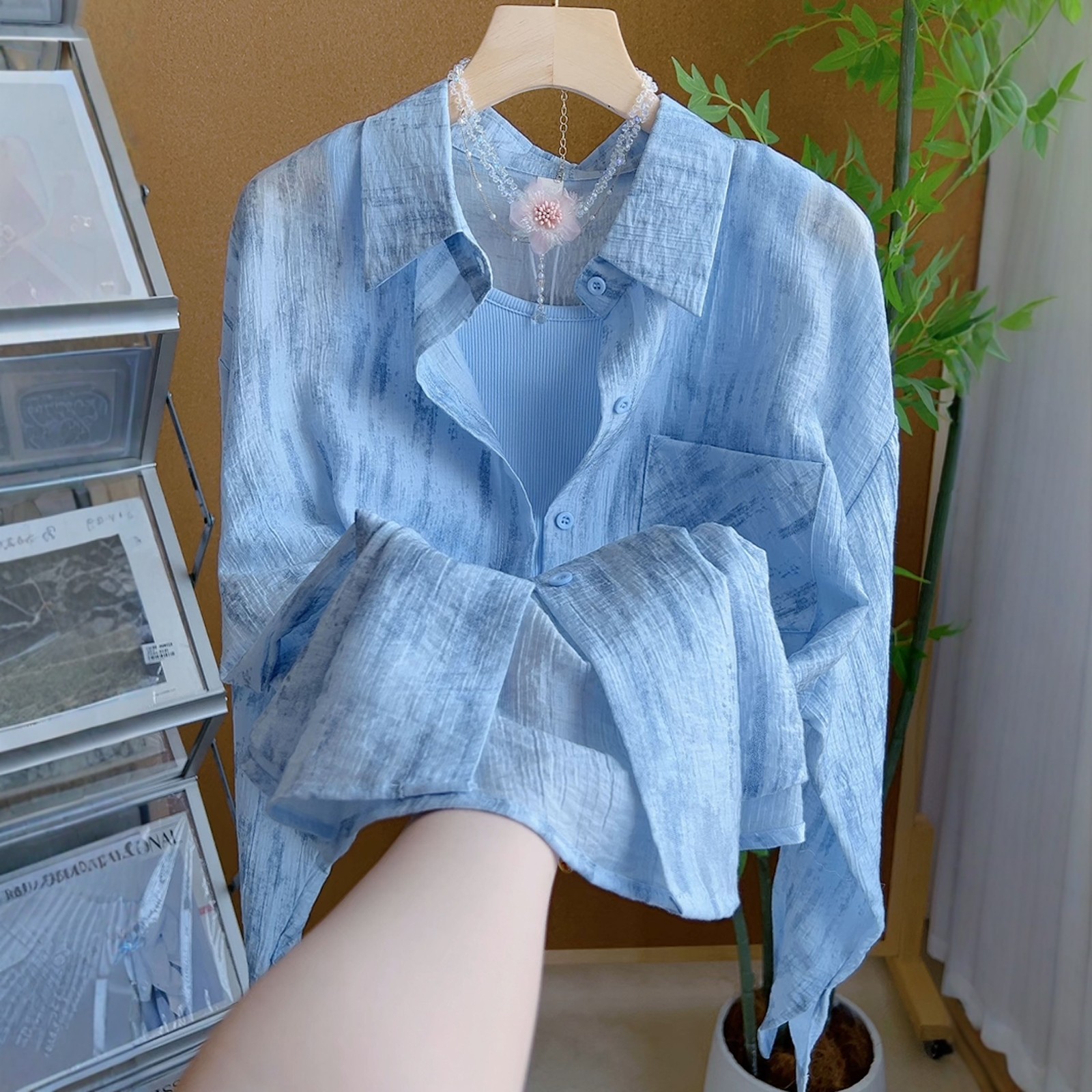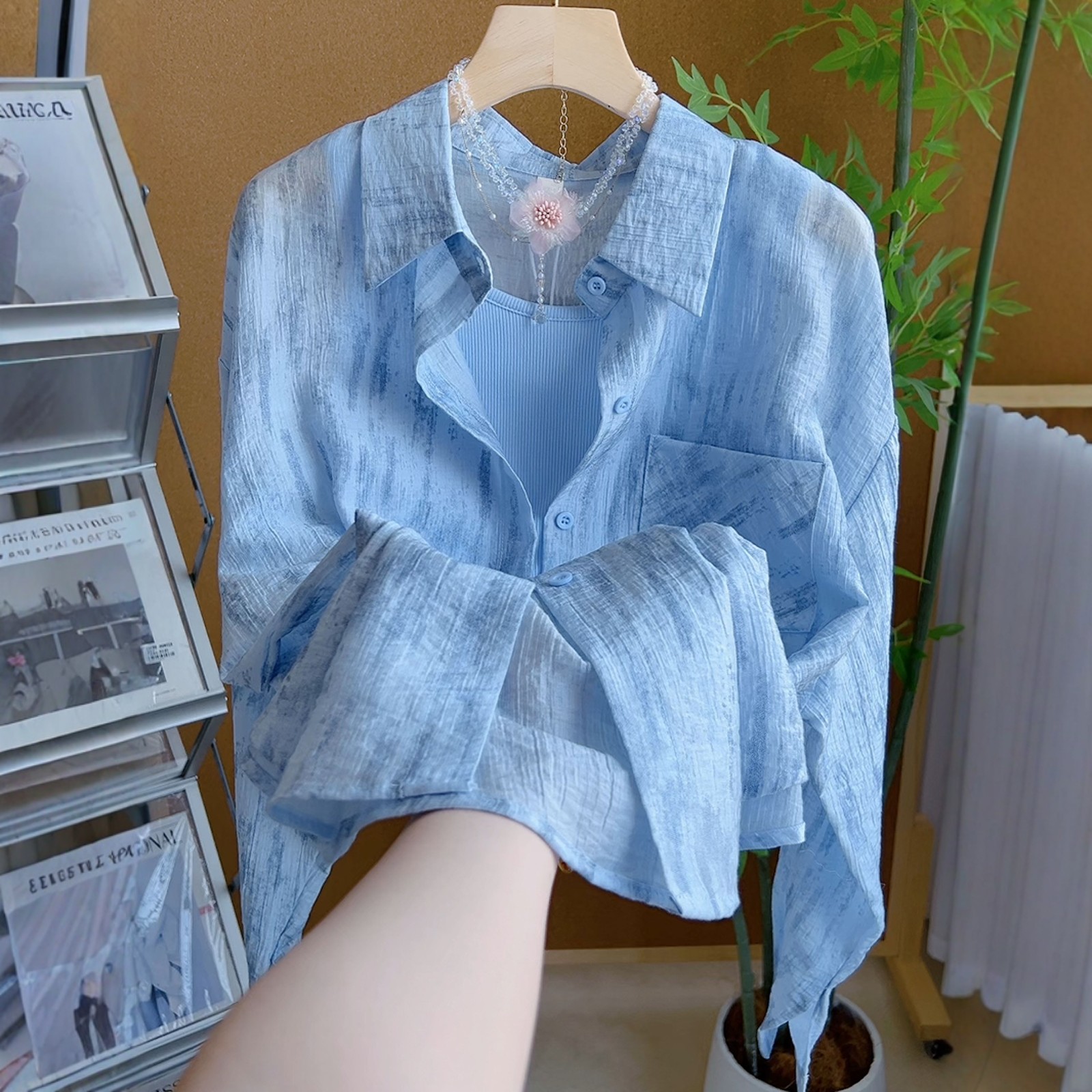 十三行法式復古紥染輕薄防曬襯衫女夏季長袖襯衣配藍色背心兩件套
