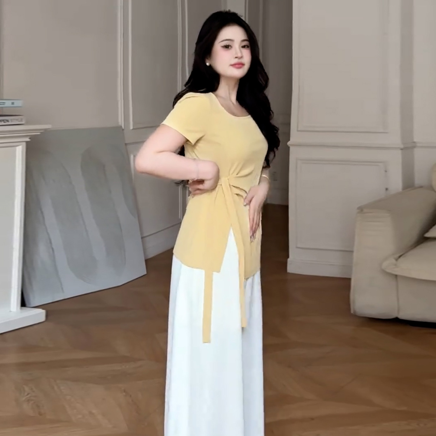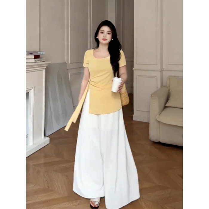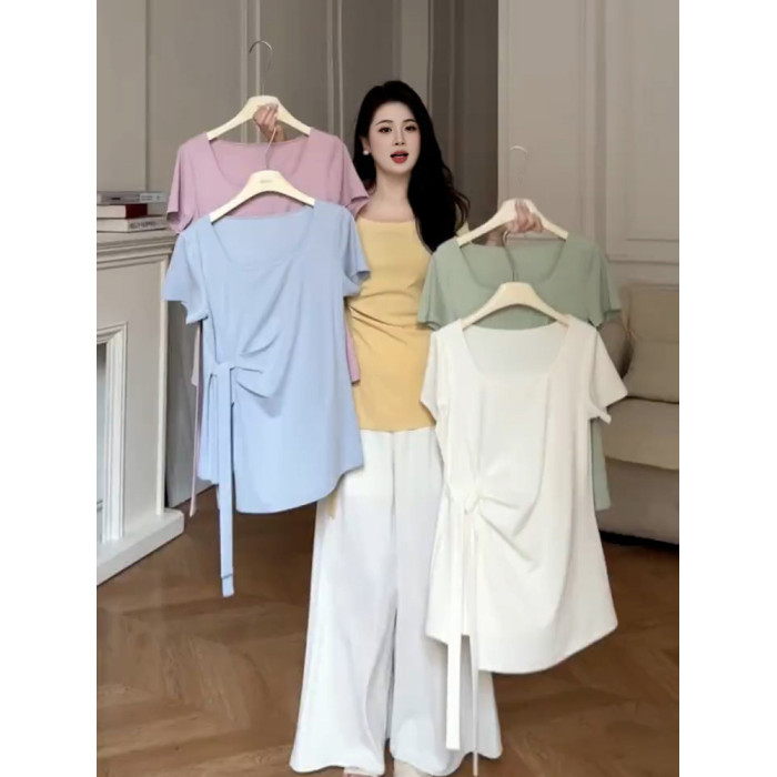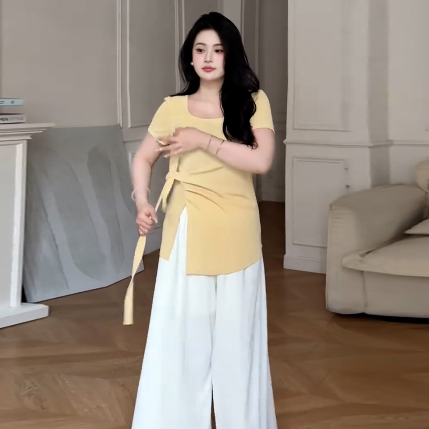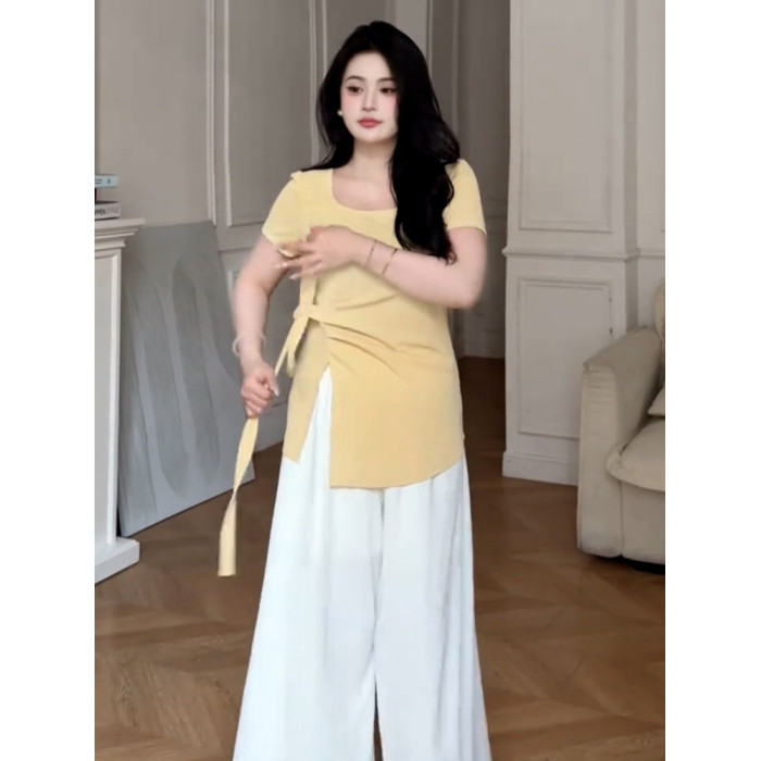 大碼法式不規則綁帶設計感短袖t恤女夏季微胖mm顯瘦遮肚方領上衣
