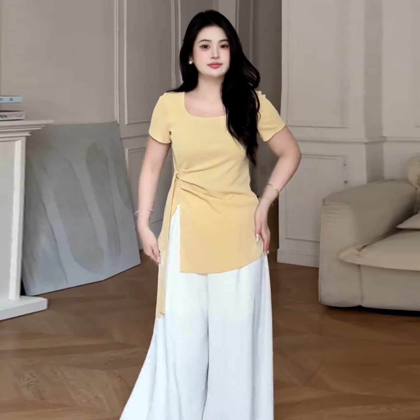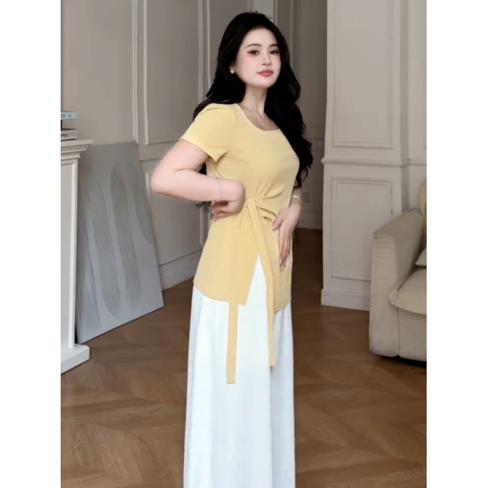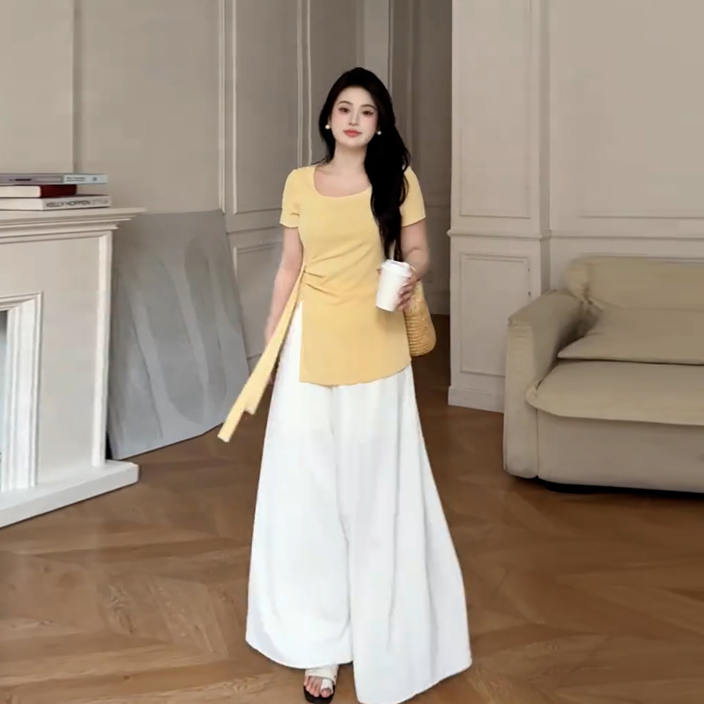 大碼法式不規則綁帶設計感短袖t恤女夏季微胖mm顯瘦遮肚方領上衣