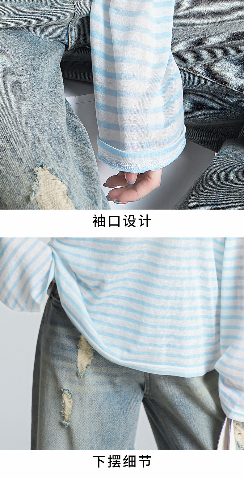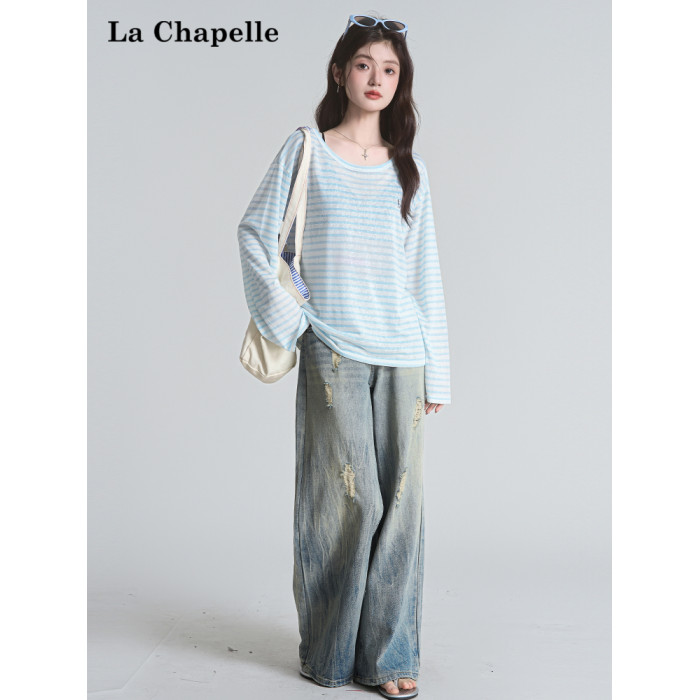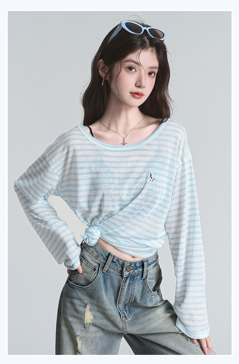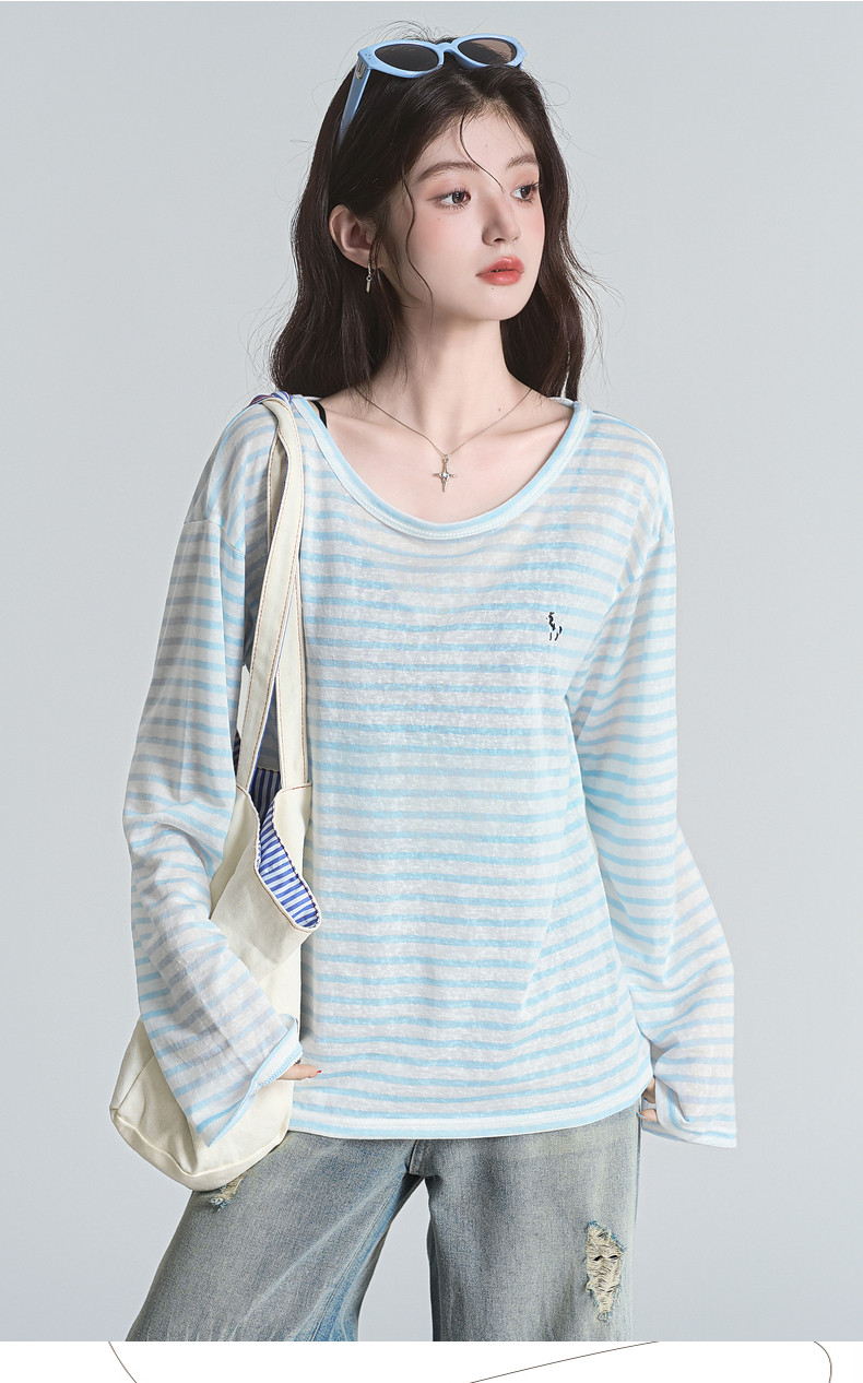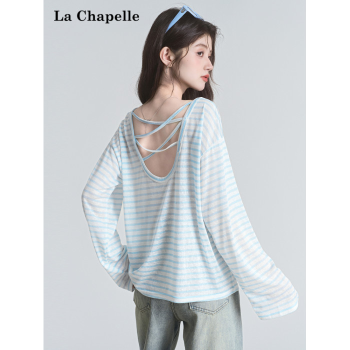 拉夏貝爾2025夏裝新款百搭T恤女時尚條紋休閒輕薄防曬長袖上衣