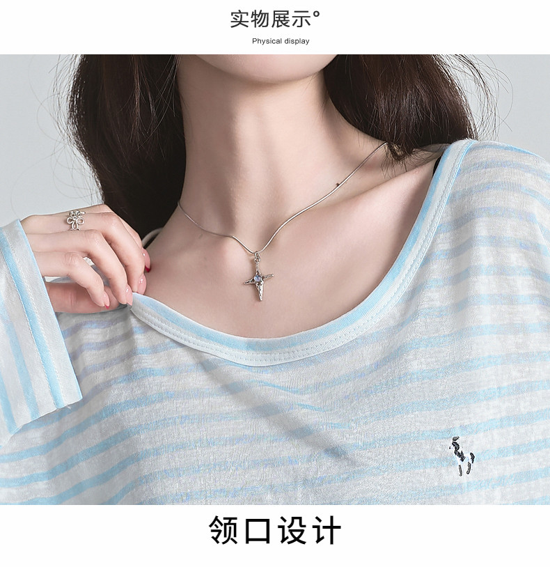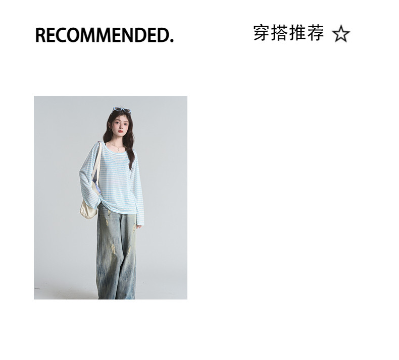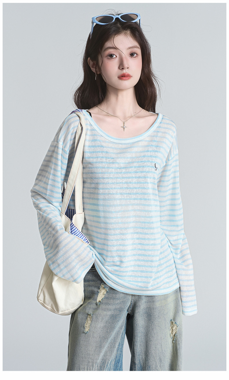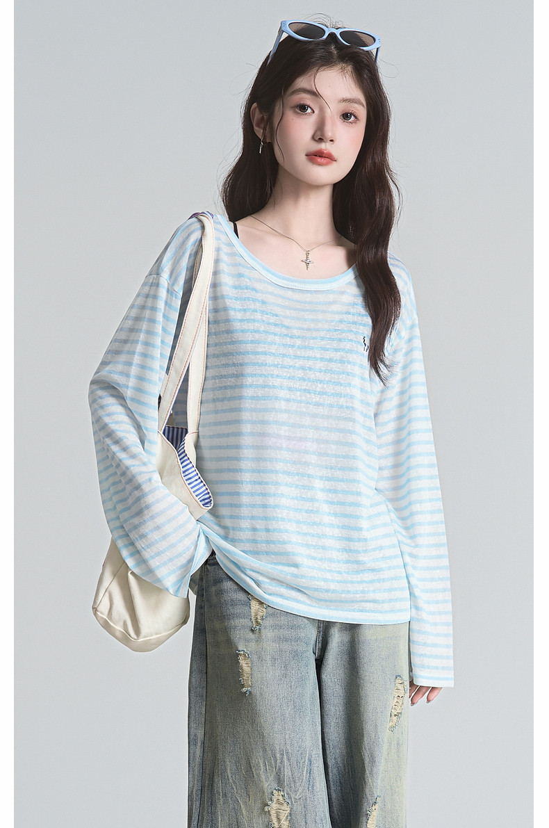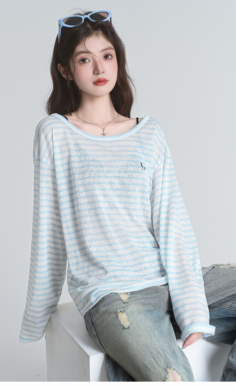 拉夏貝爾2025夏裝新款百搭T恤女時尚條紋休閒輕薄防曬長袖上衣