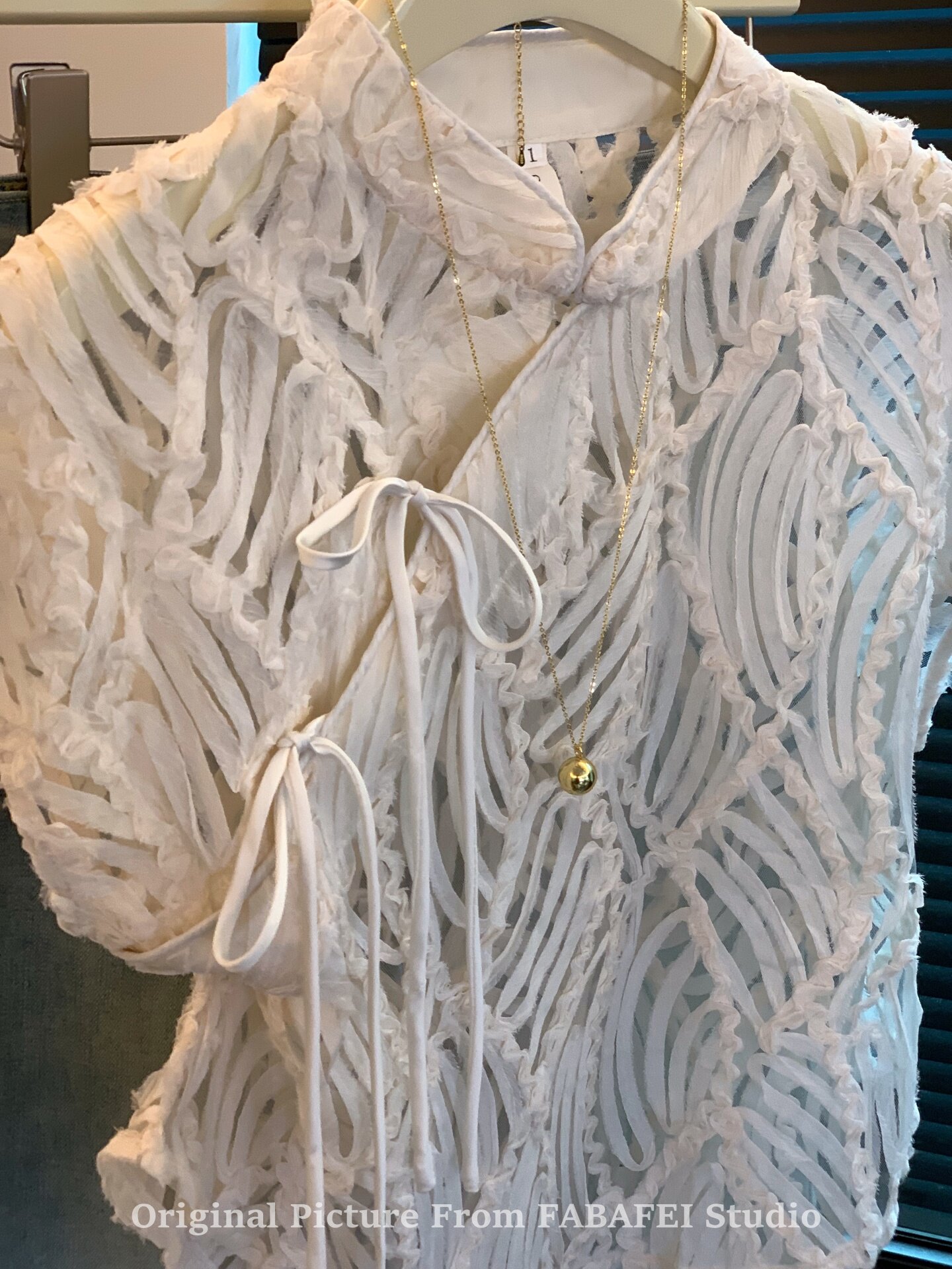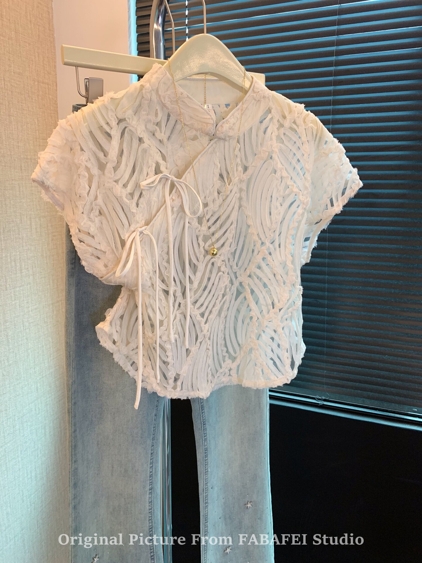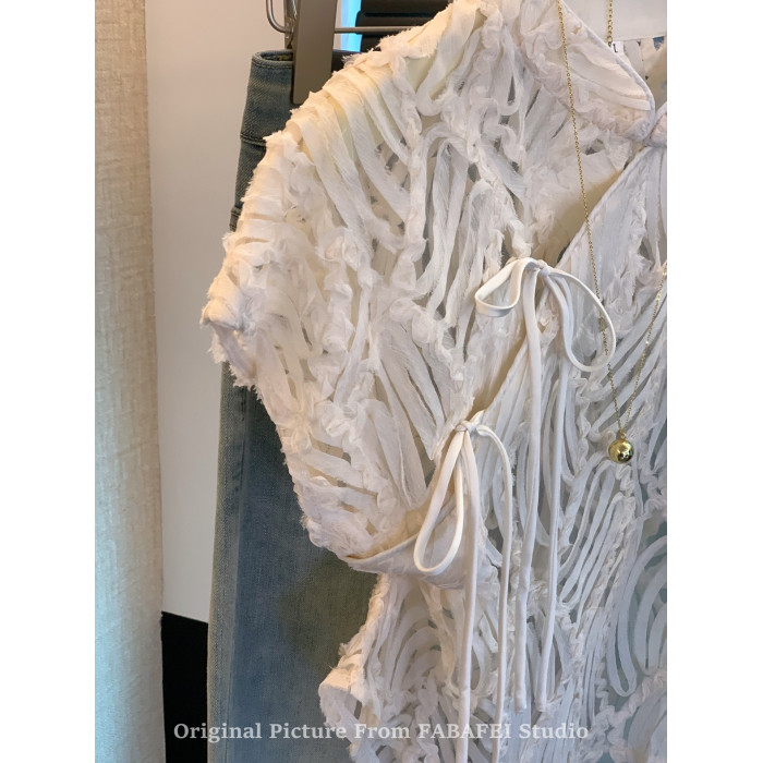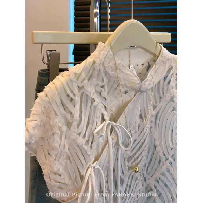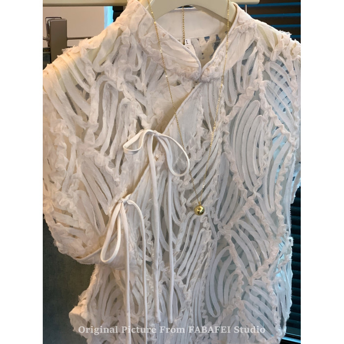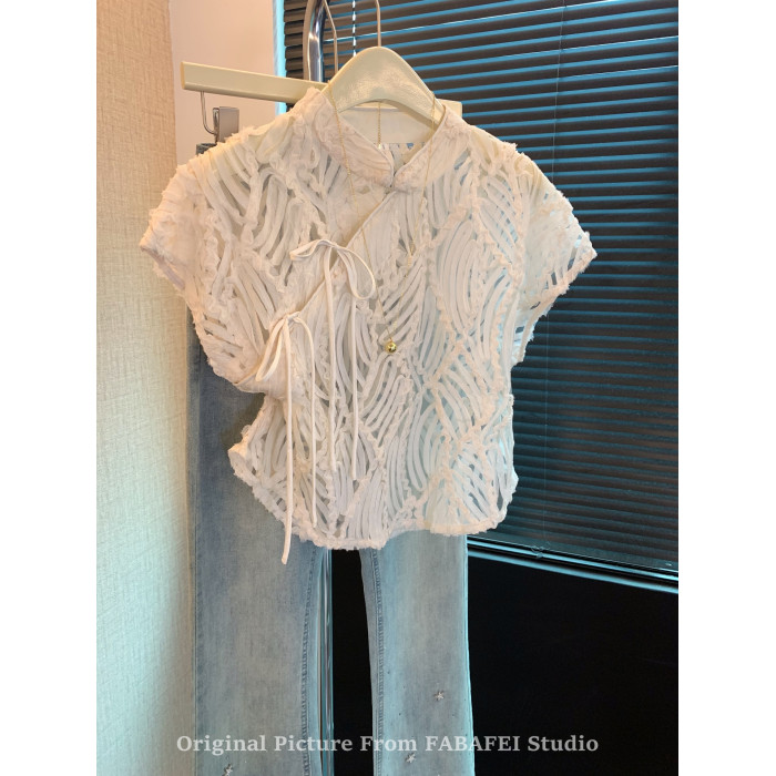 自畱爆款推薦~新中式盤釦鏤空蕾絲襯衫女夏款國風改良旗袍領上衣
