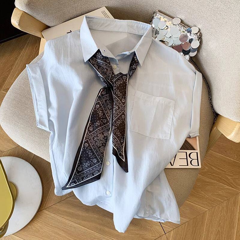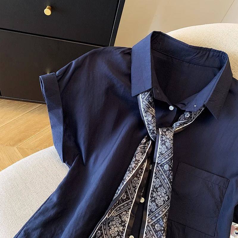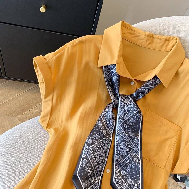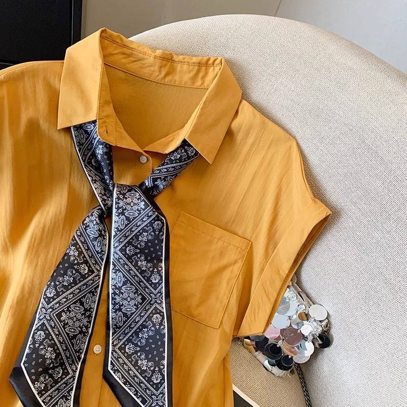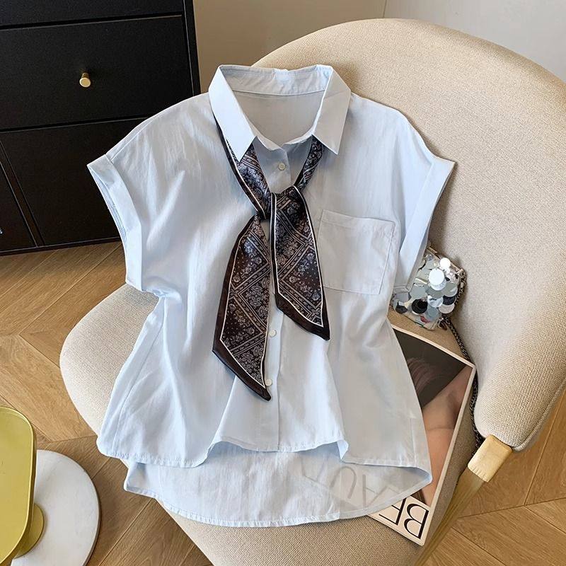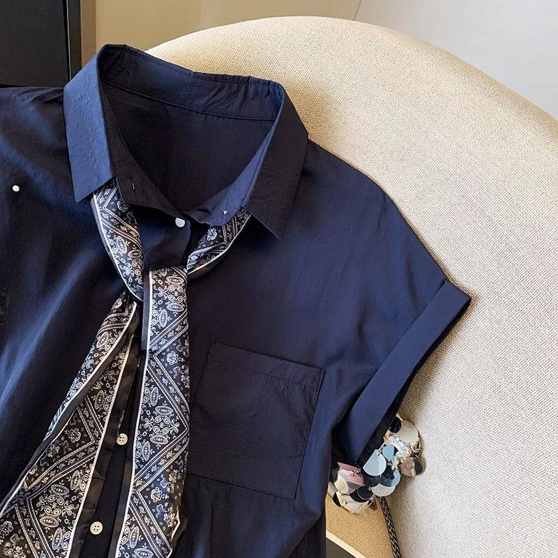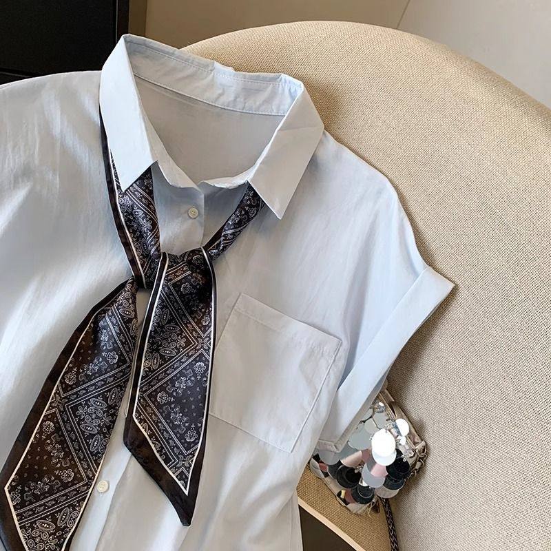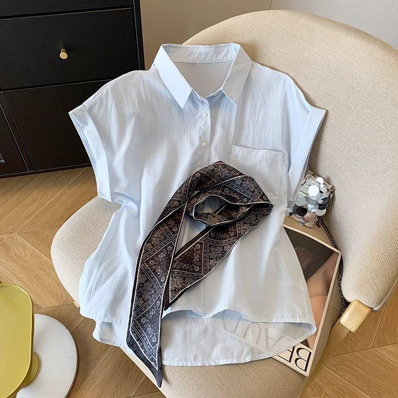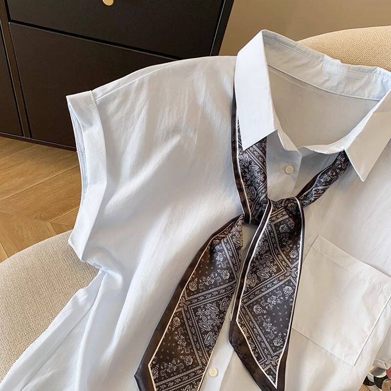 藍色polo領配絲巾無袖襯衫女夏2025新款寬鬆休閒襯衣氣質顯瘦上衣