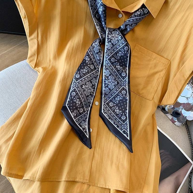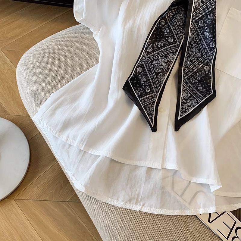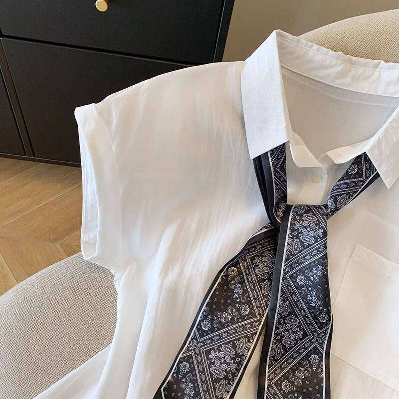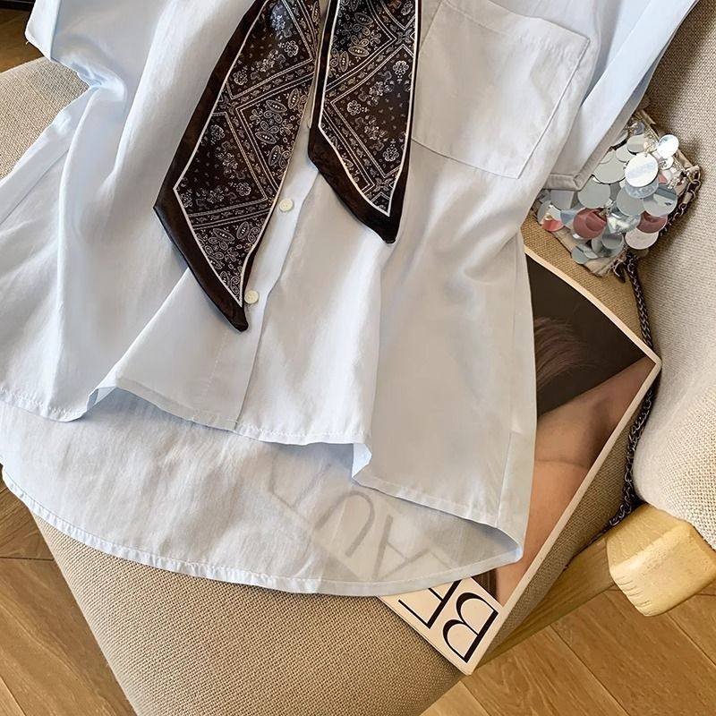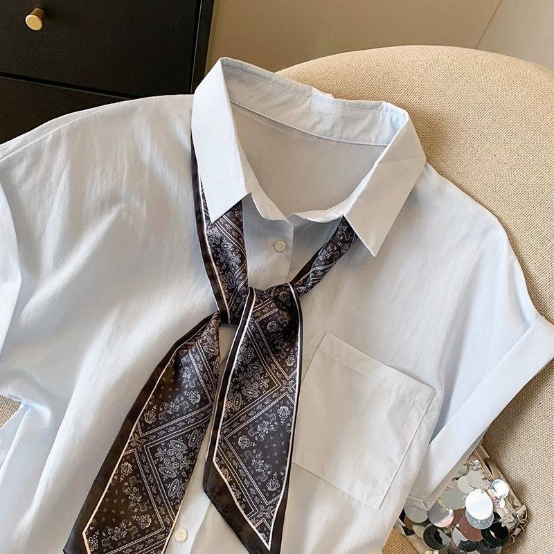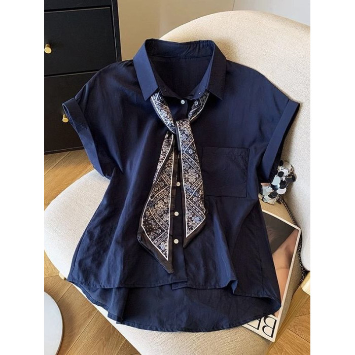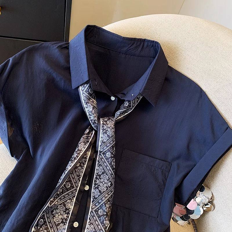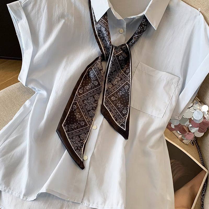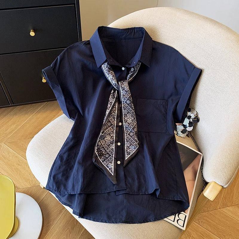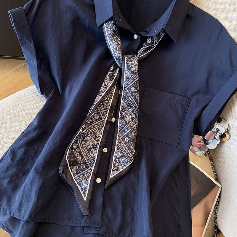 藍色polo領配絲巾無袖襯衫女夏2025新款寬鬆休閒襯衣氣質顯瘦上衣
