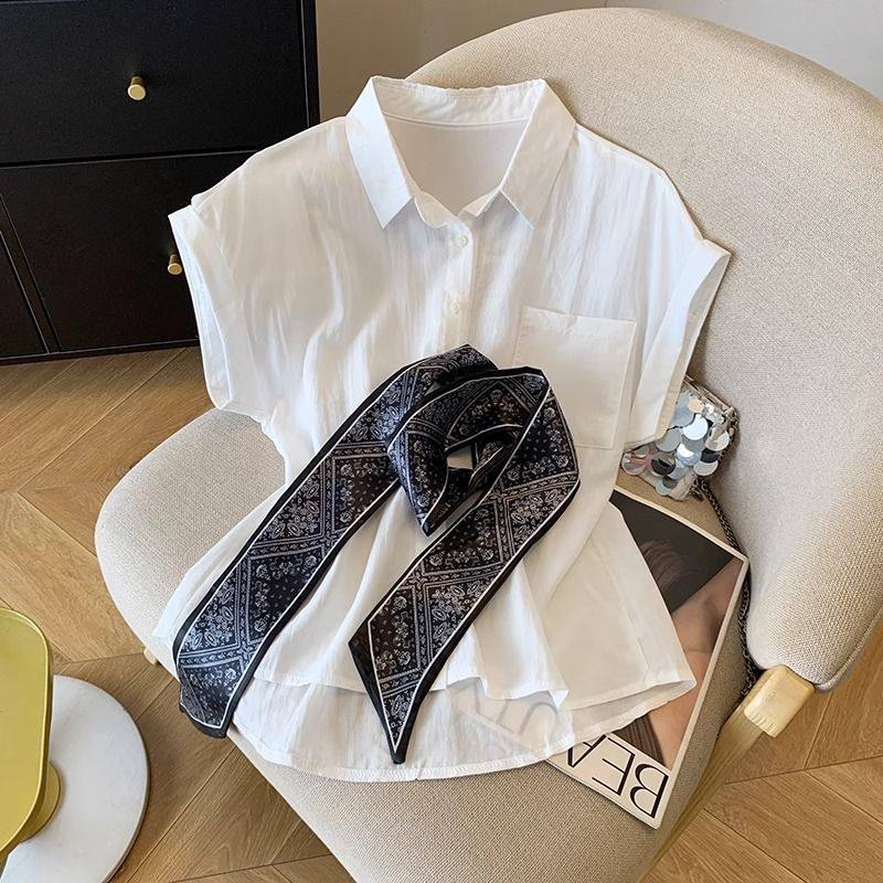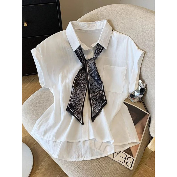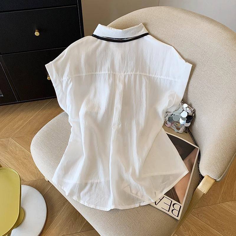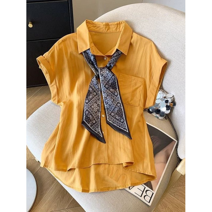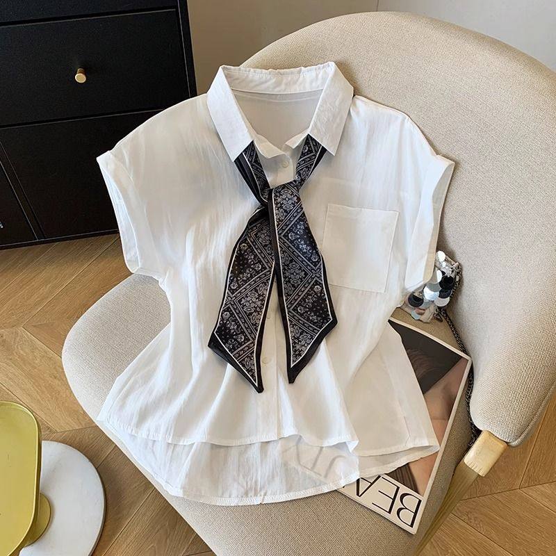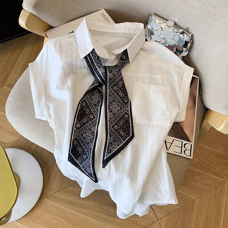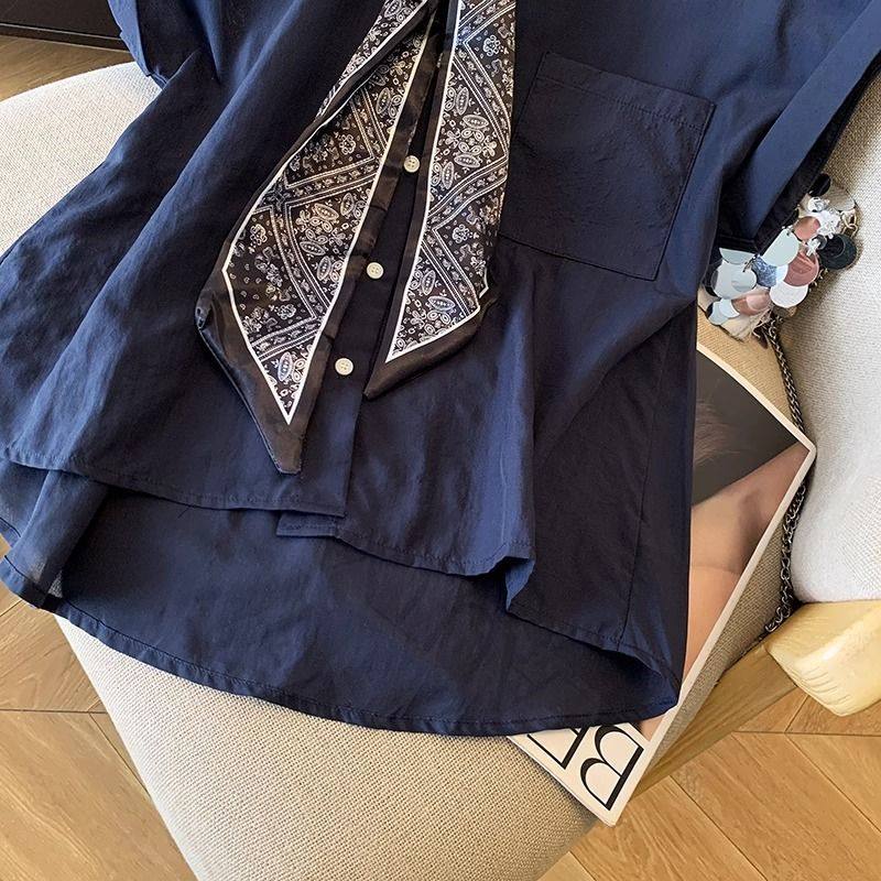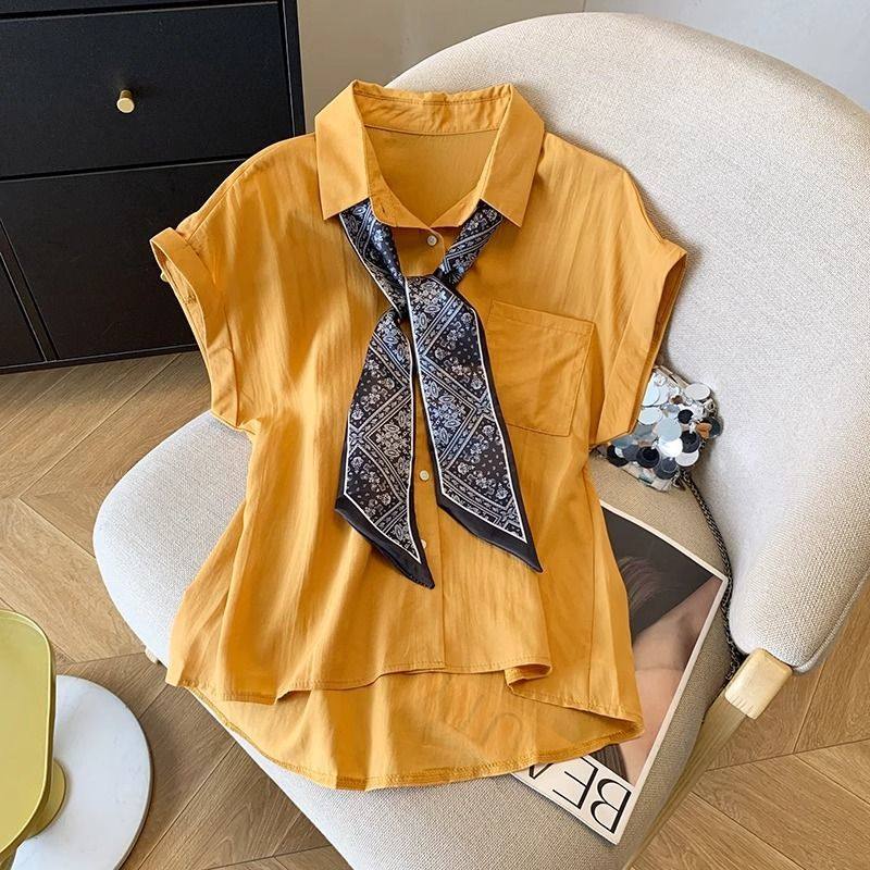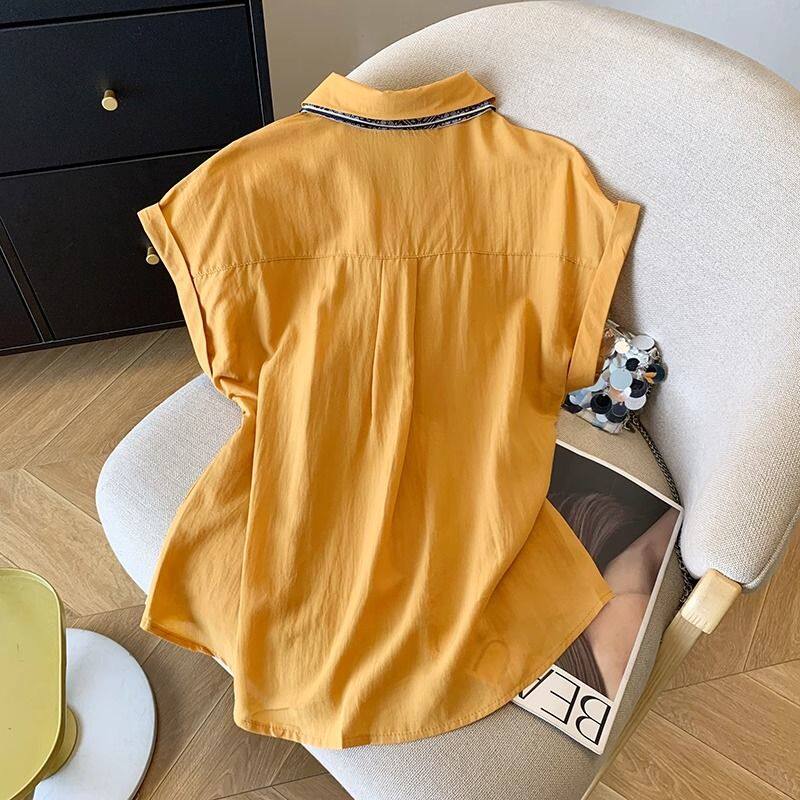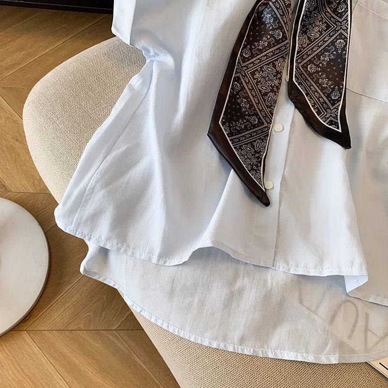 藍色polo領配絲巾無袖襯衫女夏2025新款寬鬆休閒襯衣氣質顯瘦上衣