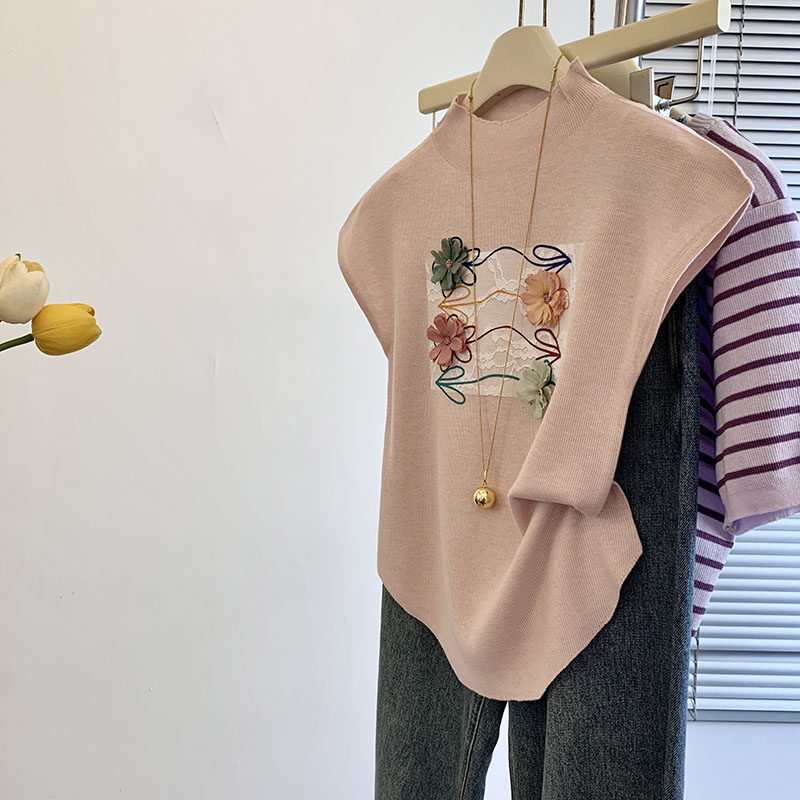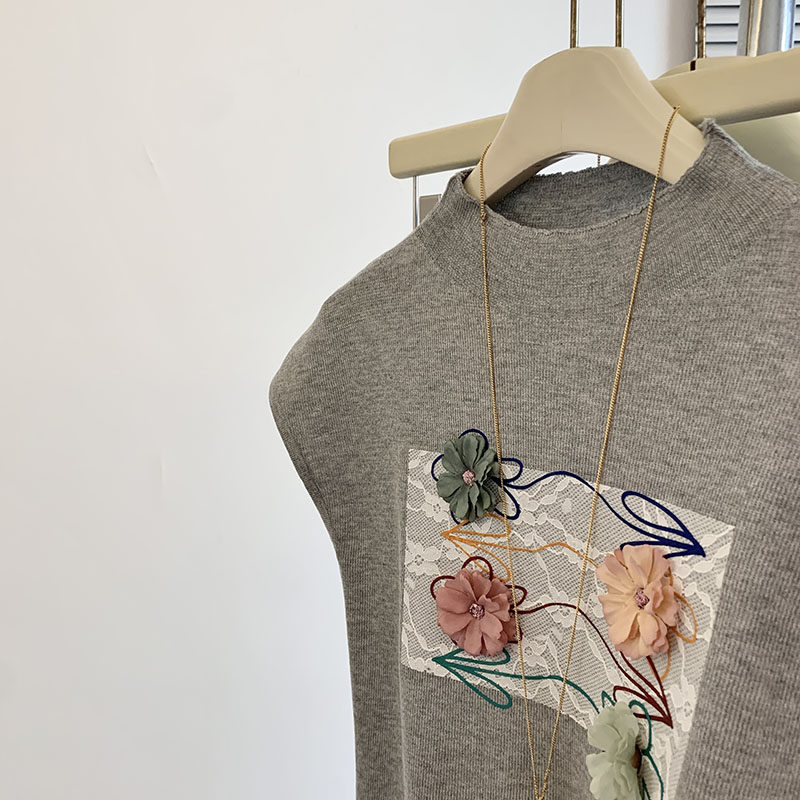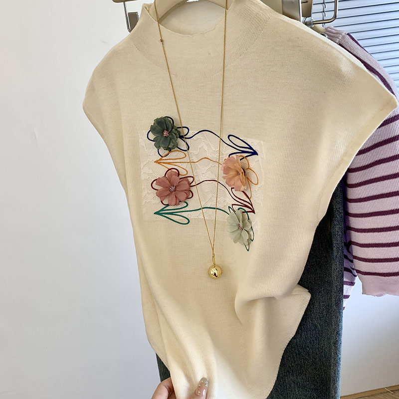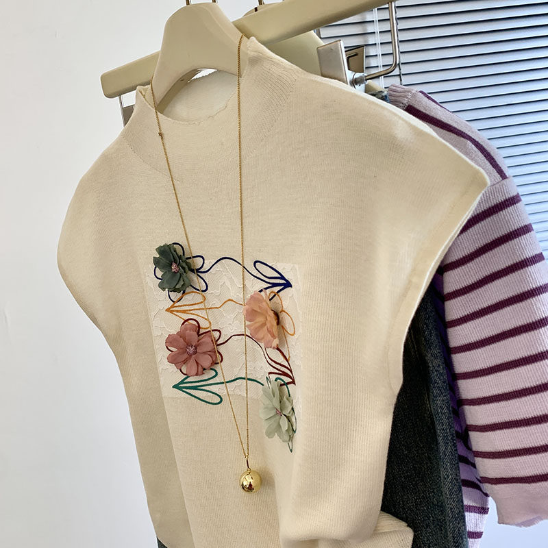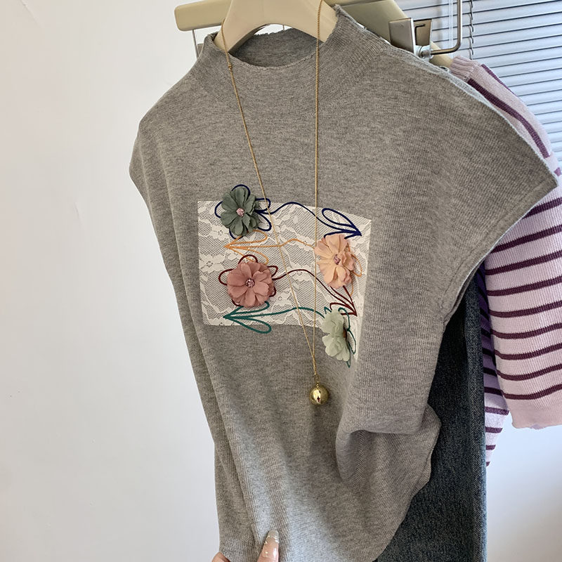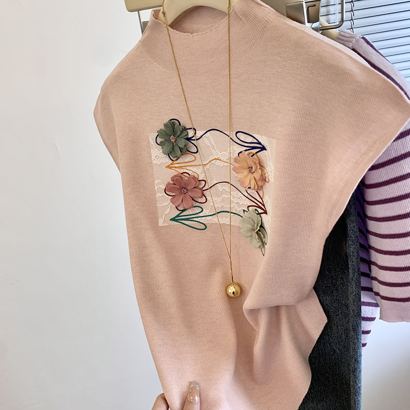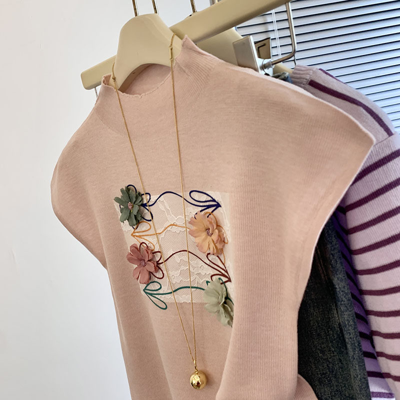 專櫃撤廻剪標立體花朵半高領短袖T恤女夏季新款正肩獨特修身上衣
