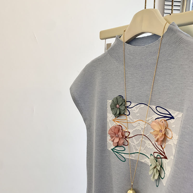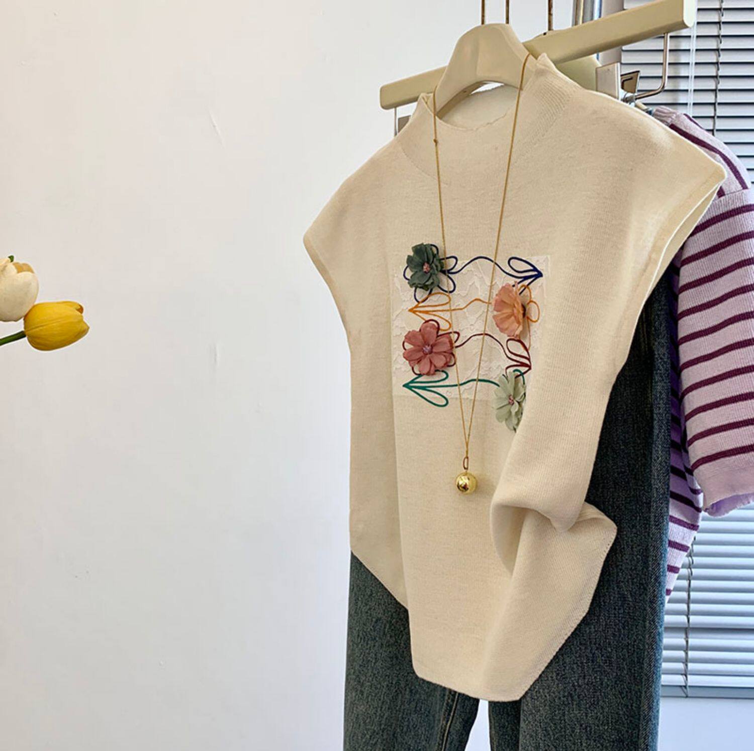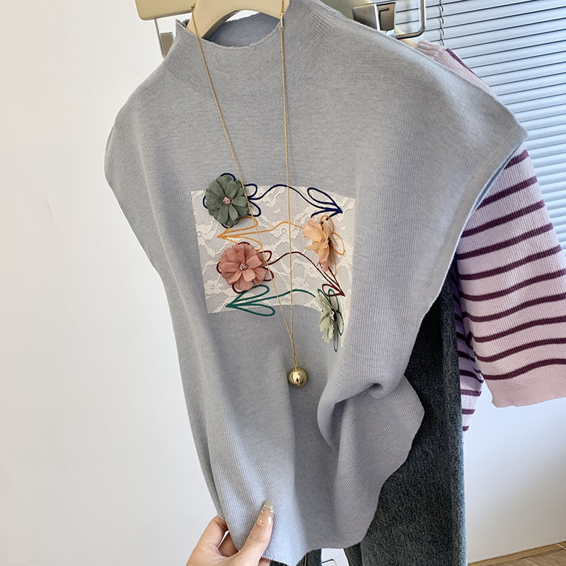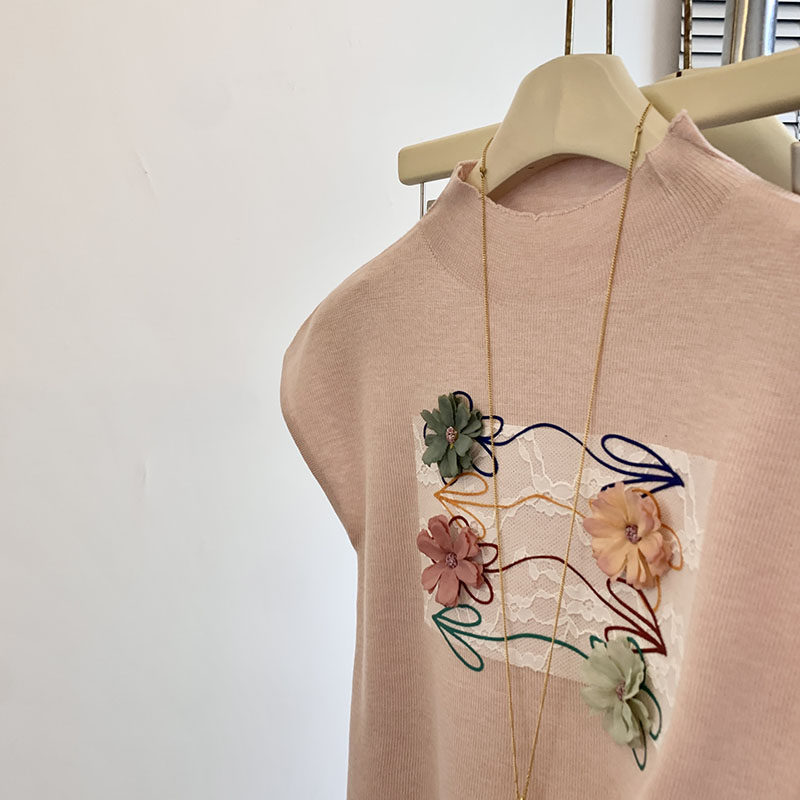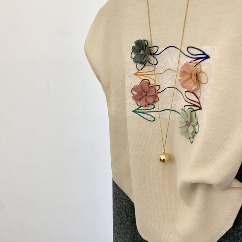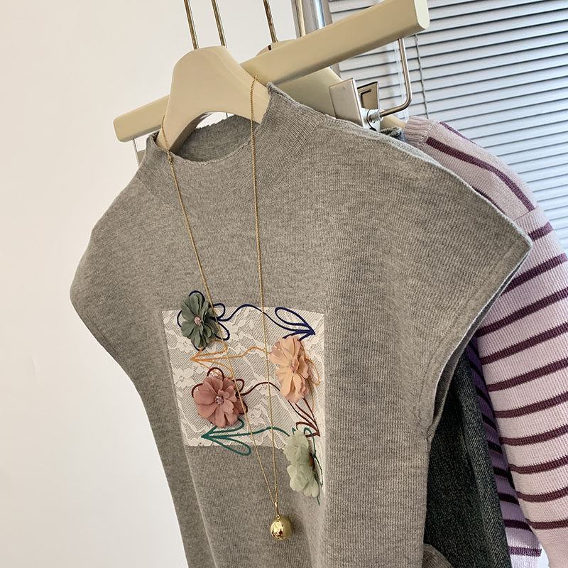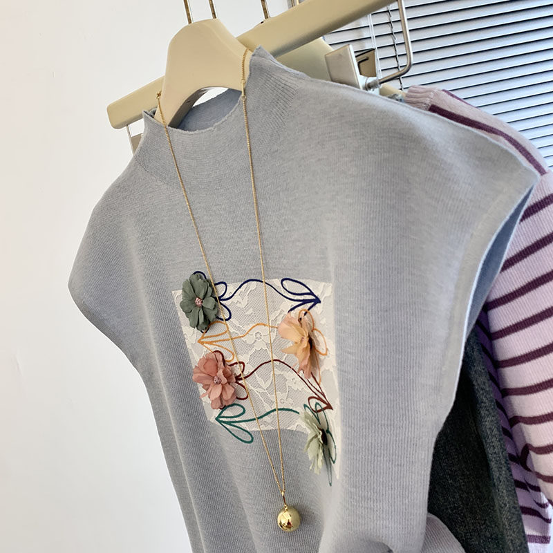 專櫃撤廻剪標立體花朵半高領短袖T恤女夏季新款正肩獨特修身上衣