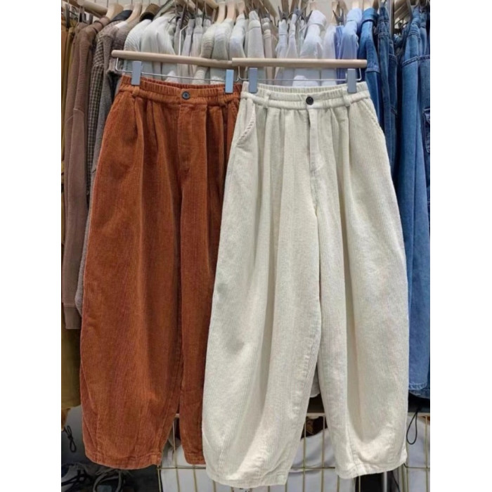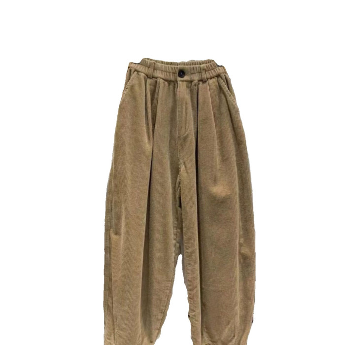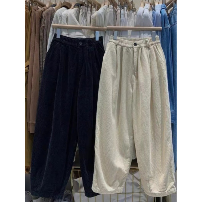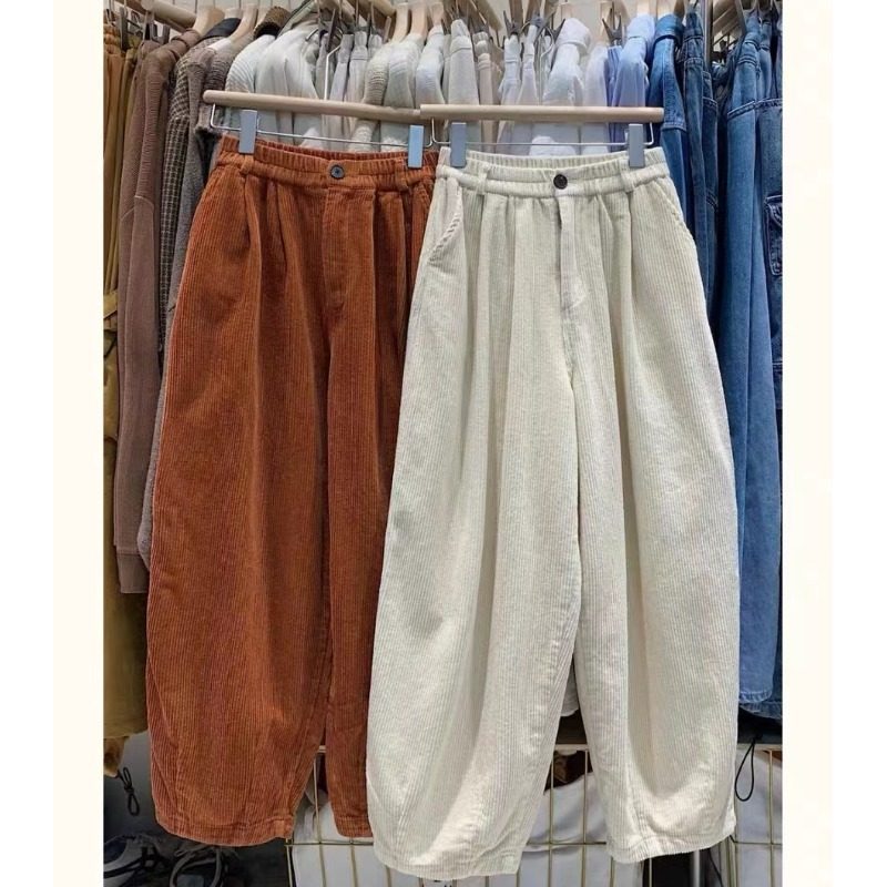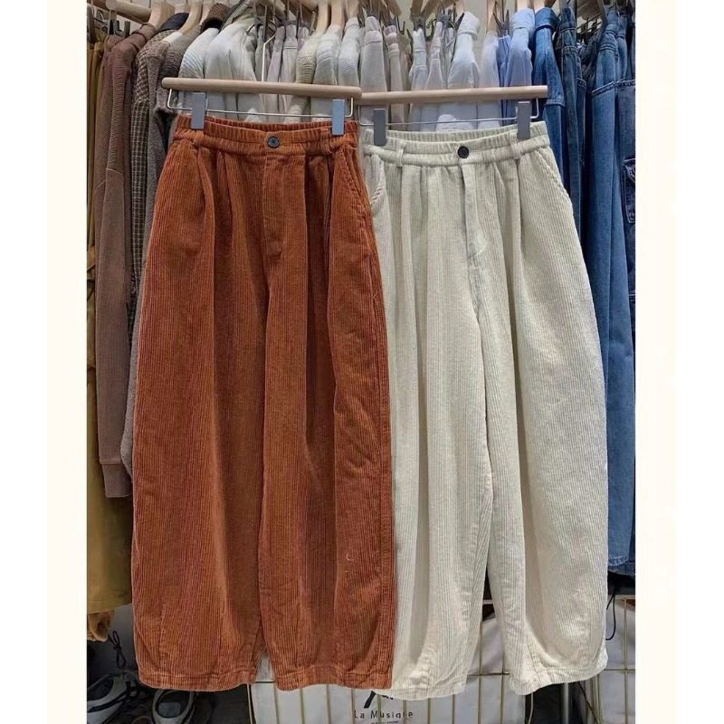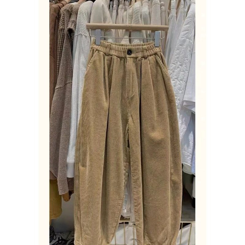 2023秋冬新款加絨加厚燈芯絨褲子女寬鬆高腰顯瘦條絨濶腿燈籠長褲