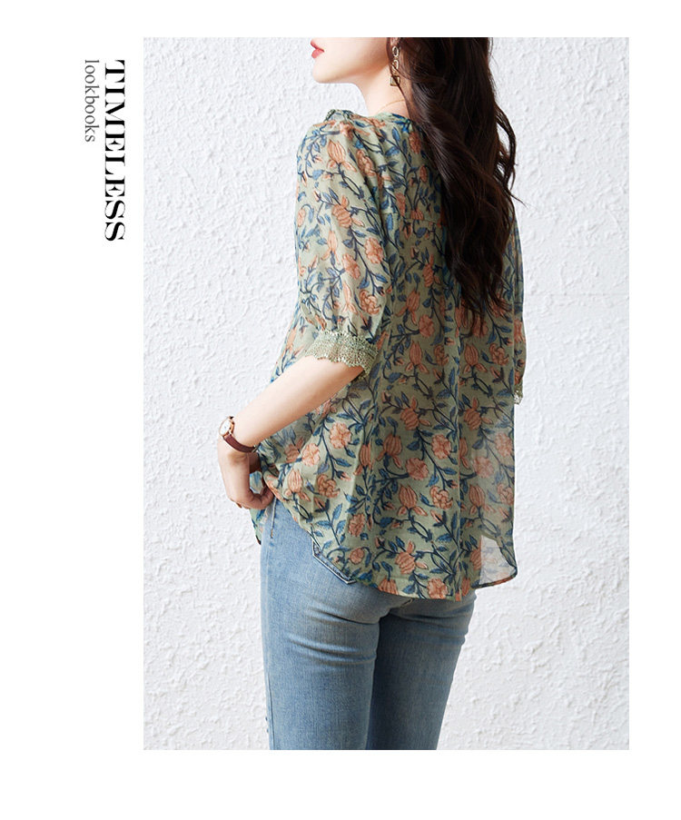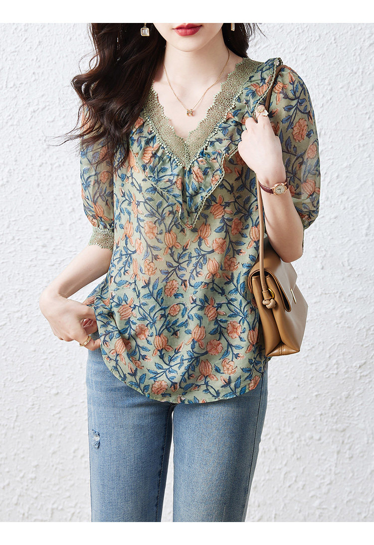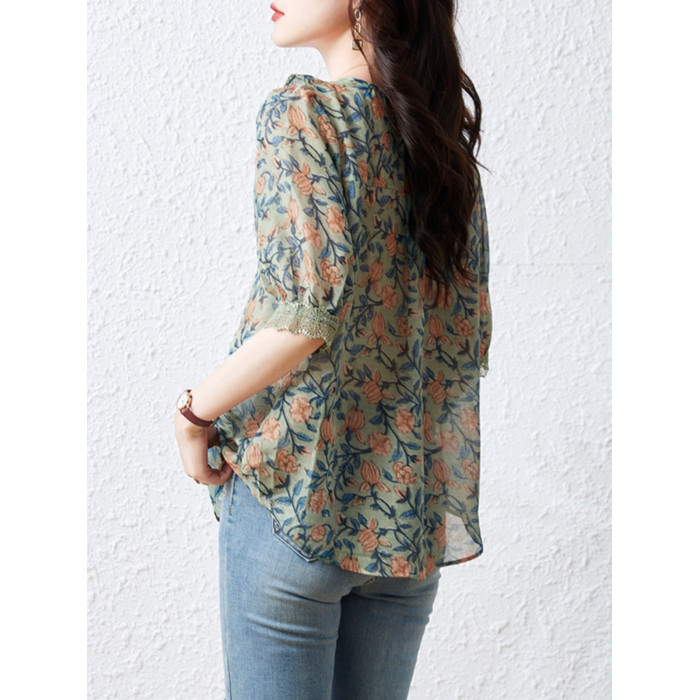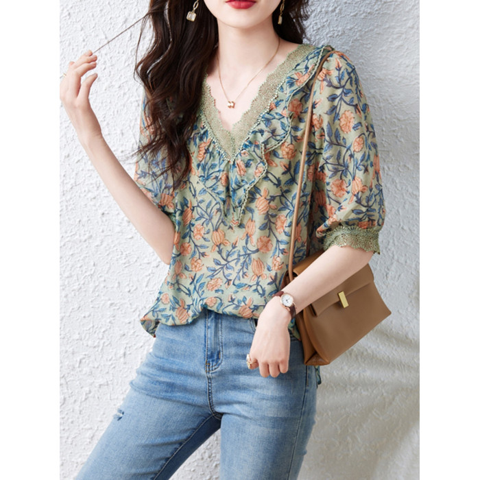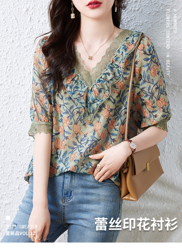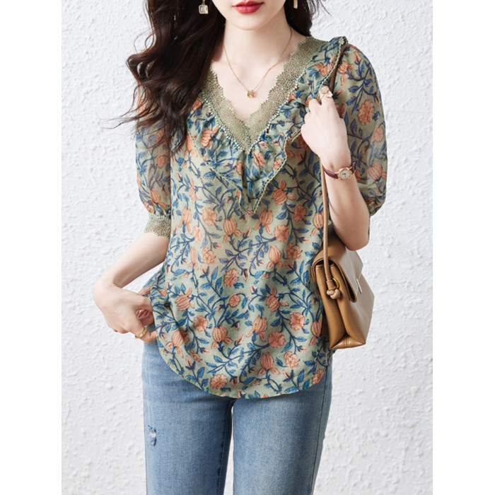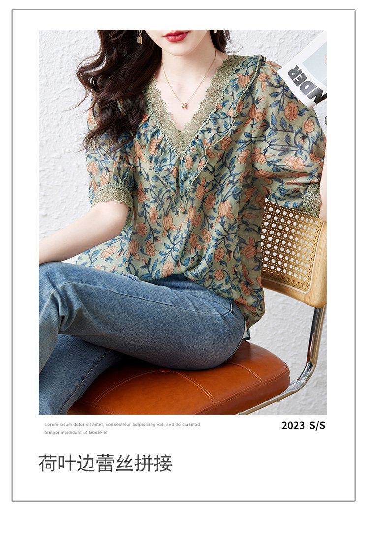 九月陌墨V領碎花雪紡襯衫女夏季短袖2025新款寬鬆大碼設計感上衣