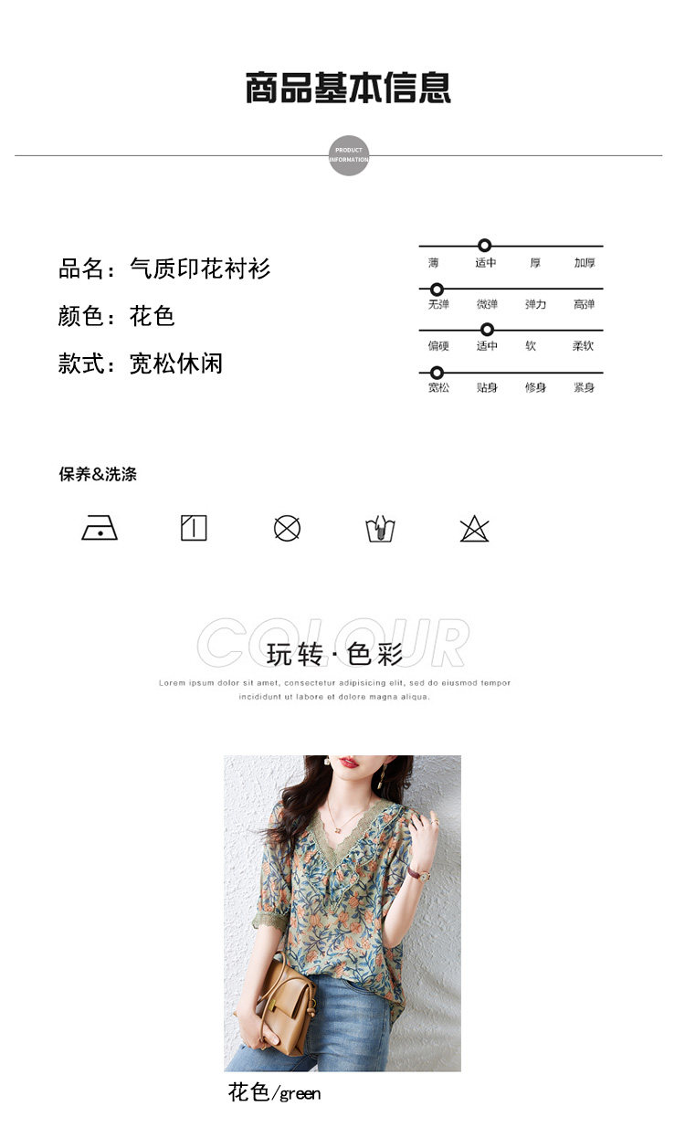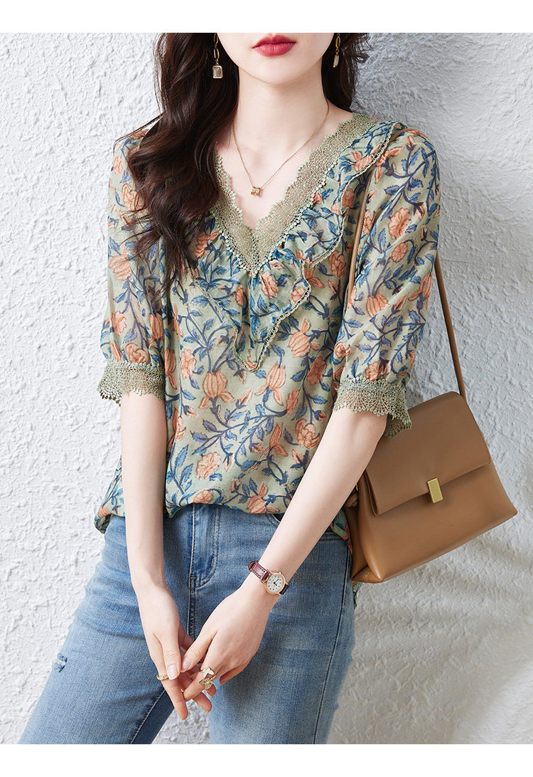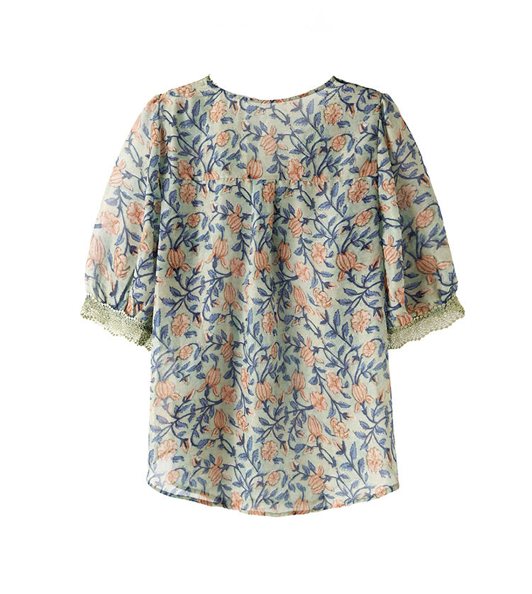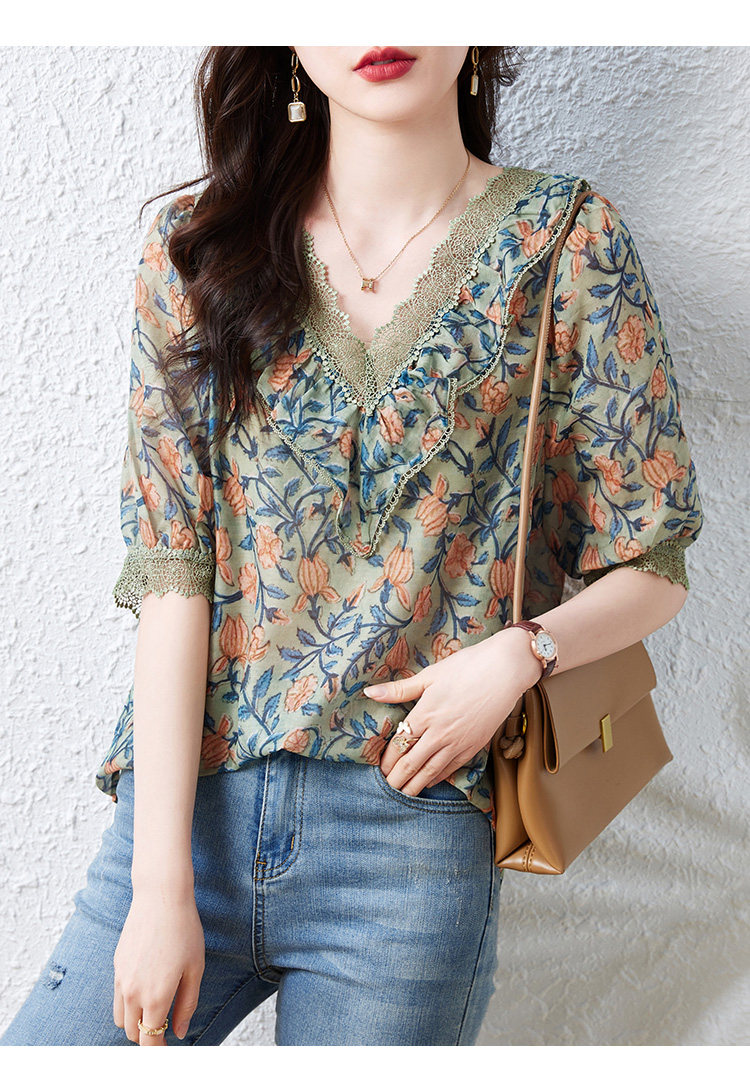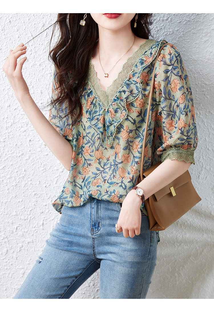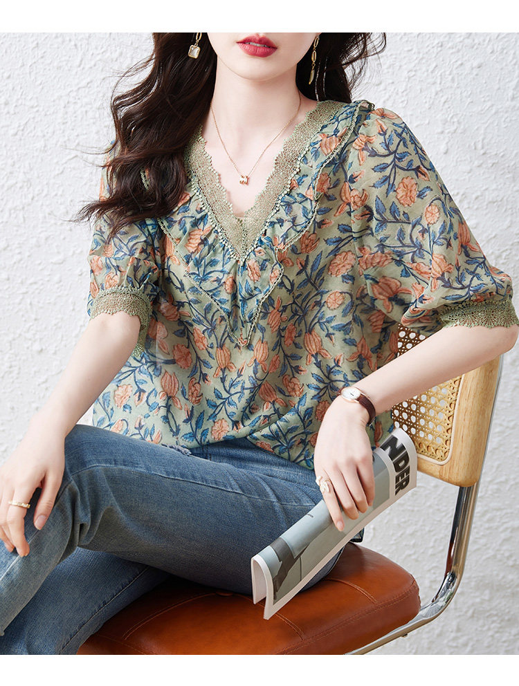 九月陌墨V領碎花雪紡襯衫女夏季短袖2025新款寬鬆大碼設計感上衣