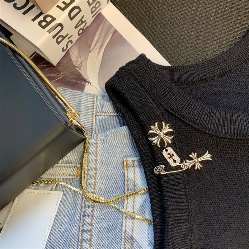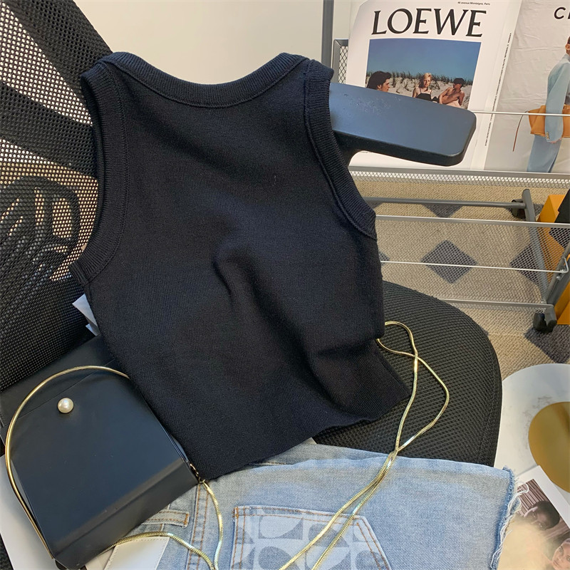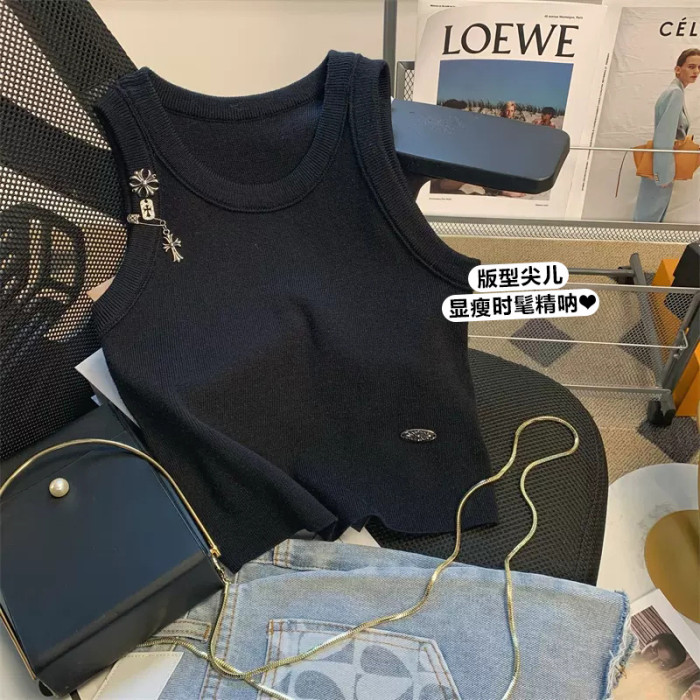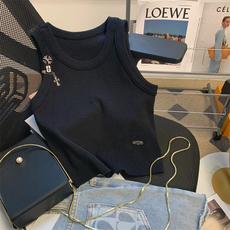 ins潮牌別針裝飾背心外穿針織吊帶女法式高級感黑色小衫無袖上衣