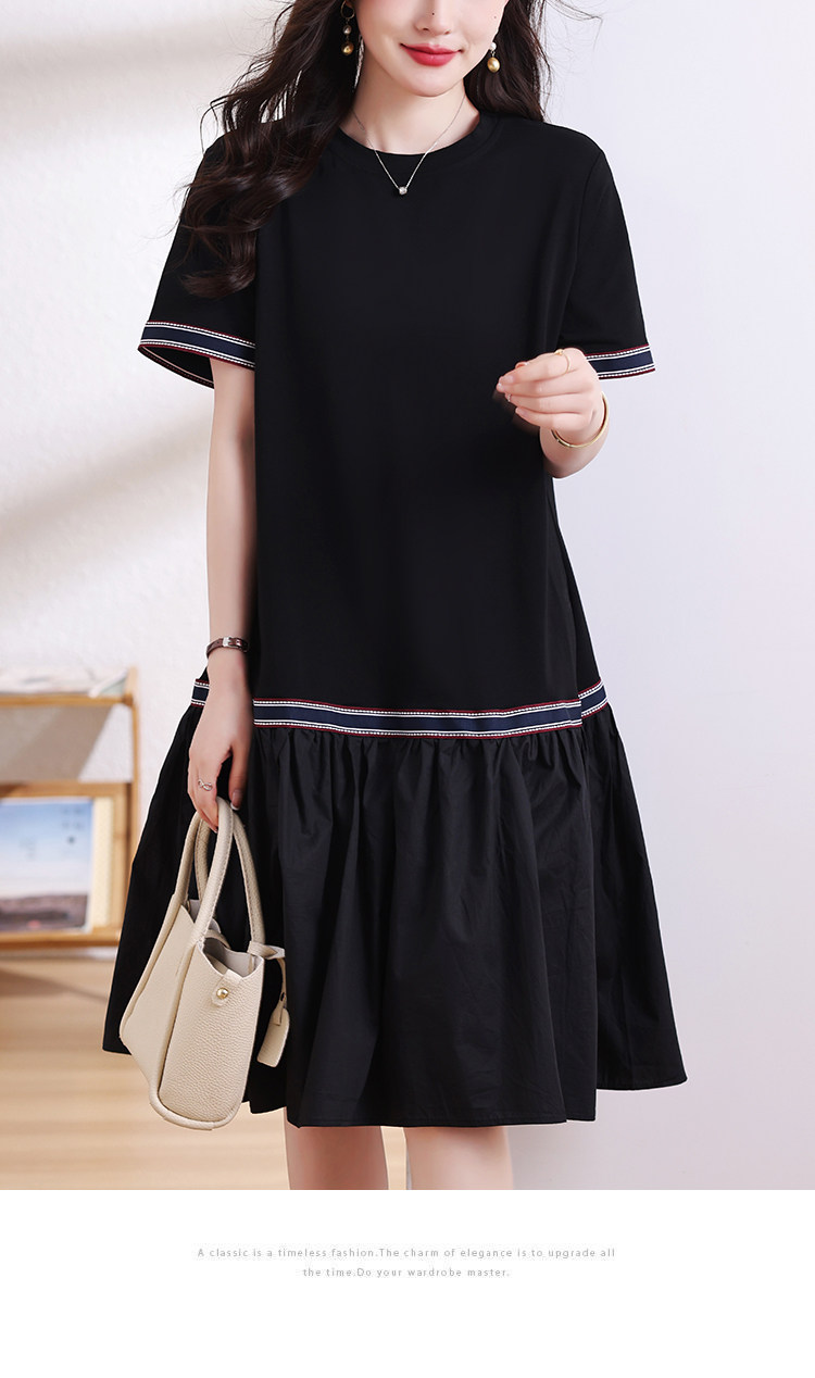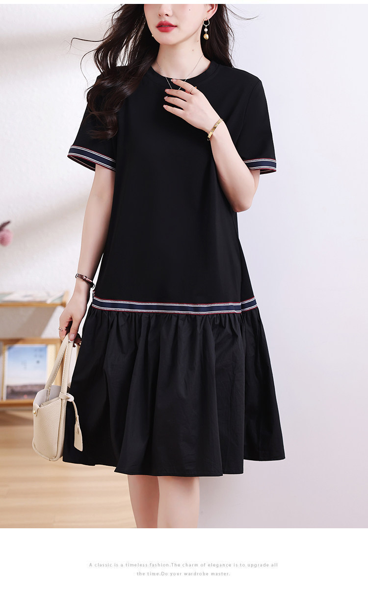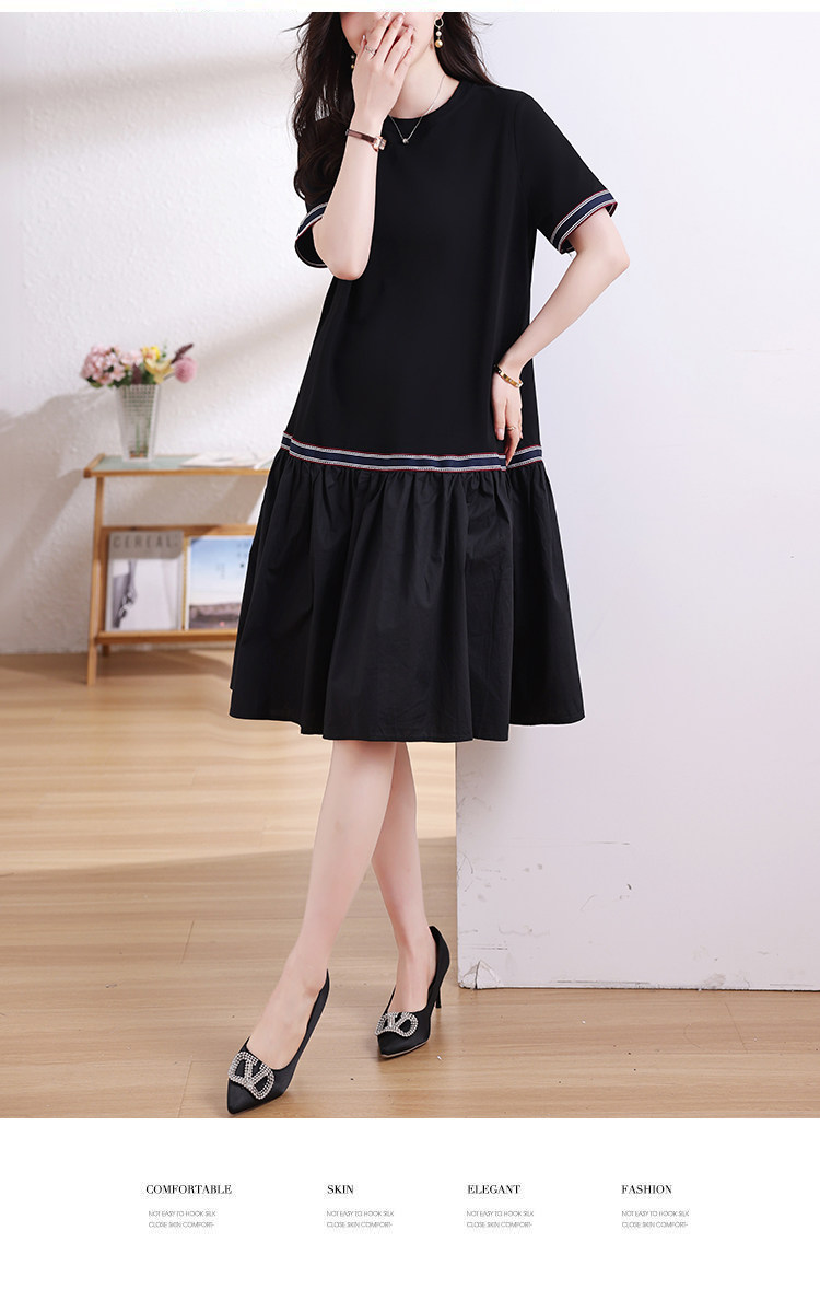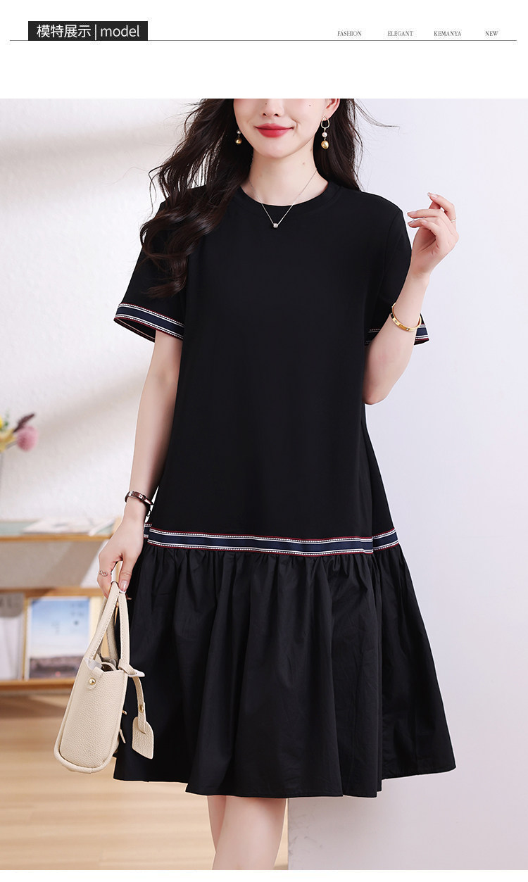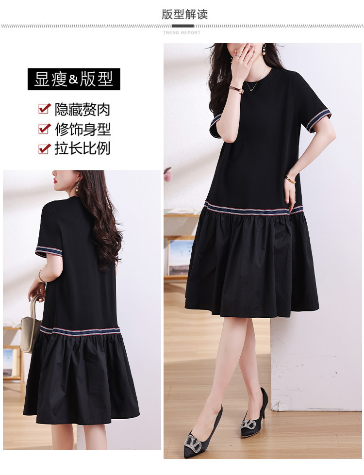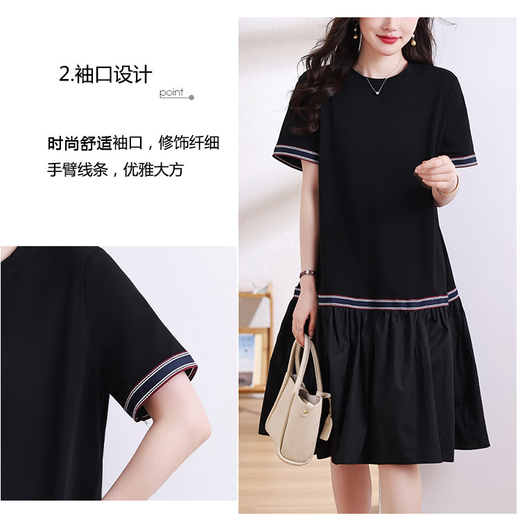九月陌墨短袖法式圓領拼接T恤裙夏季2024新款大碼A字顯瘦連衣裙女