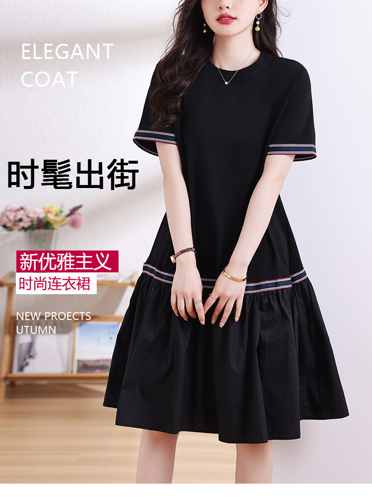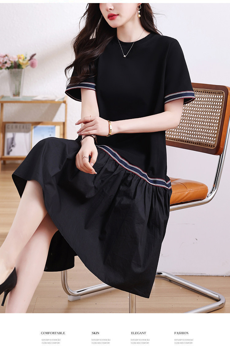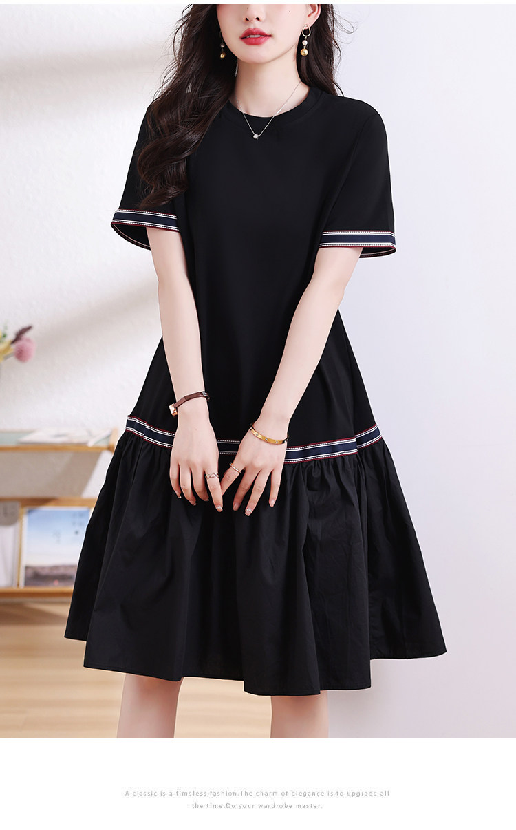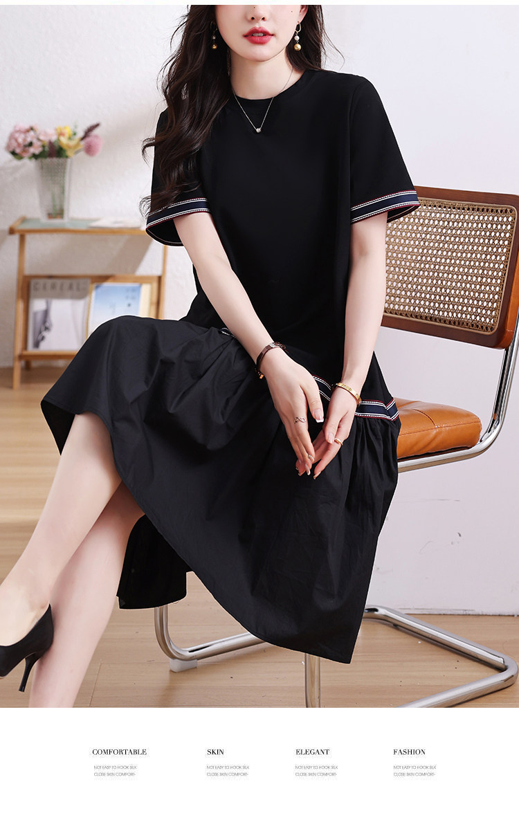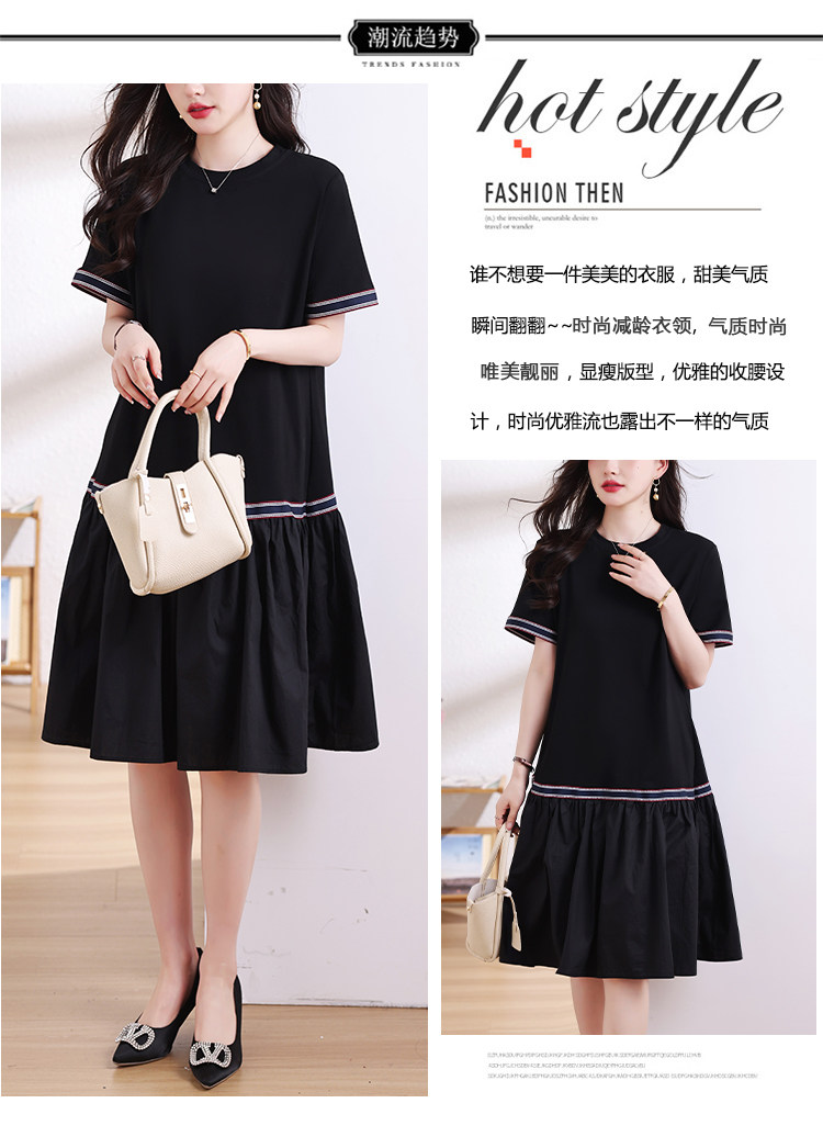 九月陌墨短袖法式圓領拼接T恤裙夏季2024新款大碼A字顯瘦連衣裙女
