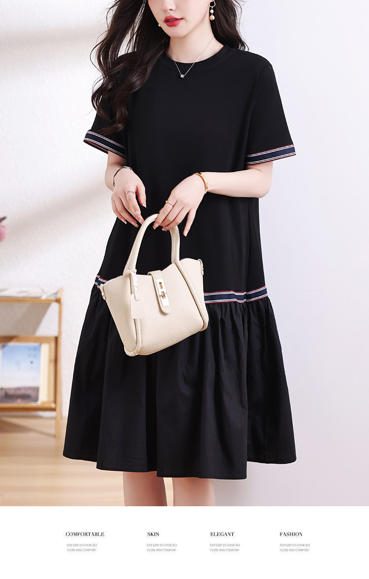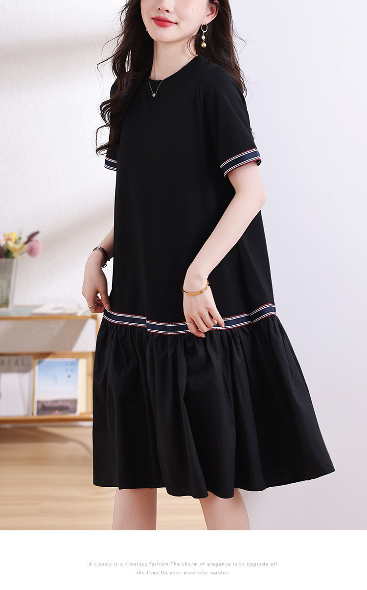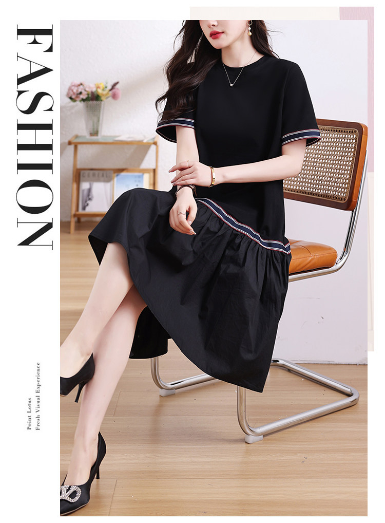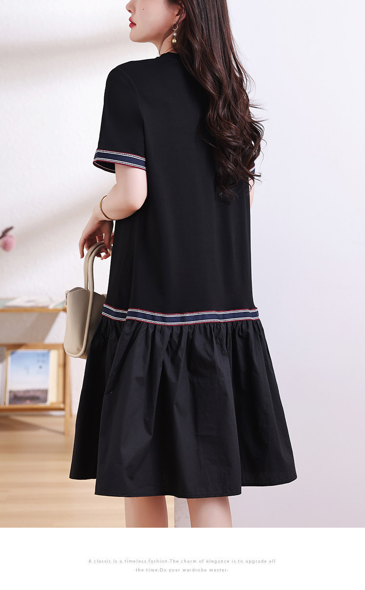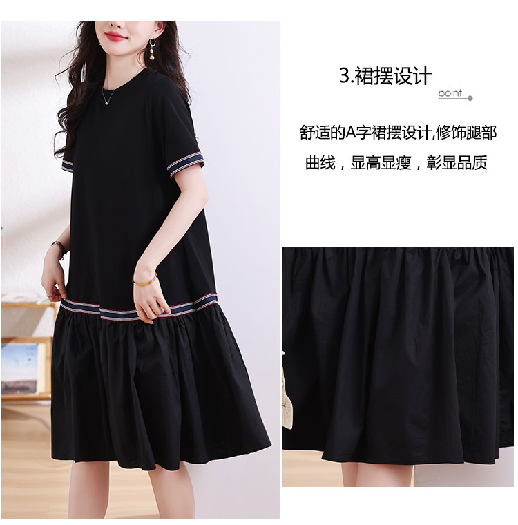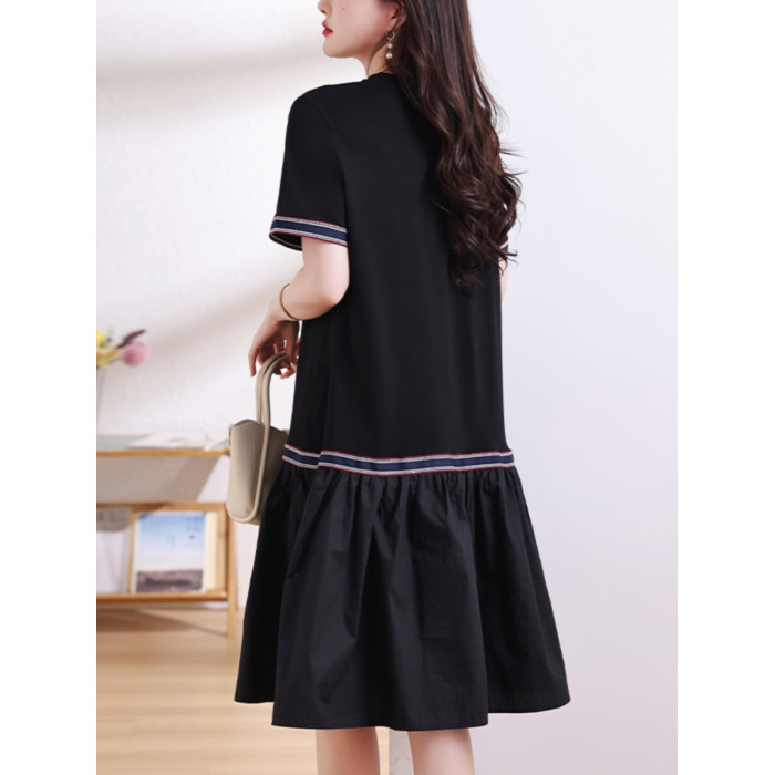 九月陌墨短袖法式圓領拼接T恤裙夏季2024新款大碼A字顯瘦連衣裙女