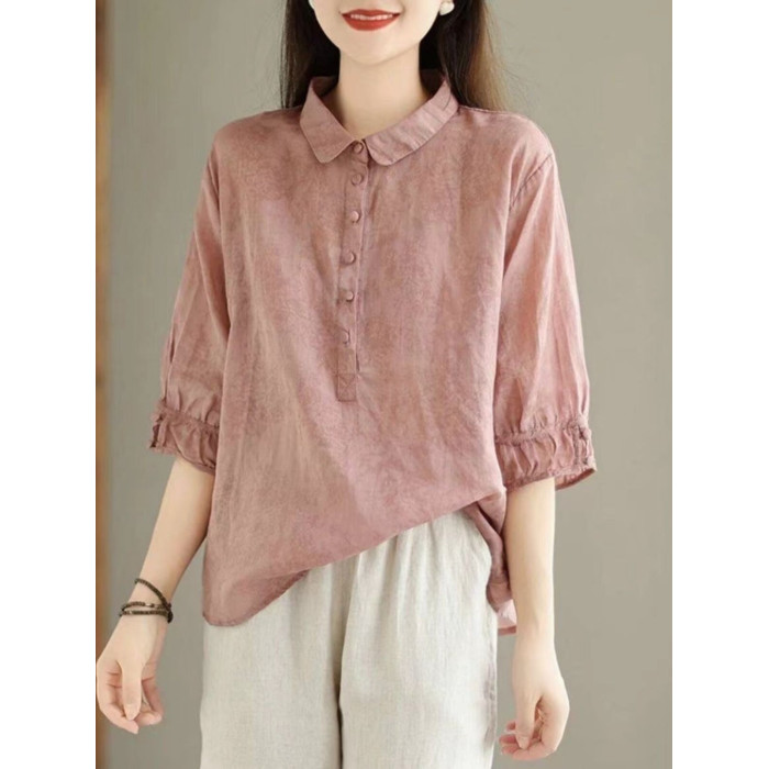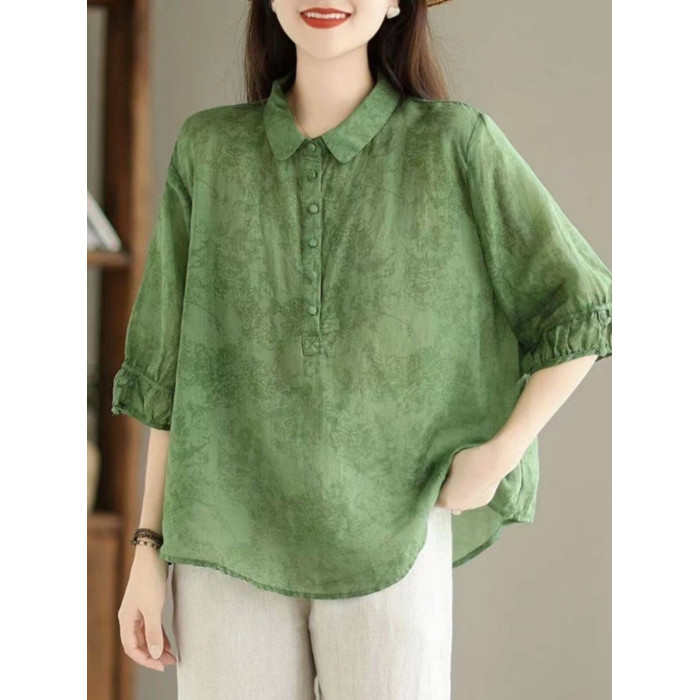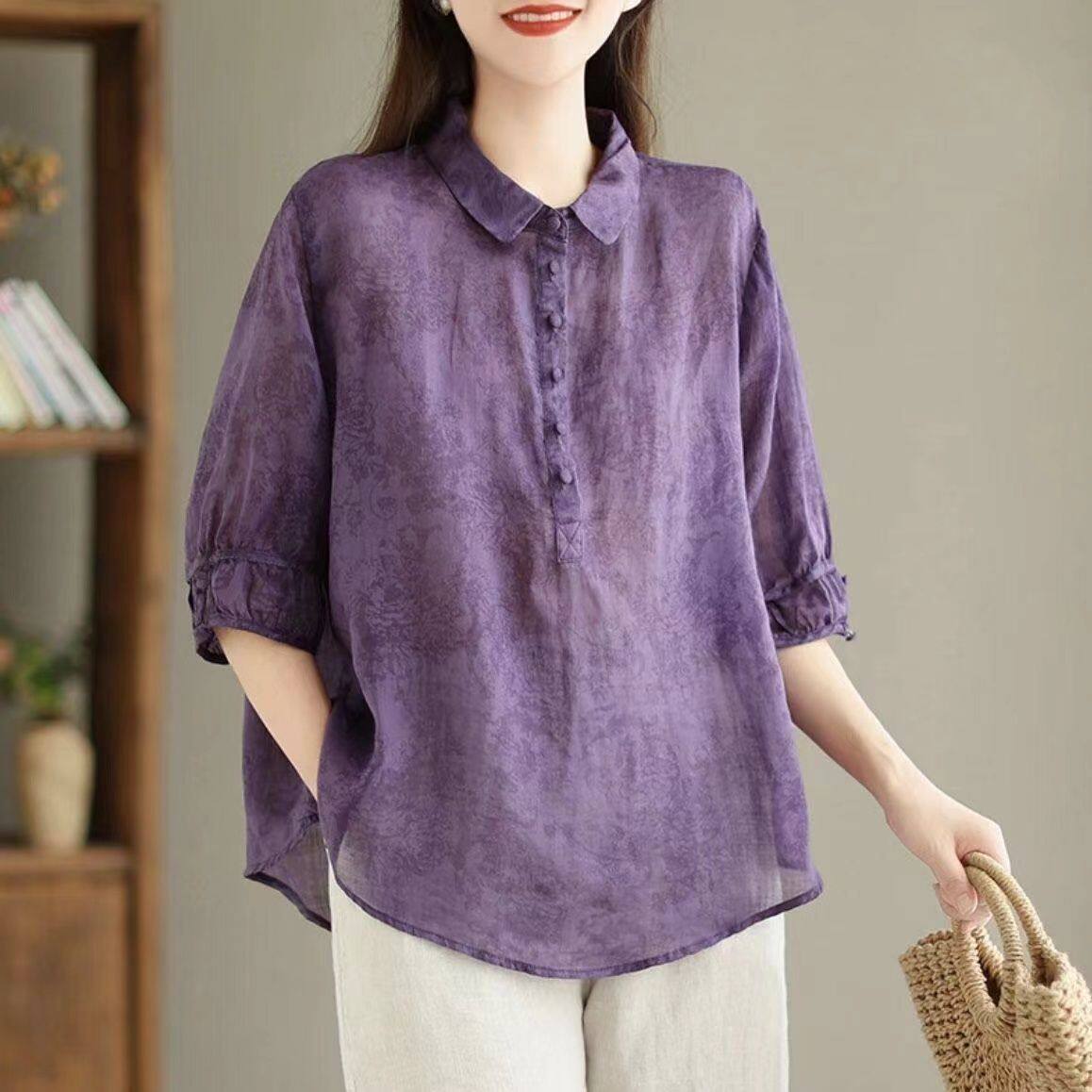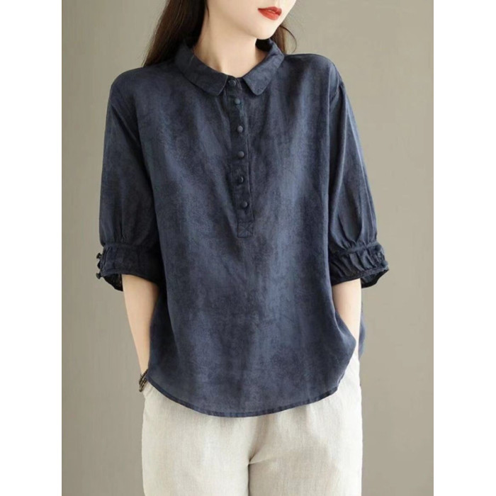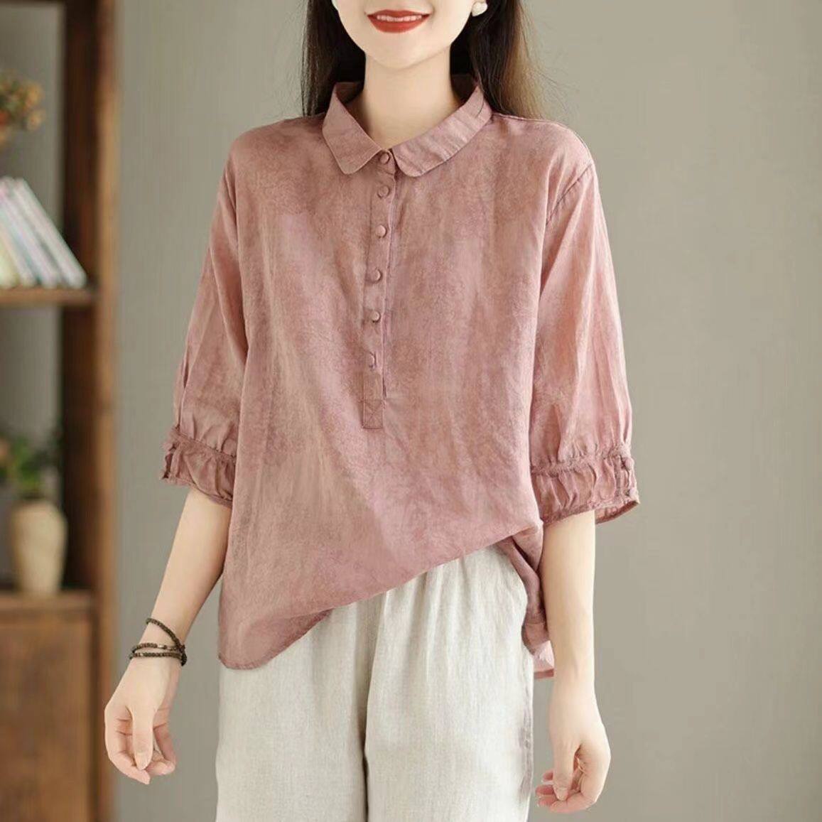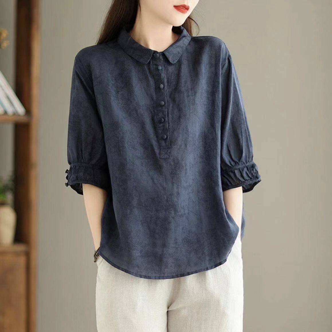 日系高級出口Polo領苧麻上衣女文藝印花寬鬆百搭棉麻襯衣