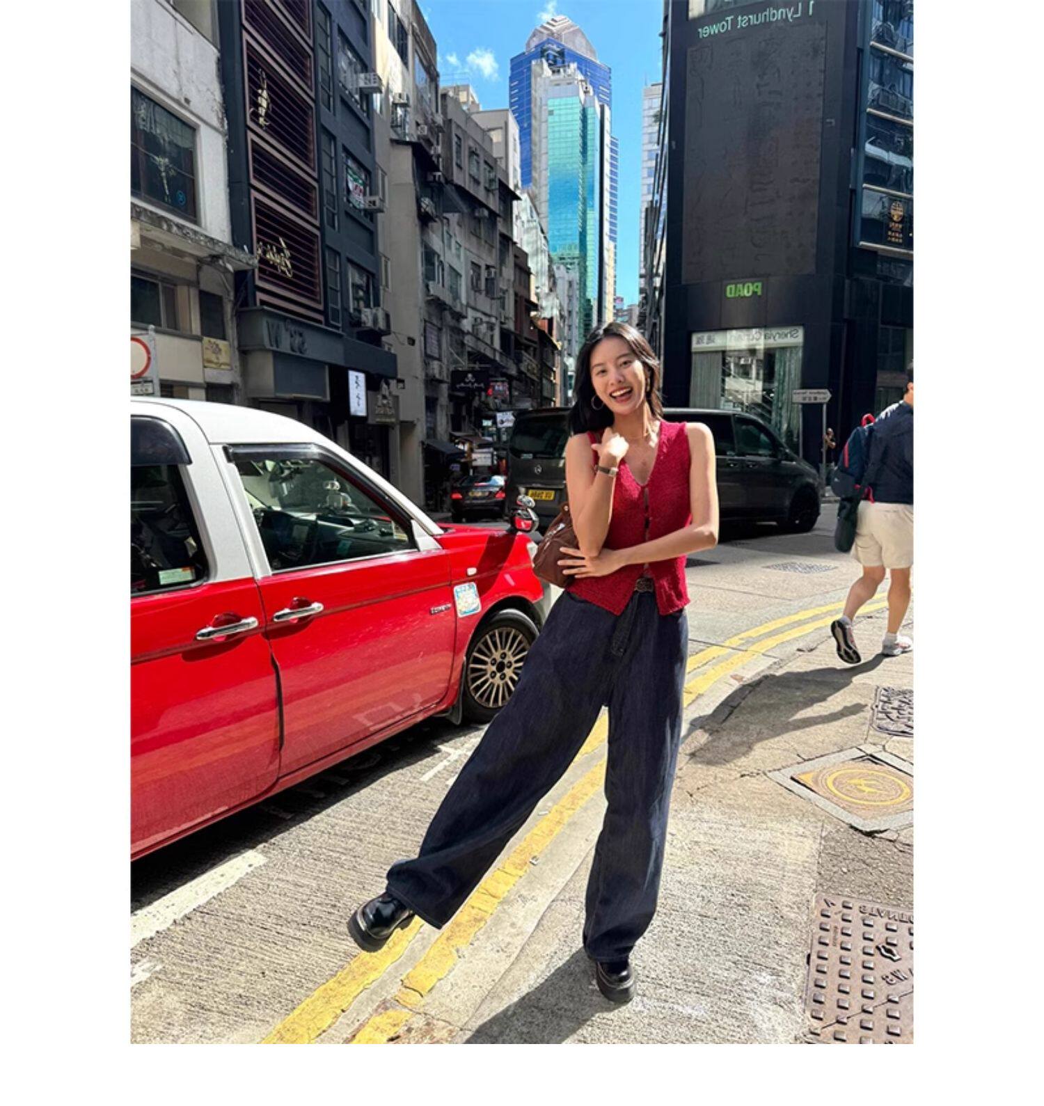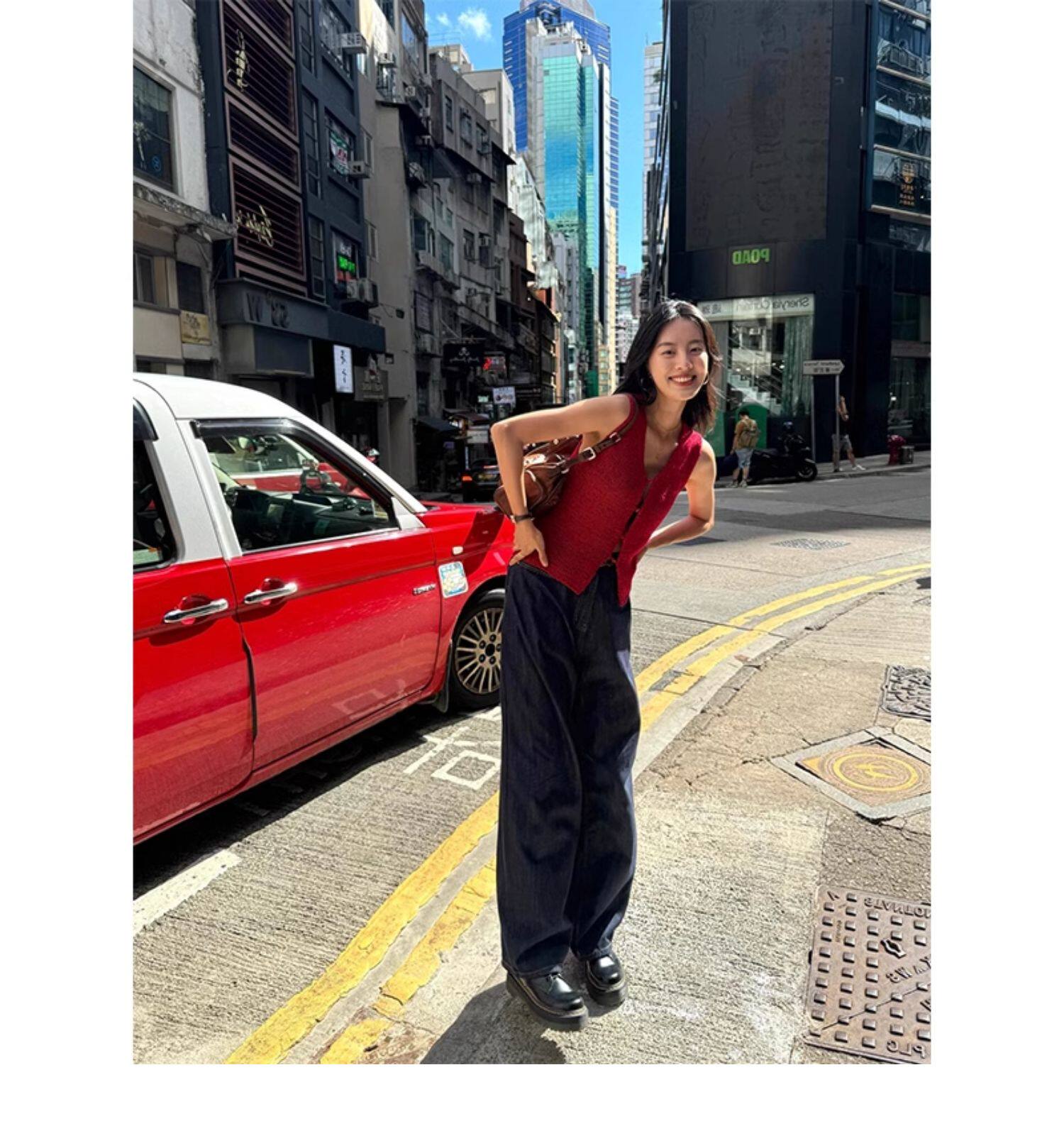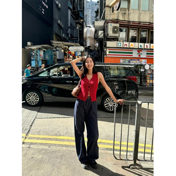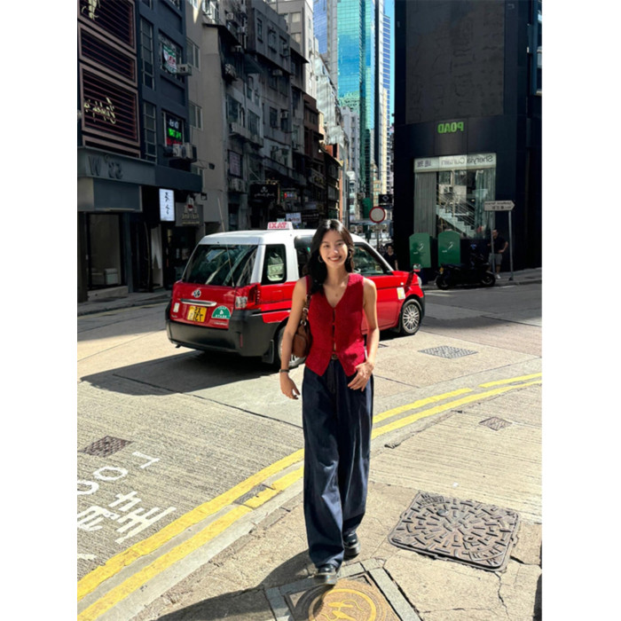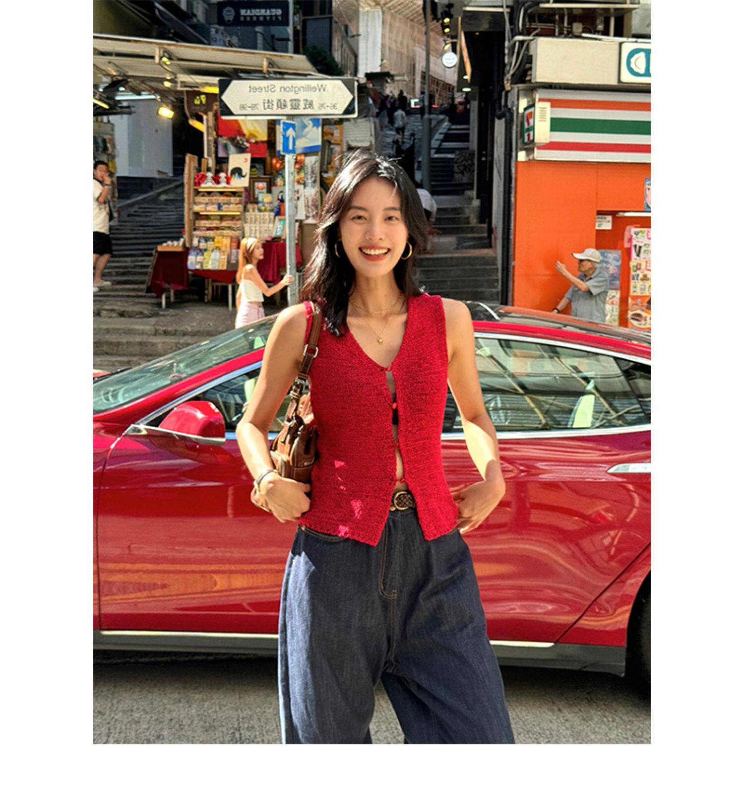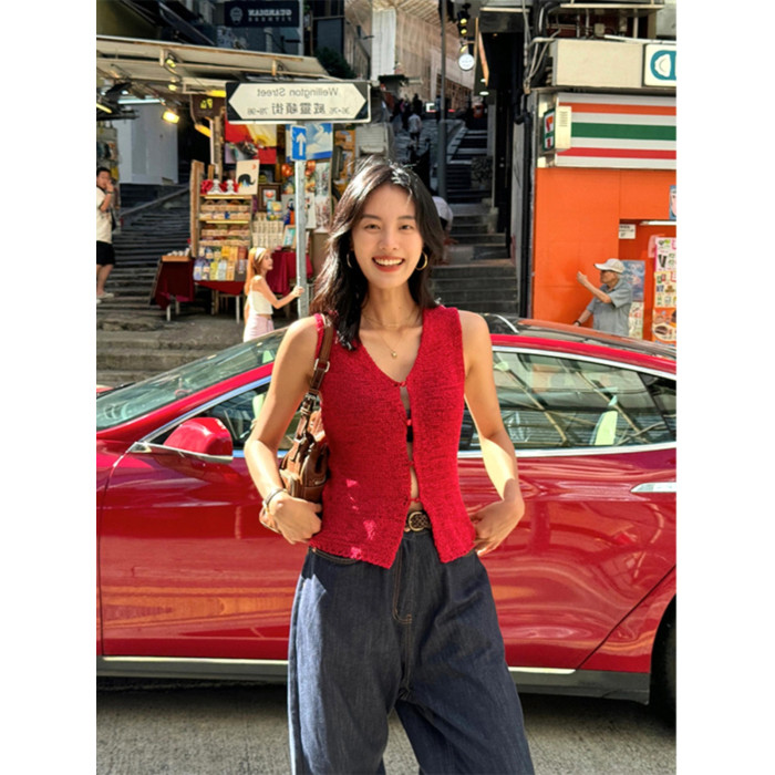 Turn right/陳大腿 氣質紅色V領針織背心馬甲女無袖內搭外穿上衣