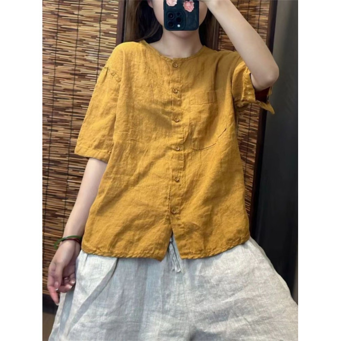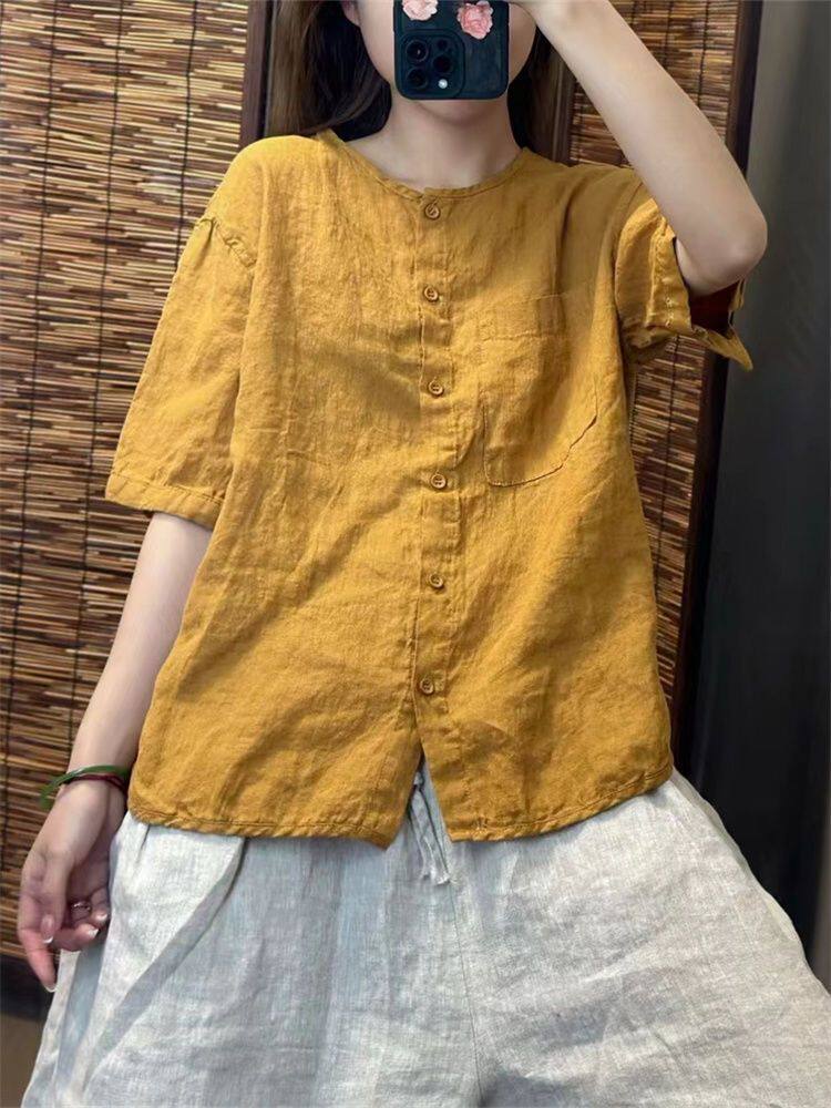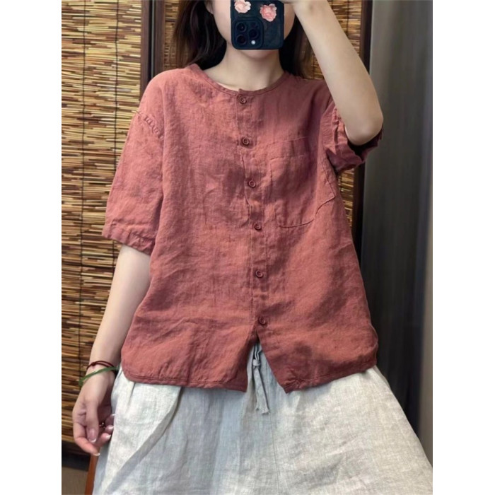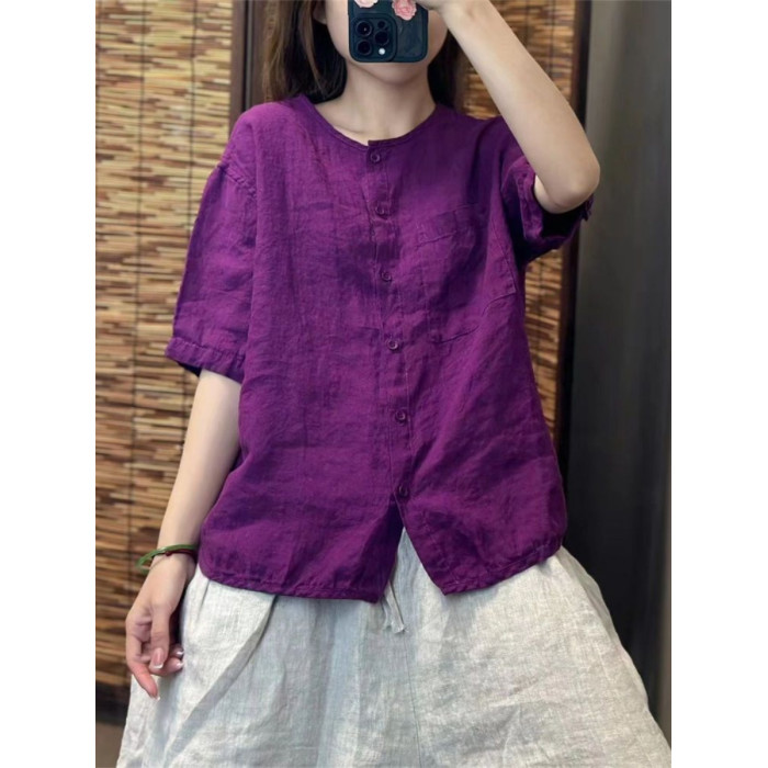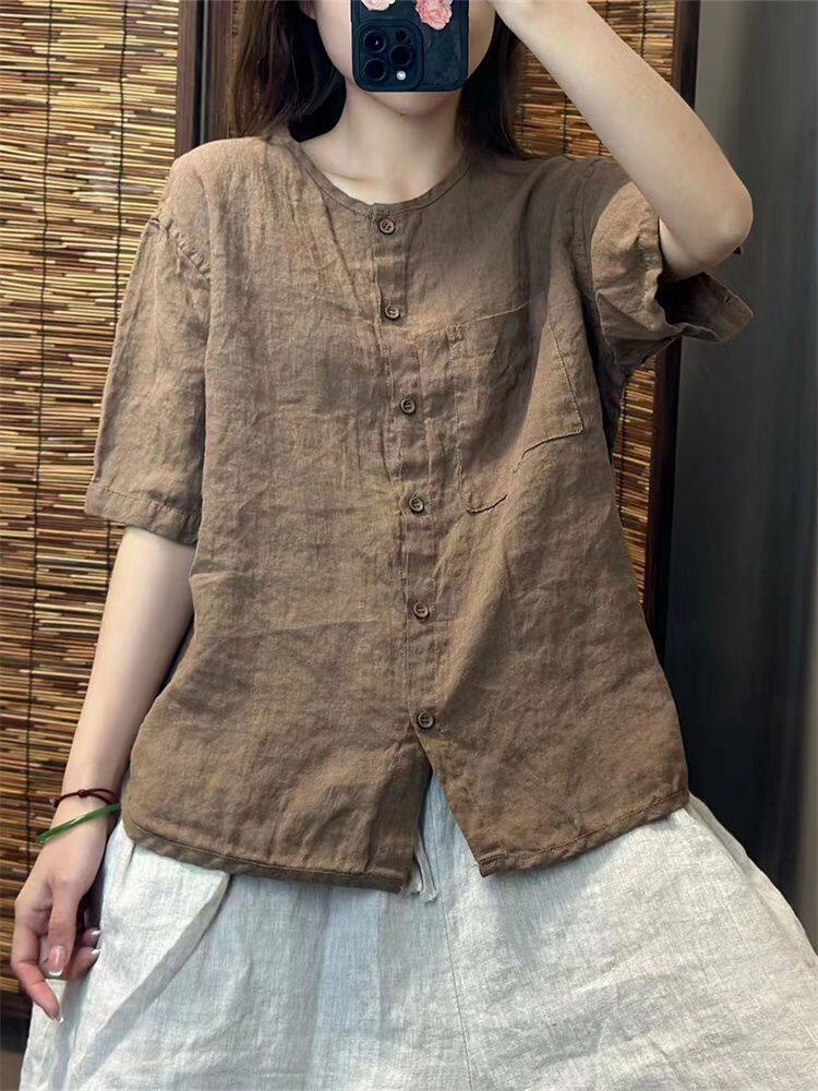 出口日單外單棉麻短袖襯衣女復古文藝寬鬆百搭圓領開衫上衣夏