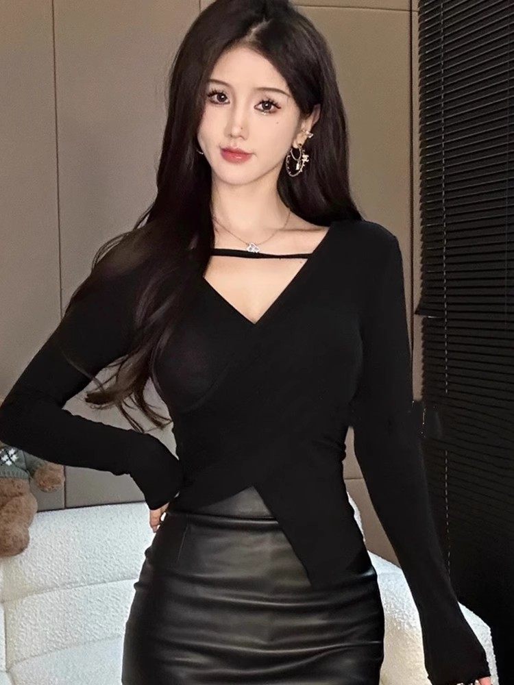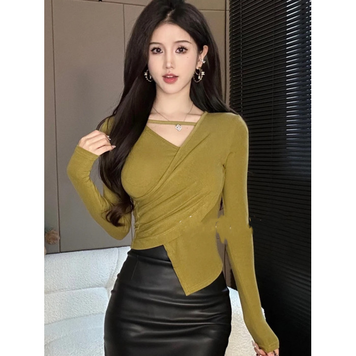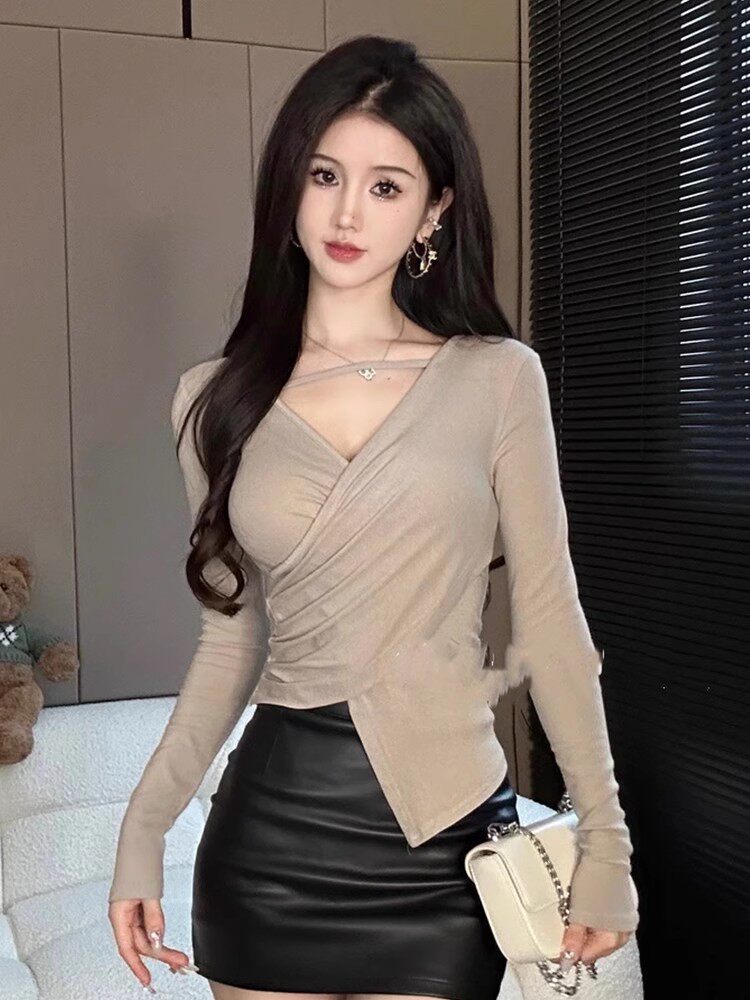 今年流行不規則長袖T恤女2025秋冬新款交叉V領修身顯瘦性感打底衫
